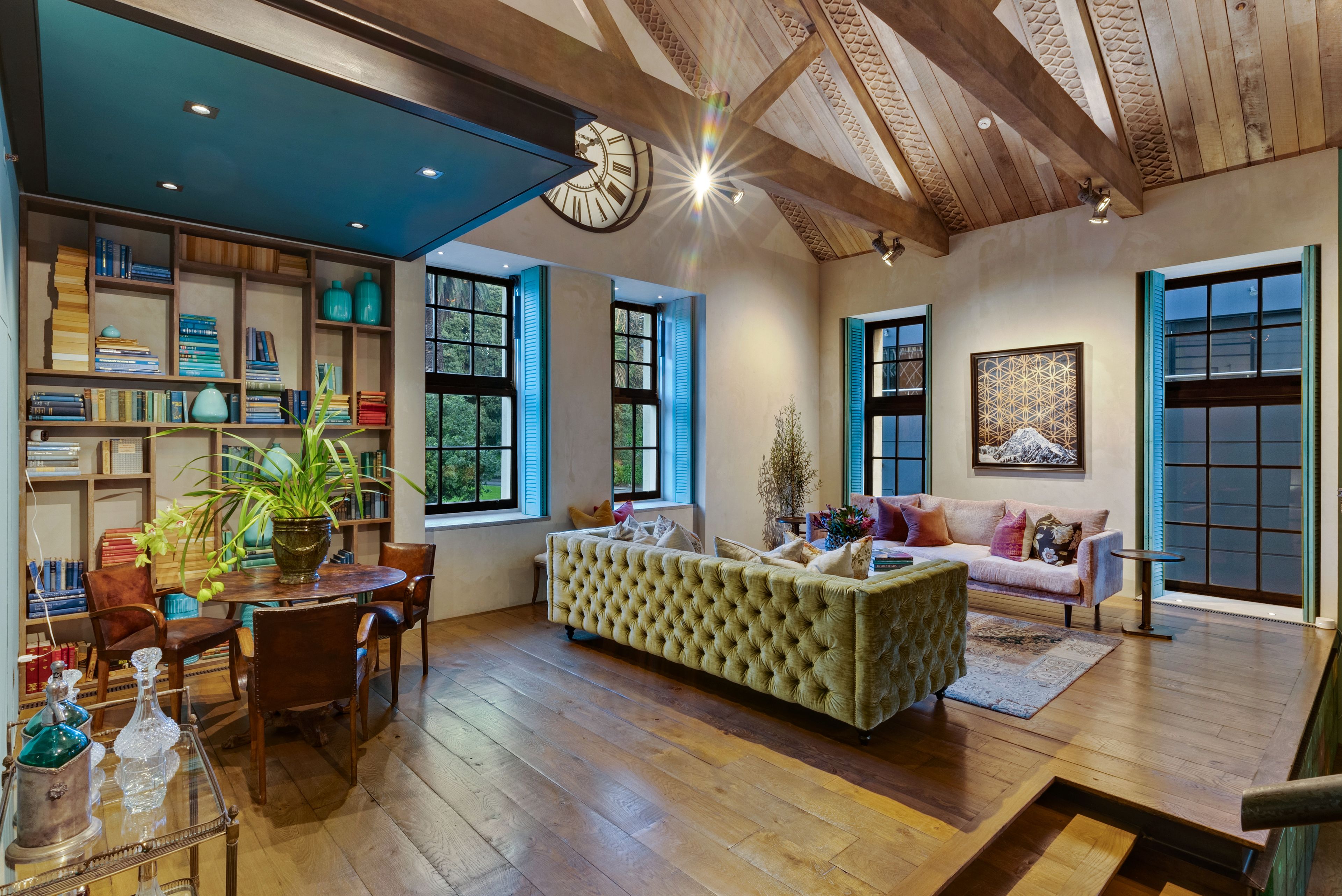 As brilliantly functional as it is unforgettably stylish, it features a striking open plan living and dining area with soaring raked timber ceilings, wide oak flooring, and a superior gas fireplace. The bespoke kitchen is replete with top-of-the-range European gas appliances as well as extensive custom cabinetry and scullery/laundry.