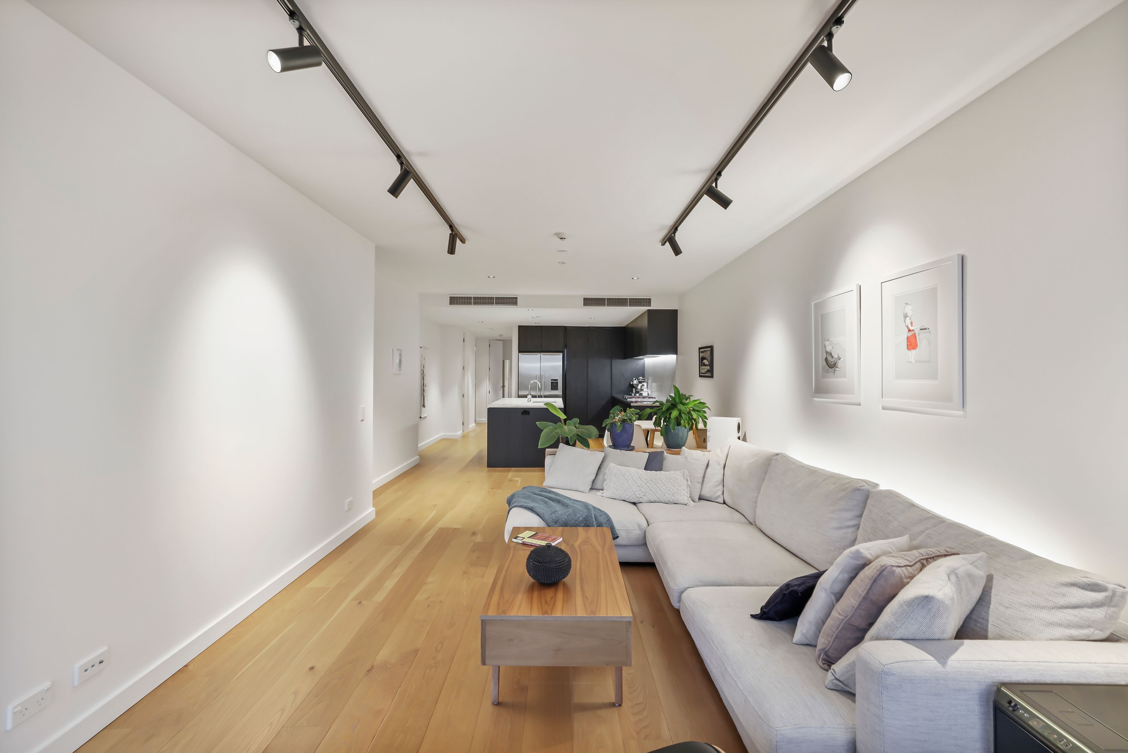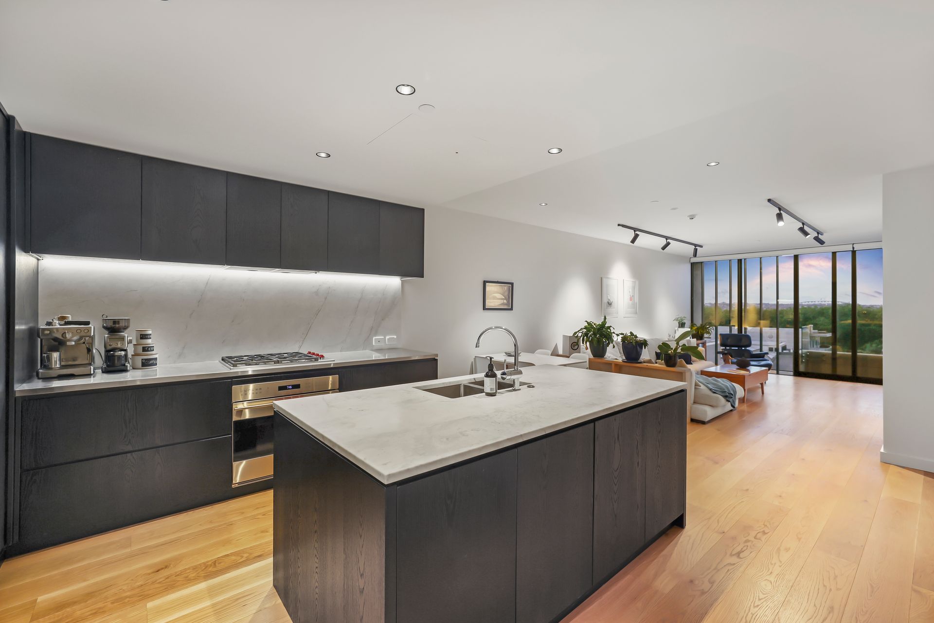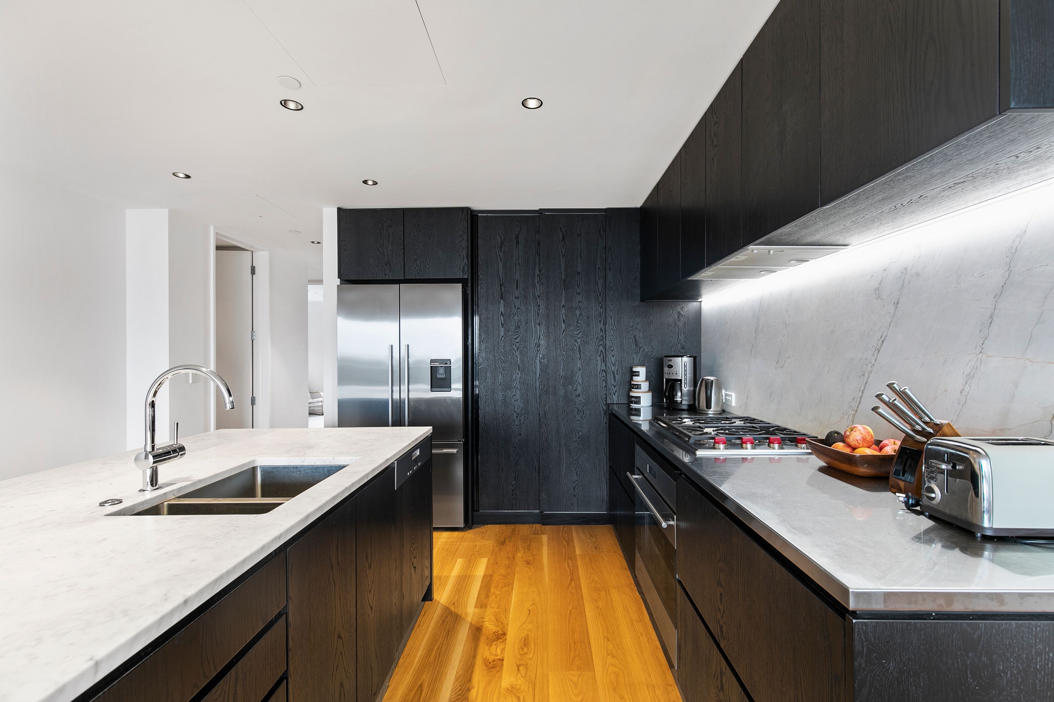 There is a streamlined kitchen equipped with stainless steel appliances and ample storage as well as a separate breakfast bar, perfect for entertaining.