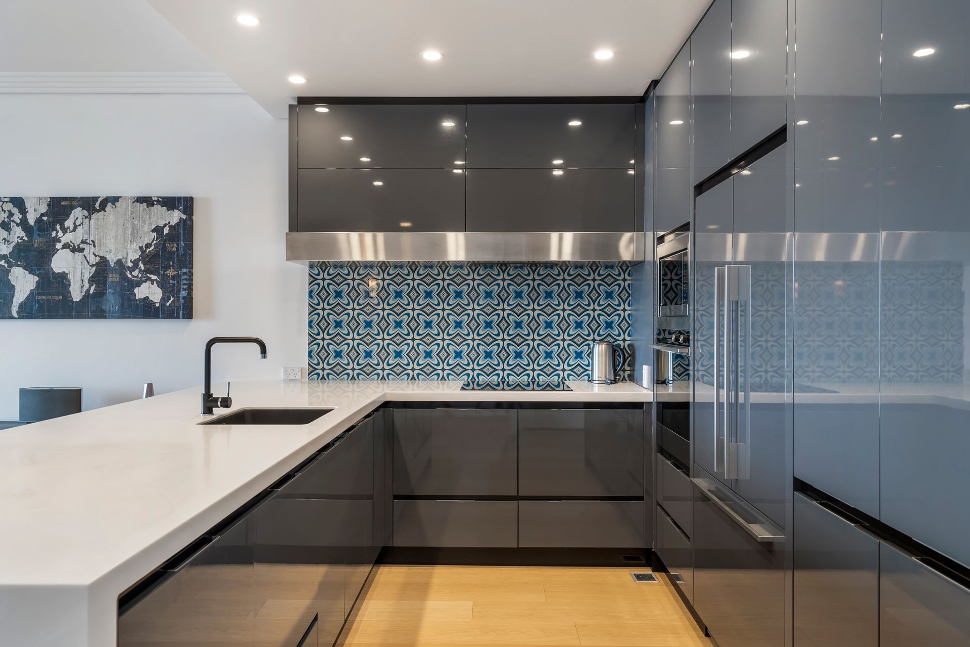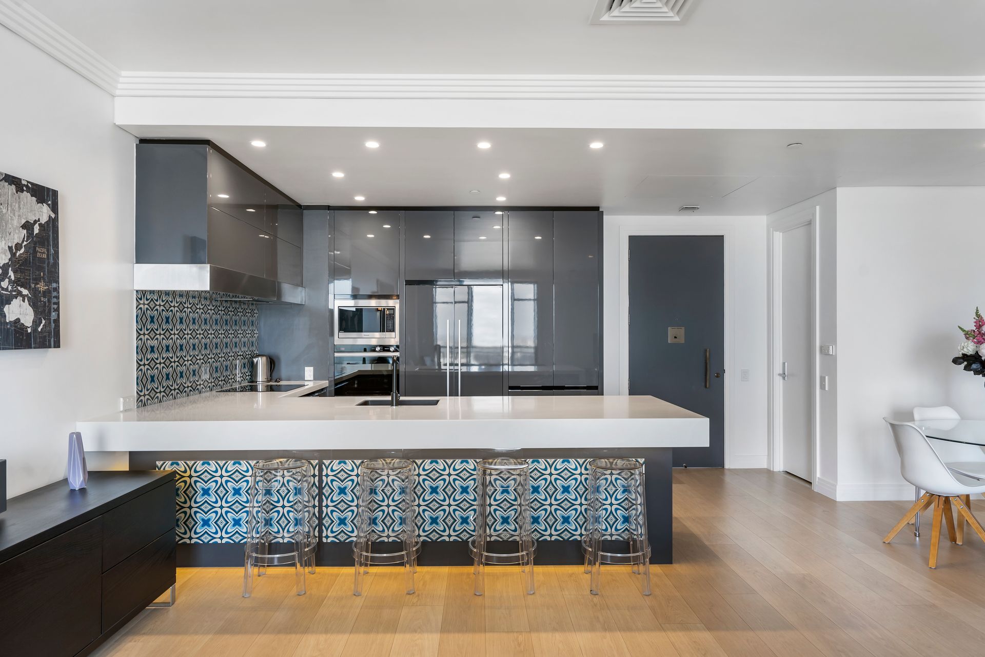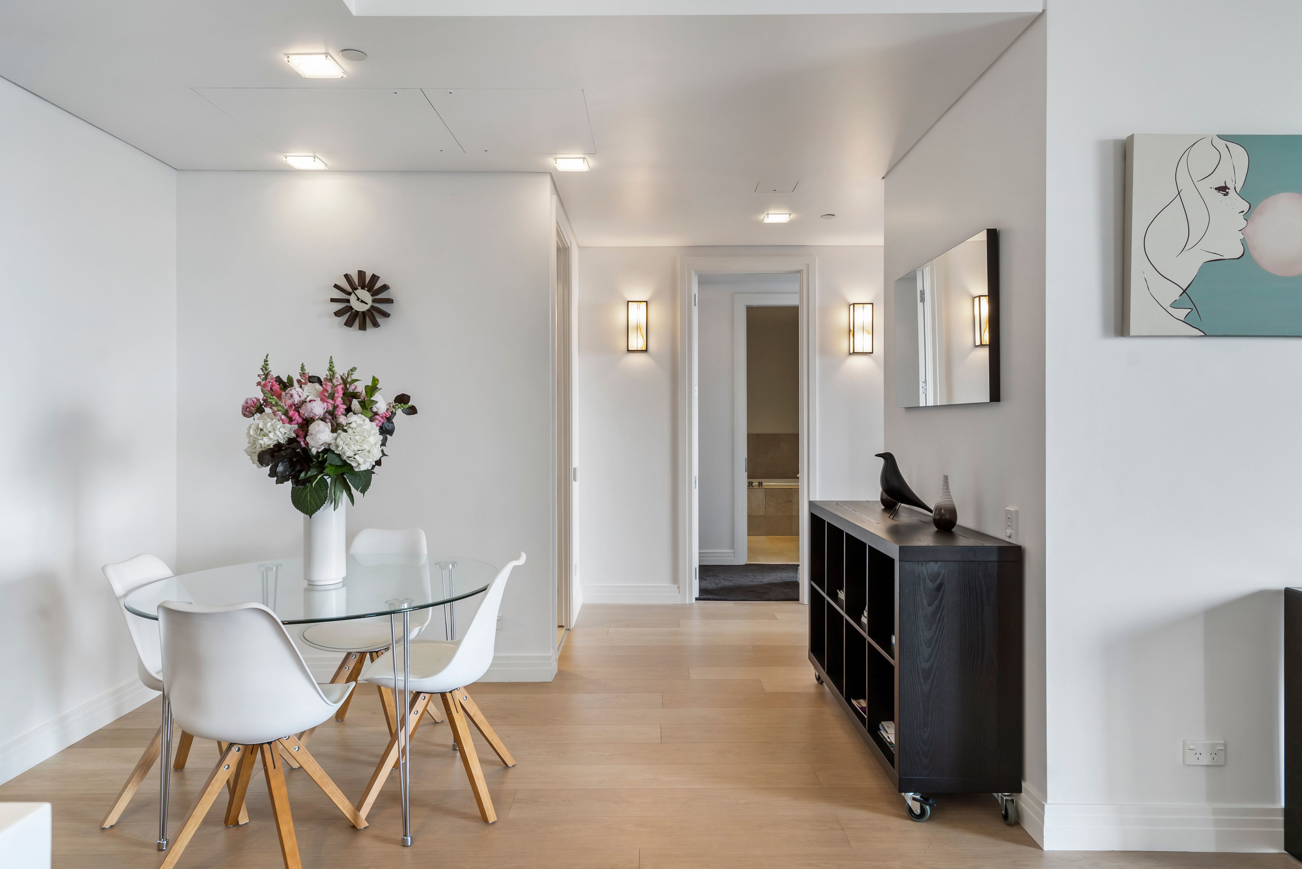 The main feature of this city residence is the stunning kitchen by award-winning designer Mal Corboy. Effortlessly functional and instantly eye-catching, the space extends into the spacious lounge area and adjacent balcony which is an ideal spot for a morning coffee.