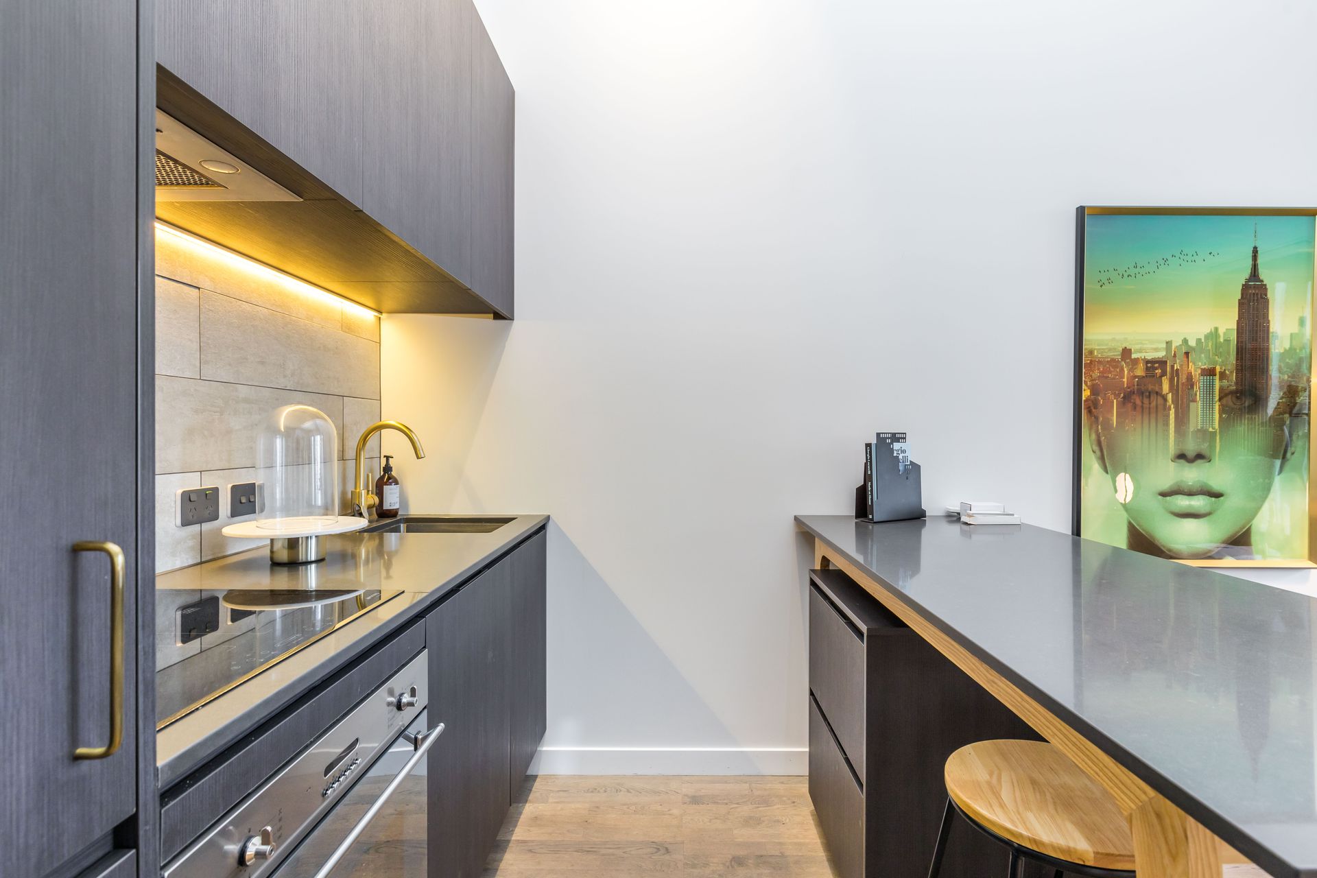 Kitchen is well spec'd - induction cooktop, large marble finish splashback, deep sink and brushed gold tap ware. Moveable love island kitchen bench perfect for informal entertaining.