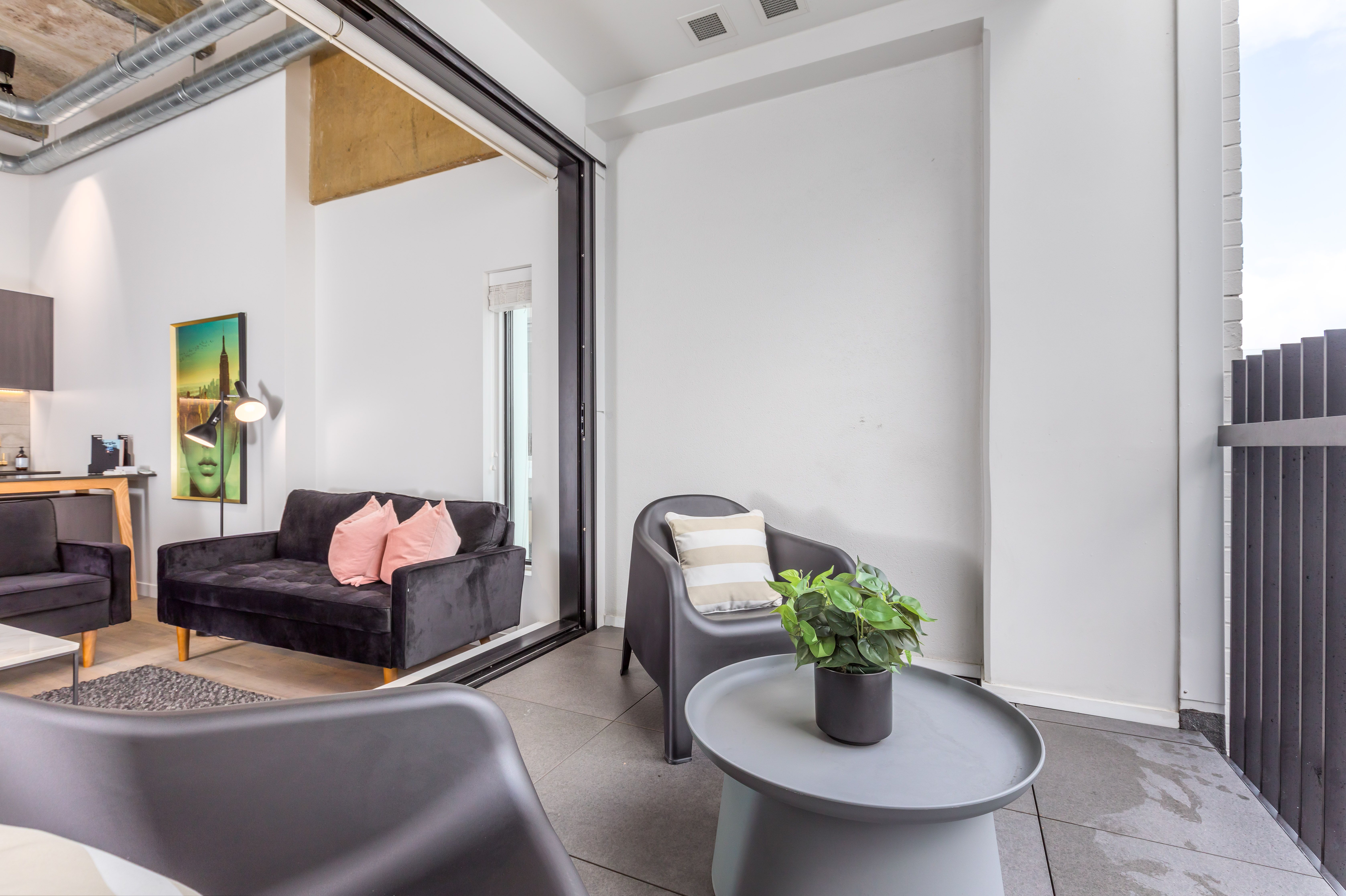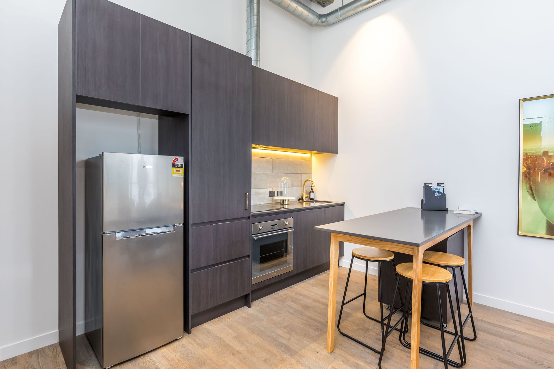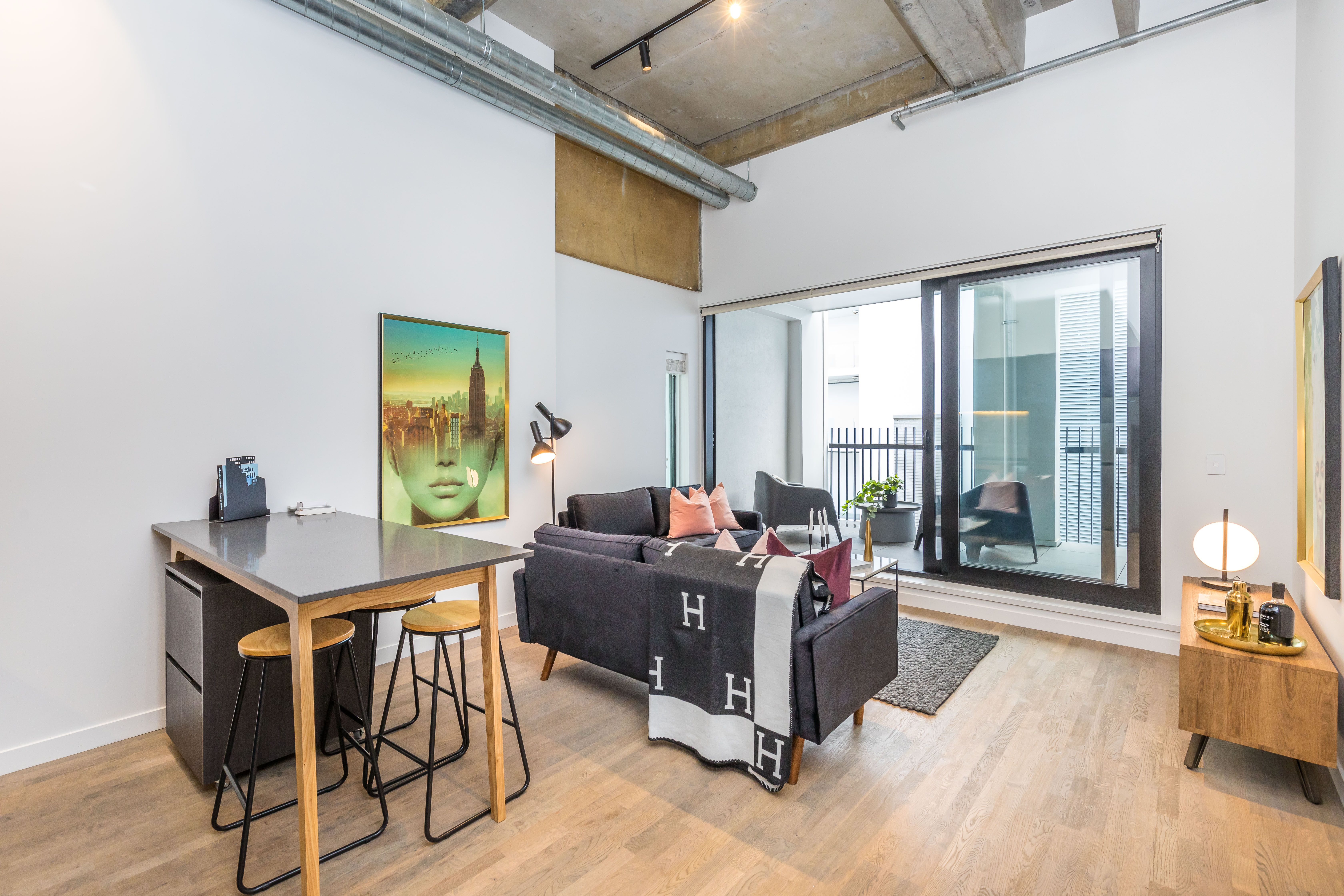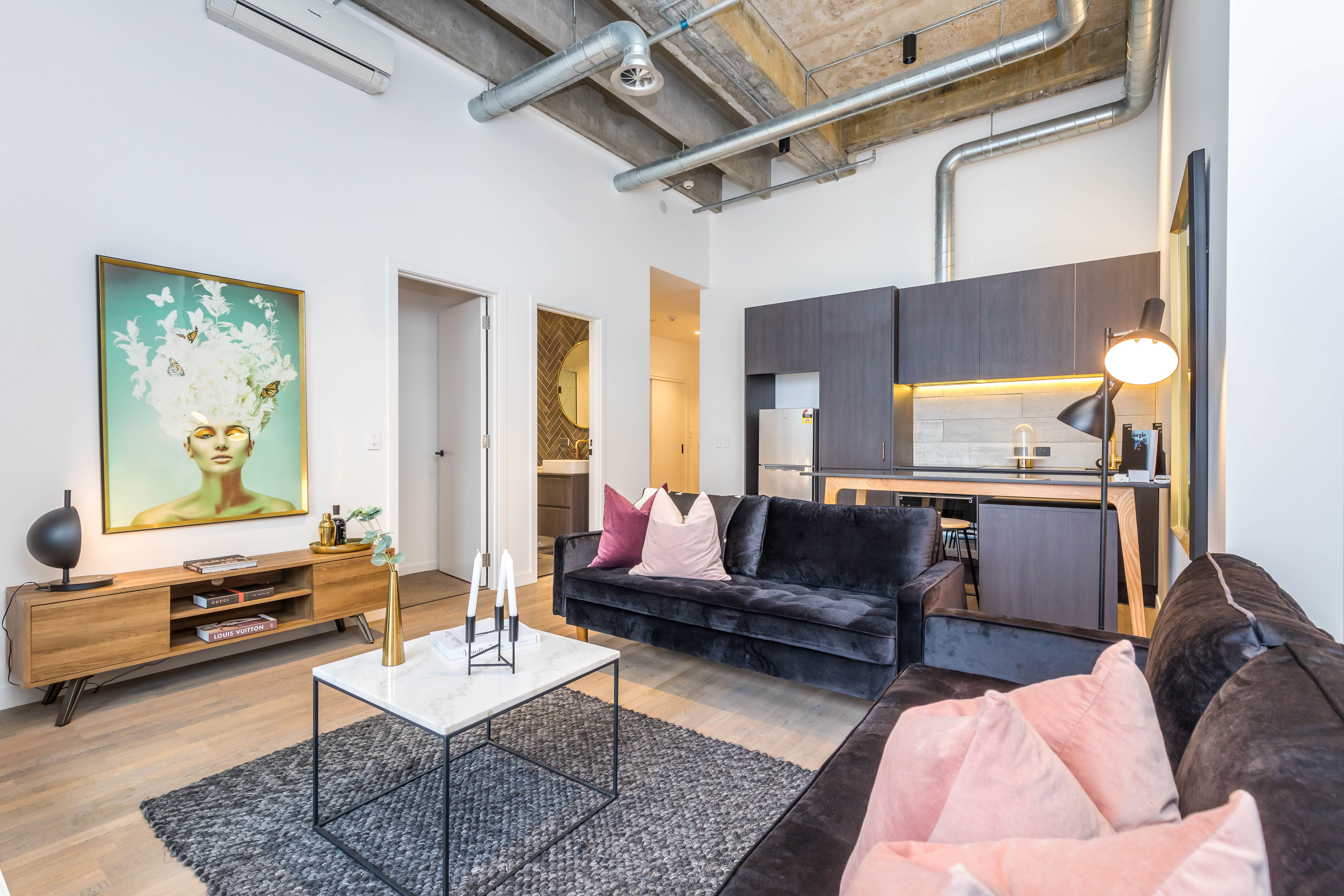 The soaring, bare concrete ceilings, exposed ducts and pipes and track spotlighting create an uber cool industrial feel.