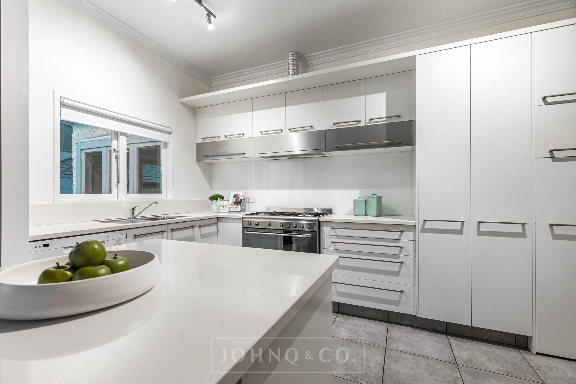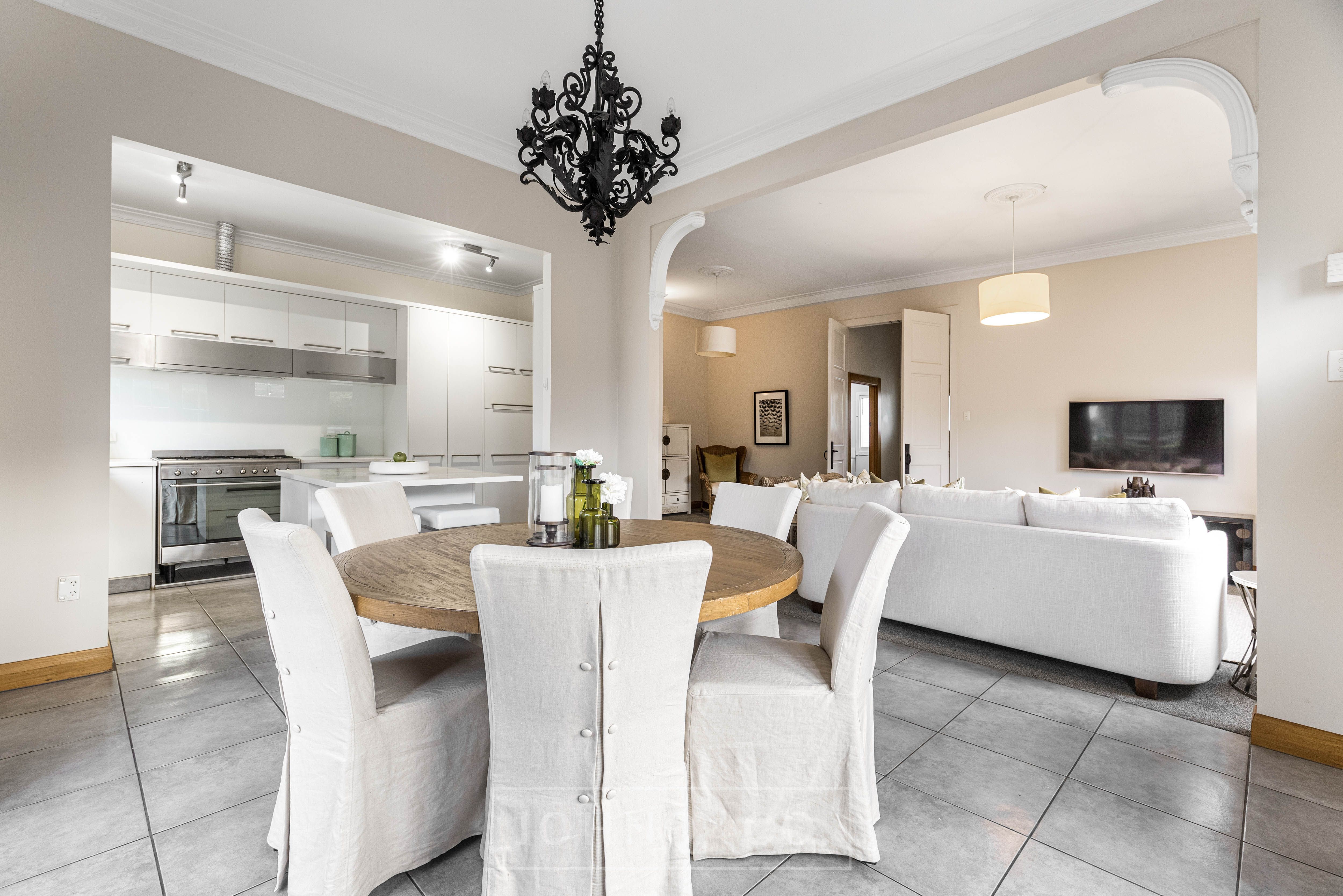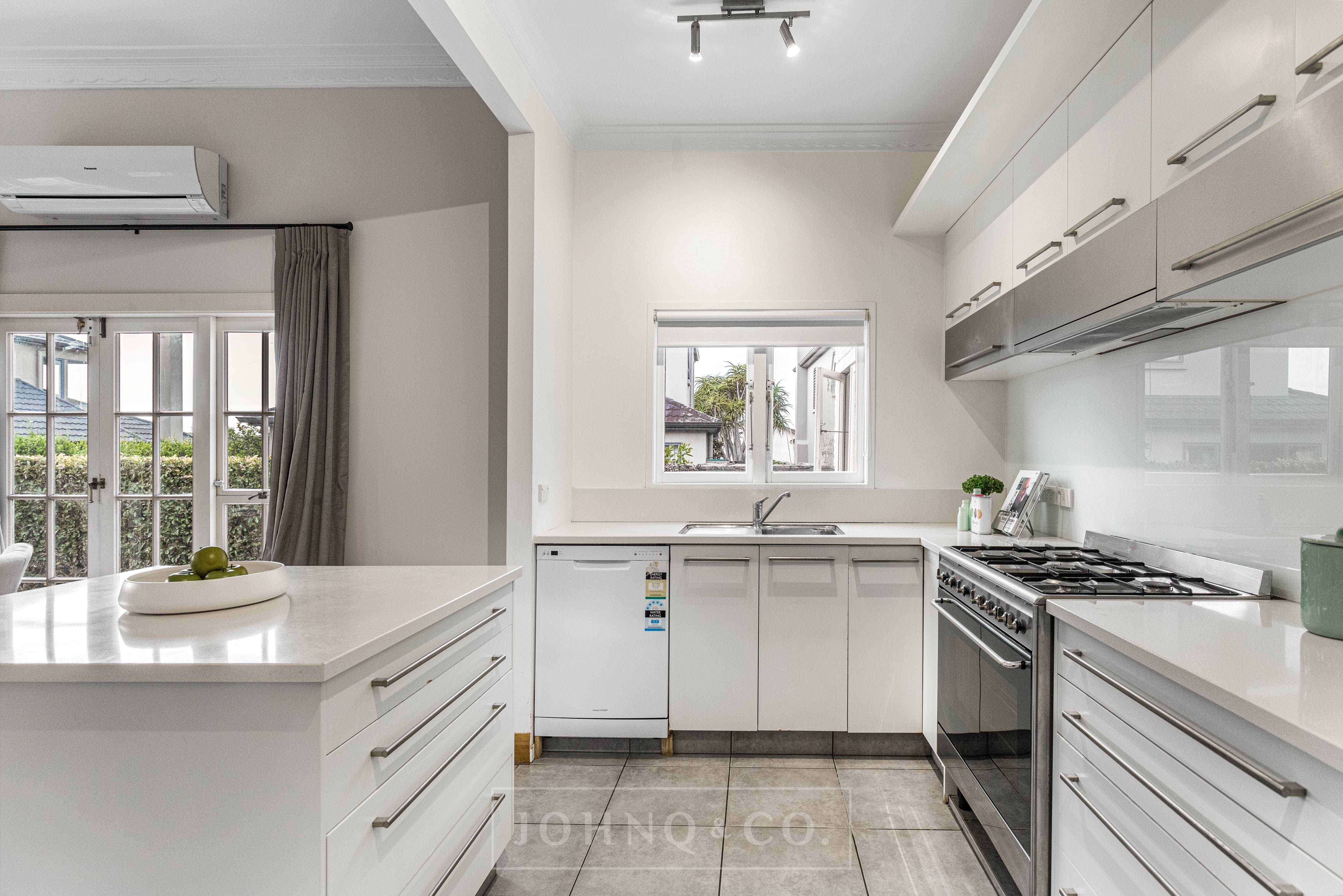 - The large, modernised kitchen with abundant storage, stainless steel appliances with gas cooking and composite stone benchtop including a sociable island hub.