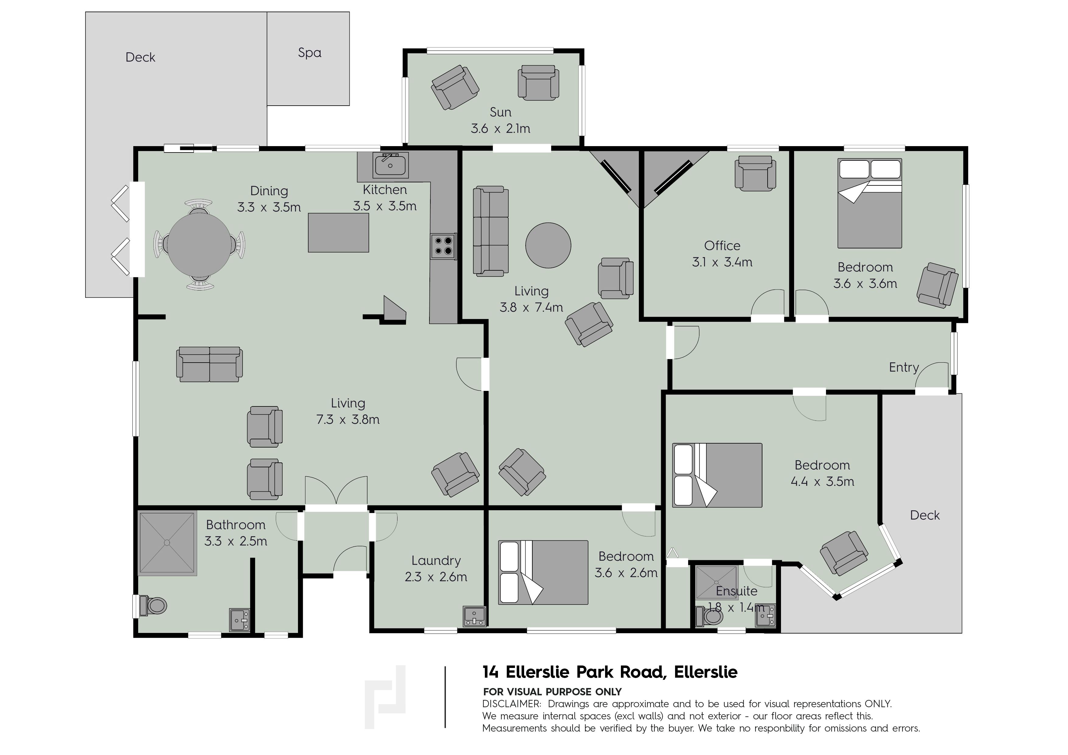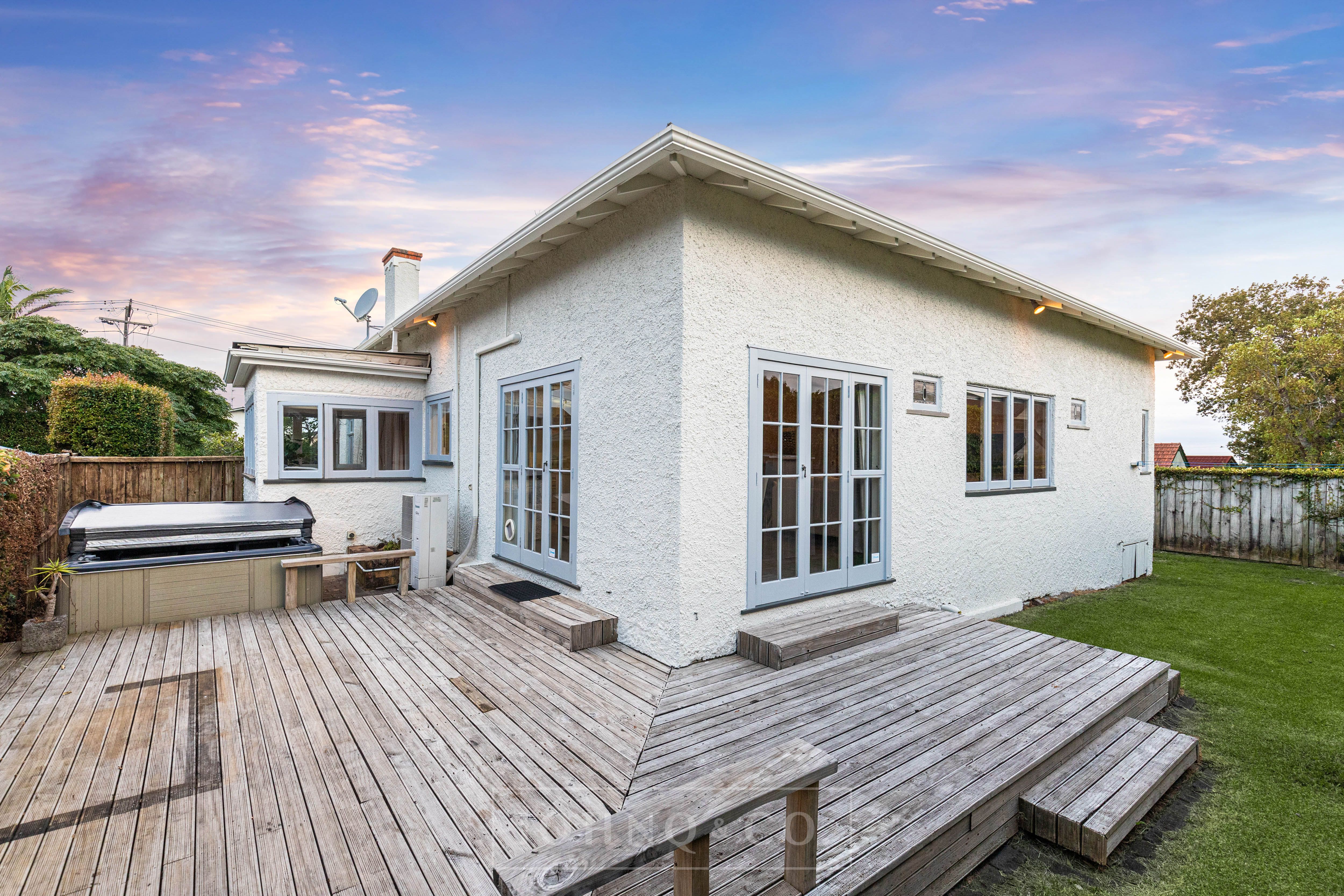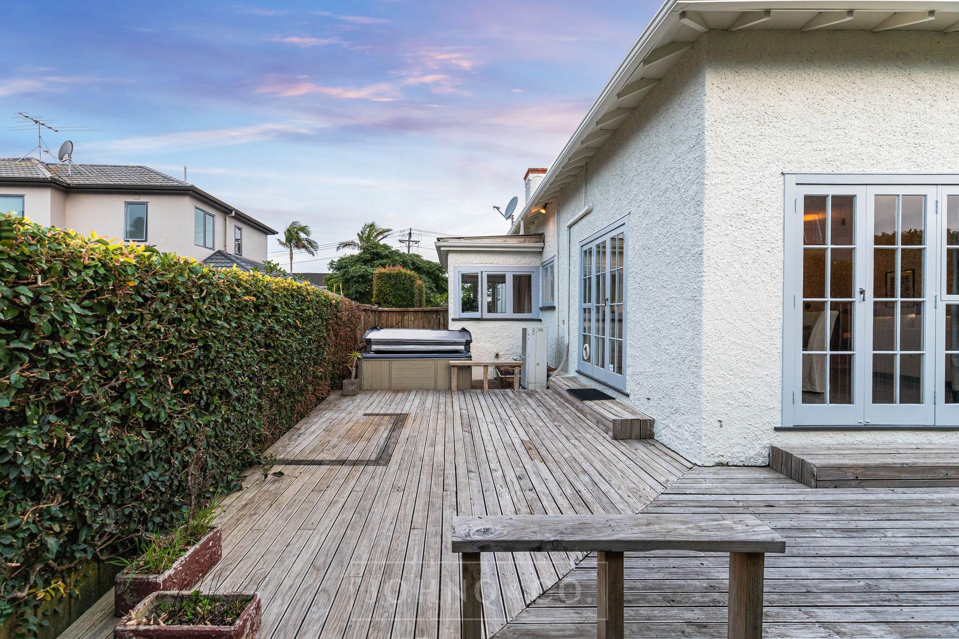 - Easy flow through two sets of French doors to move the party outdoors onto the sunny deck where there's ample room for the spa pool and barbecue