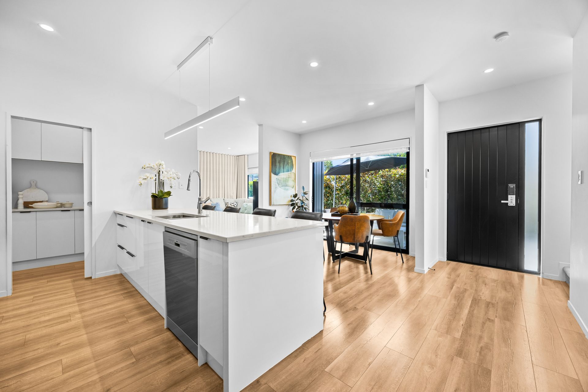 From the moment you step inside, the home opens into a light-filled, open-plan living zone where clean lines and quality finishes set the tone. The designer kitchen sits at the heart of it all, complete with a generous island, premium Smeg appliances, and a tucked-away scullery, keeping everyday mess out of sight while maintaining a sleek, uncluttered space.