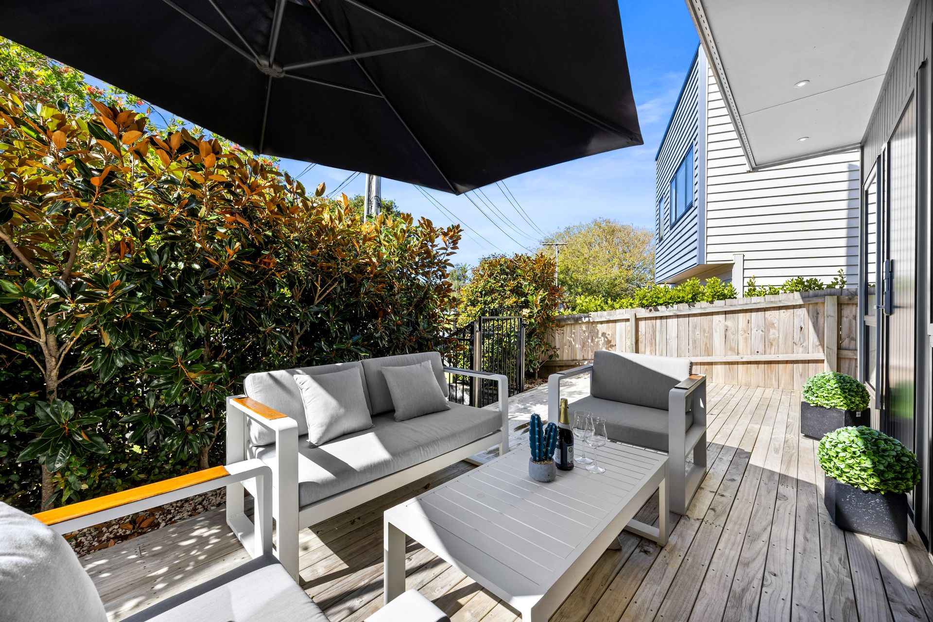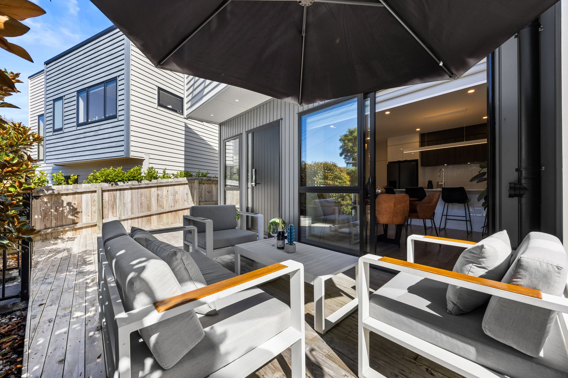 The indoor-outdoor flow is seamless, with sliding doors leading to a sun-soaked deck, a private setting perfect for entertaining or unwinding in style.