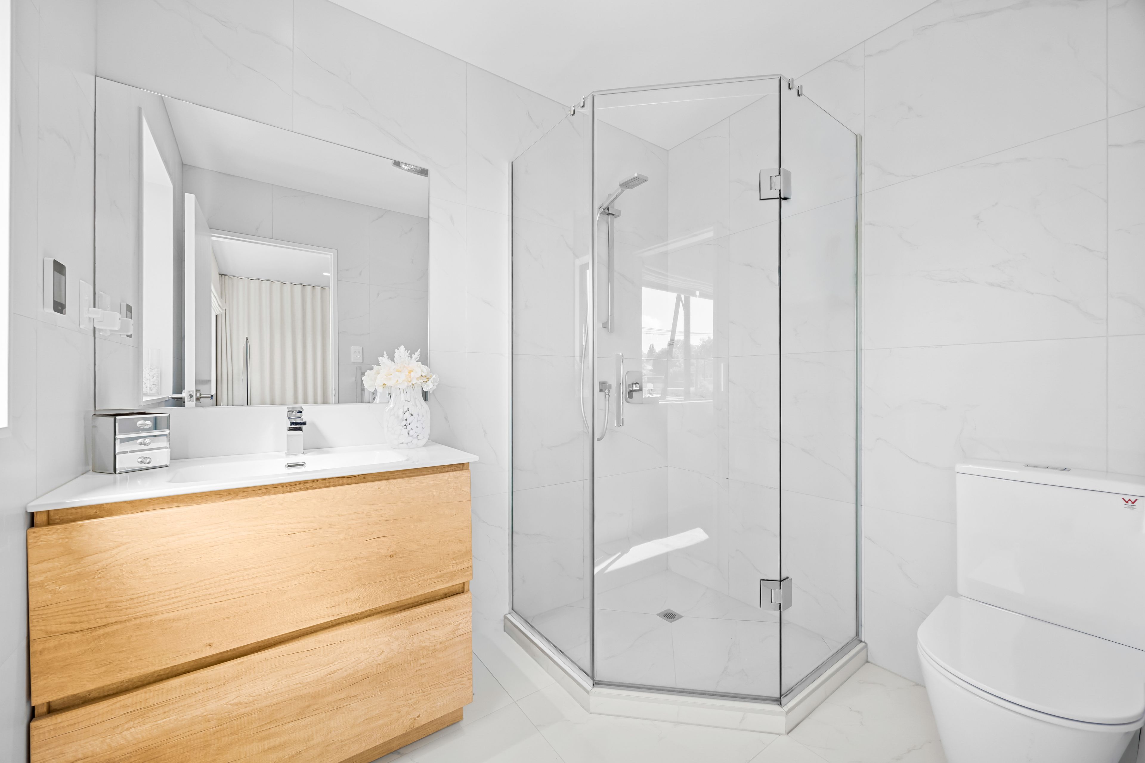 Upstairs, the accommodation is well-considered, offering space for families or professionals alike. The master suite feels like a true retreat, complete with a walk-in wardrobe and ensuite, while additional bedrooms are complemented by a well-appointed main bathroom. Both bathrooms feature underfloor heating, adding a subtle touch of comfort and everyday luxury.