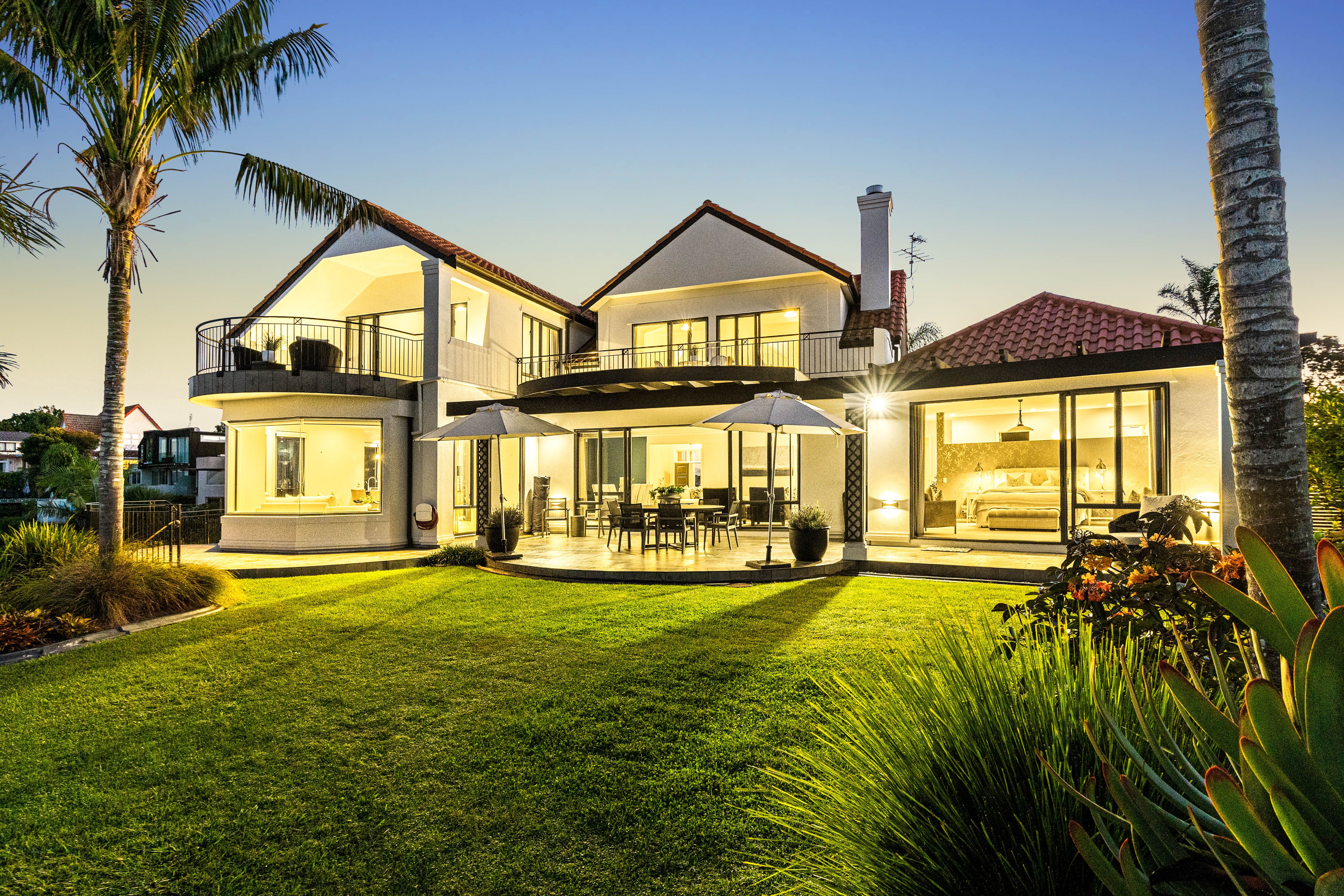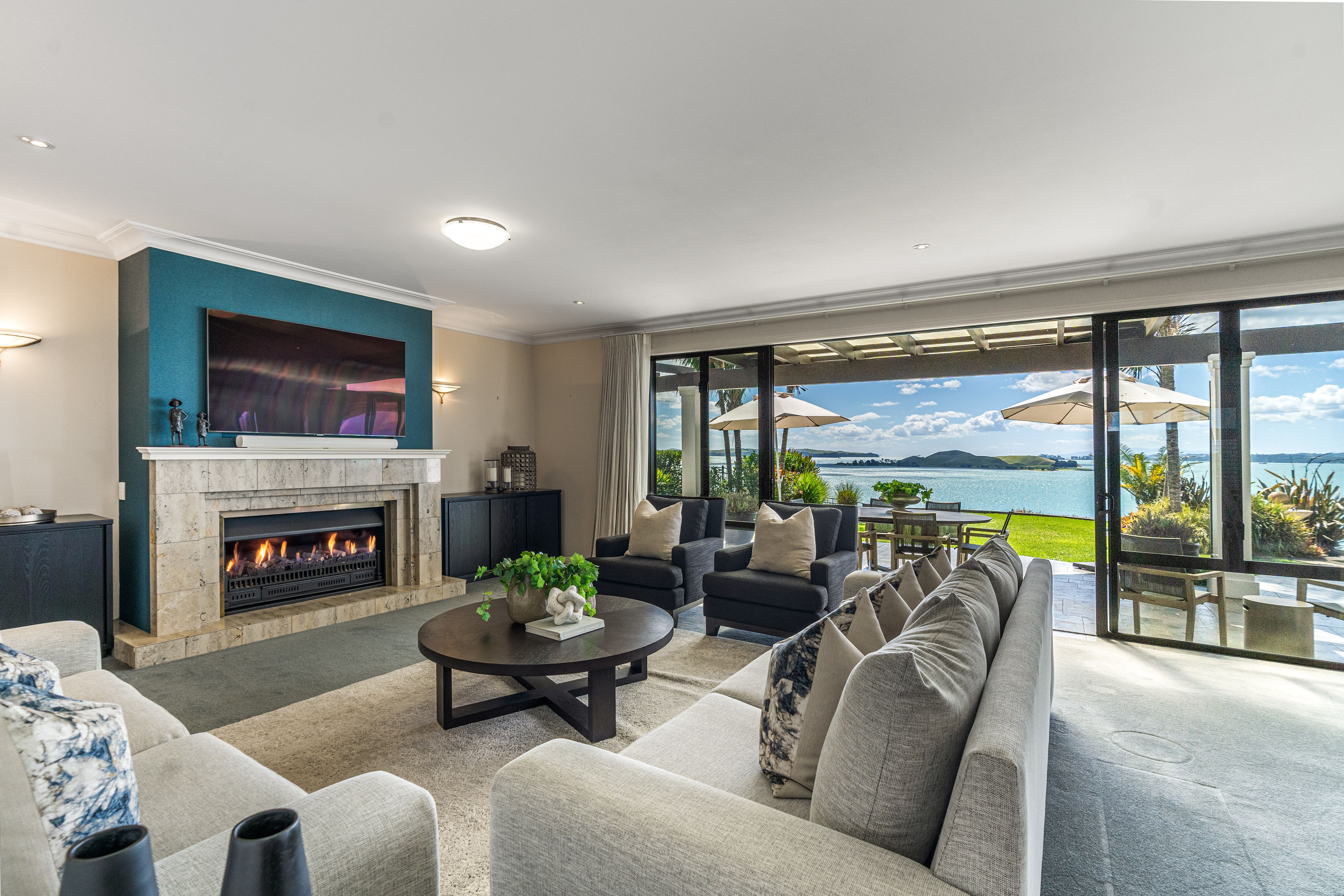 The ground floor includes a palatial master suite, dressing room and fully tiled ensuite with bath, and large sliders opening onto the terrace, picture-perfect lawn and uninterrupted water views. A large media room or optional 5th bedroom completes the ground floor, while a wide stairway leads upstairs to further slumber zones all with balcony access and views. One - a second master bedroom has walk-in dressing room and spacious ensuite as well as it's own, private balcony enjoying grandstand views. A guest powder room, sizeable laundry and extensive storage caters for busy households.