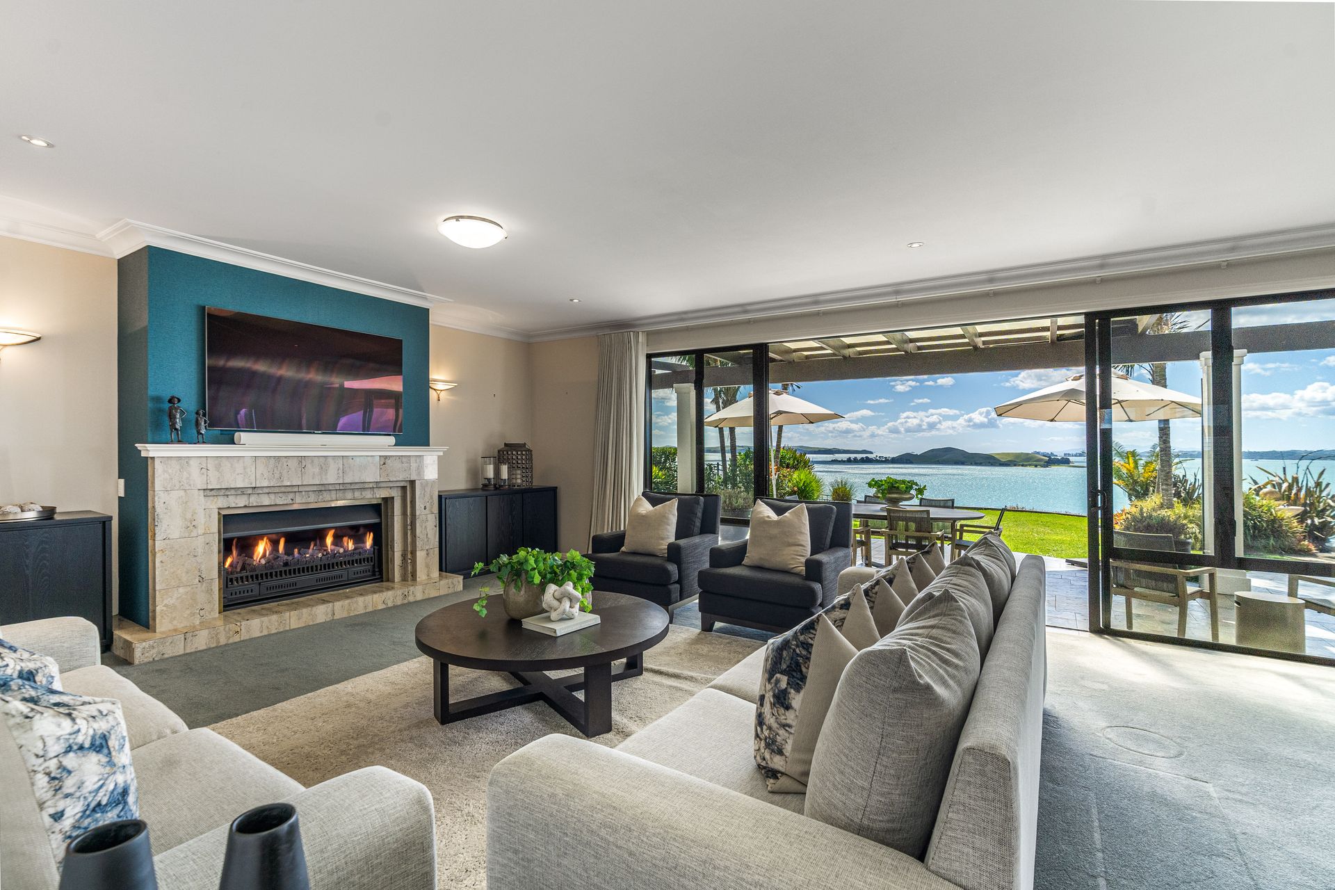 Sophisticated interior decor with bold accents defines the 437 sqm layout with entrance hall stepping up to living areas with a huge open plan lounge, statement fireplace and dining zone flowing onto a covered alfresco terrace with spectacular outlook. A modern kitchen aptly reflects marine colours with stainless steel appliances and scene stealing corner window. Another more casual lounge is integrated here with sunlight flowing in through a picture window and has terrace access also.