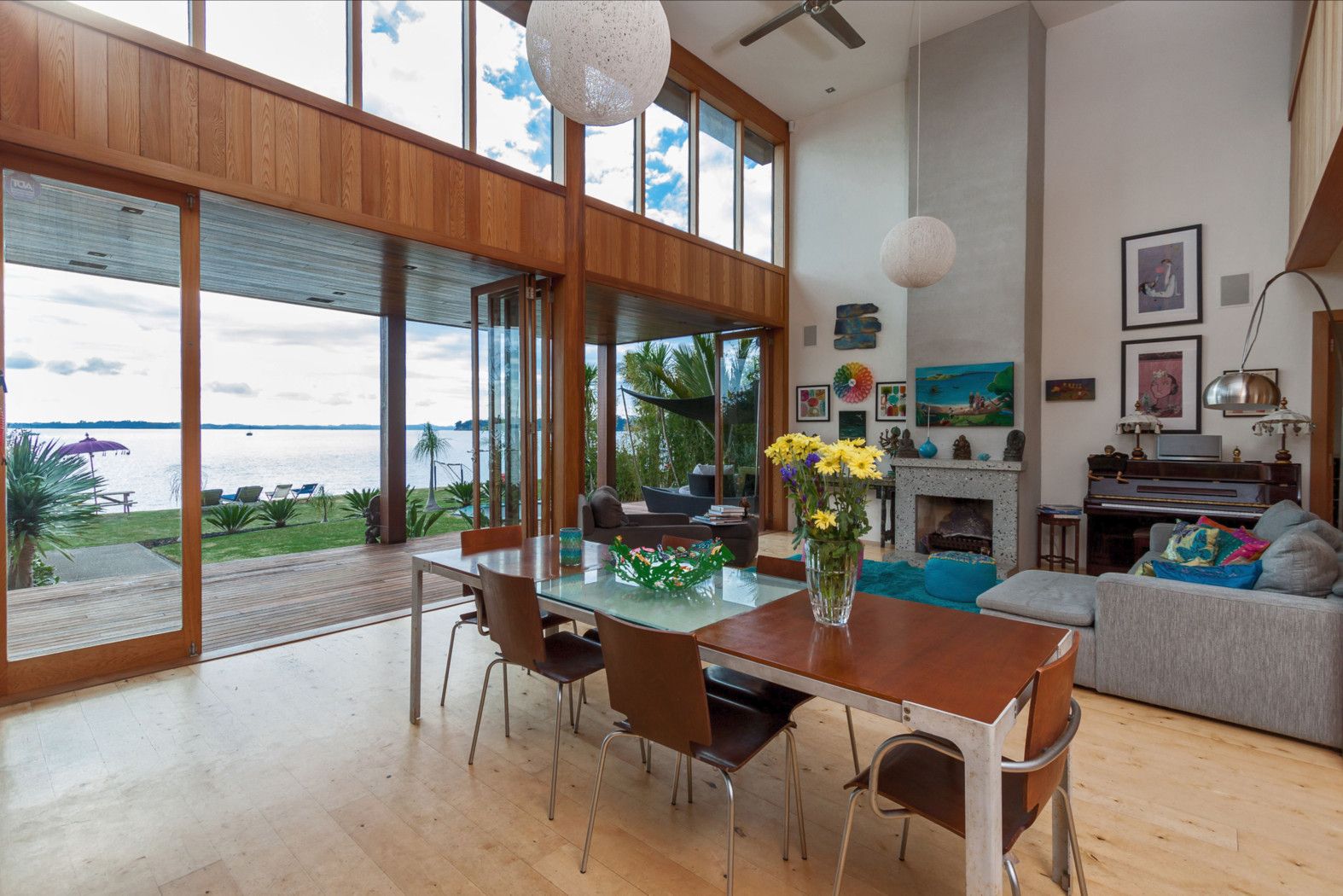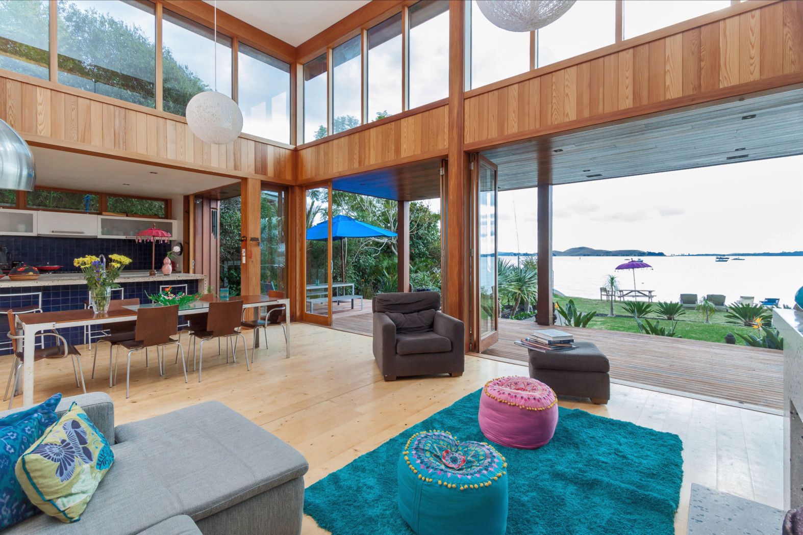 Clean lines and generous voluminous spaces make this beautifully designed house a sublime tranquil home. The brief to the architect was to create an all-natural eco-house on this beachfront site with sea views as far as the eye could see. And that is just what Nicholas Stevens, one of New Zealand's foremost architects, has achieved. Beautiful pale blond cedar is used extensively throughout the home. The rich grain is complemented by the natural light which floods in through the huge windows and doors which open up the entire front to the water.