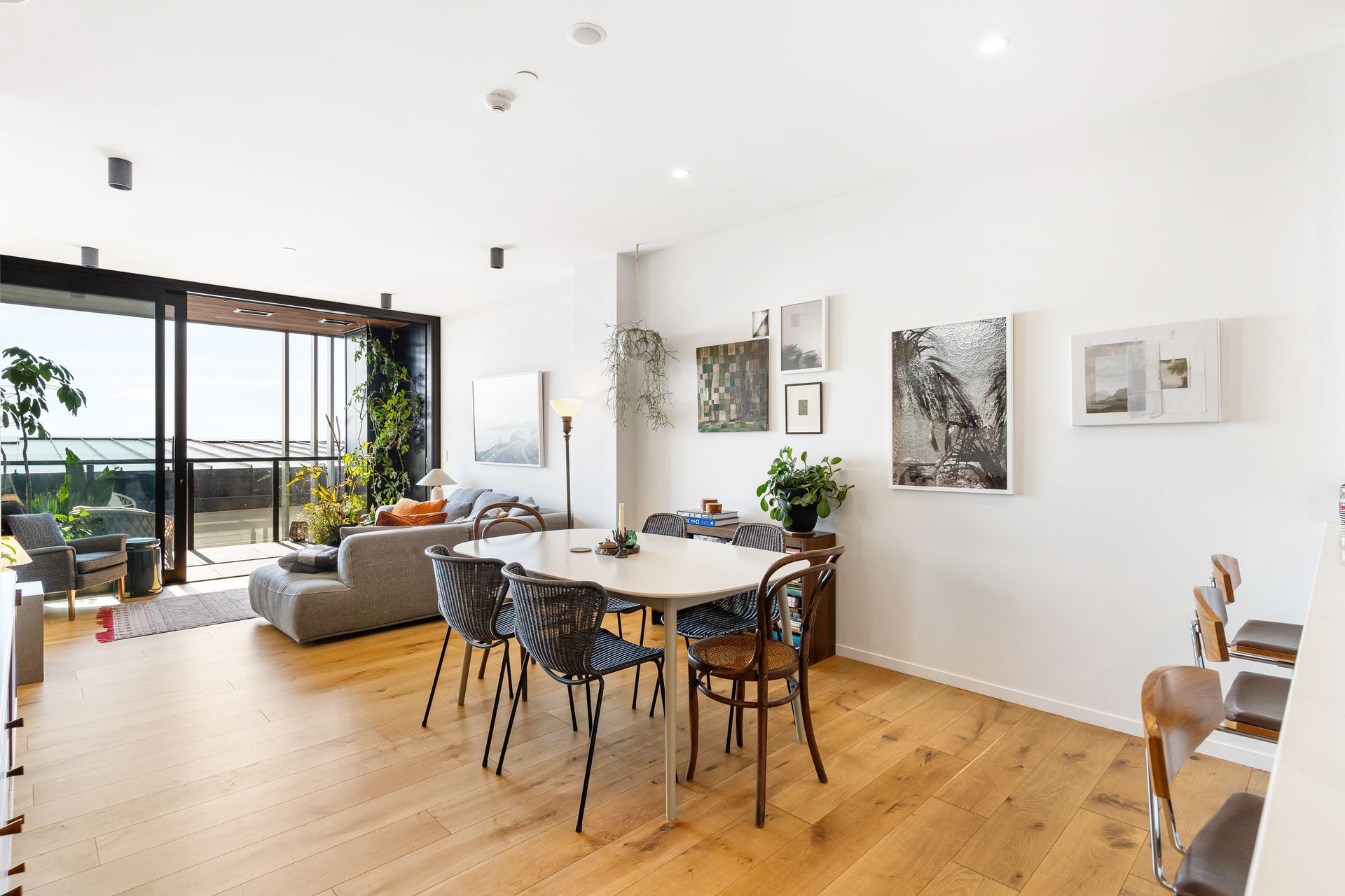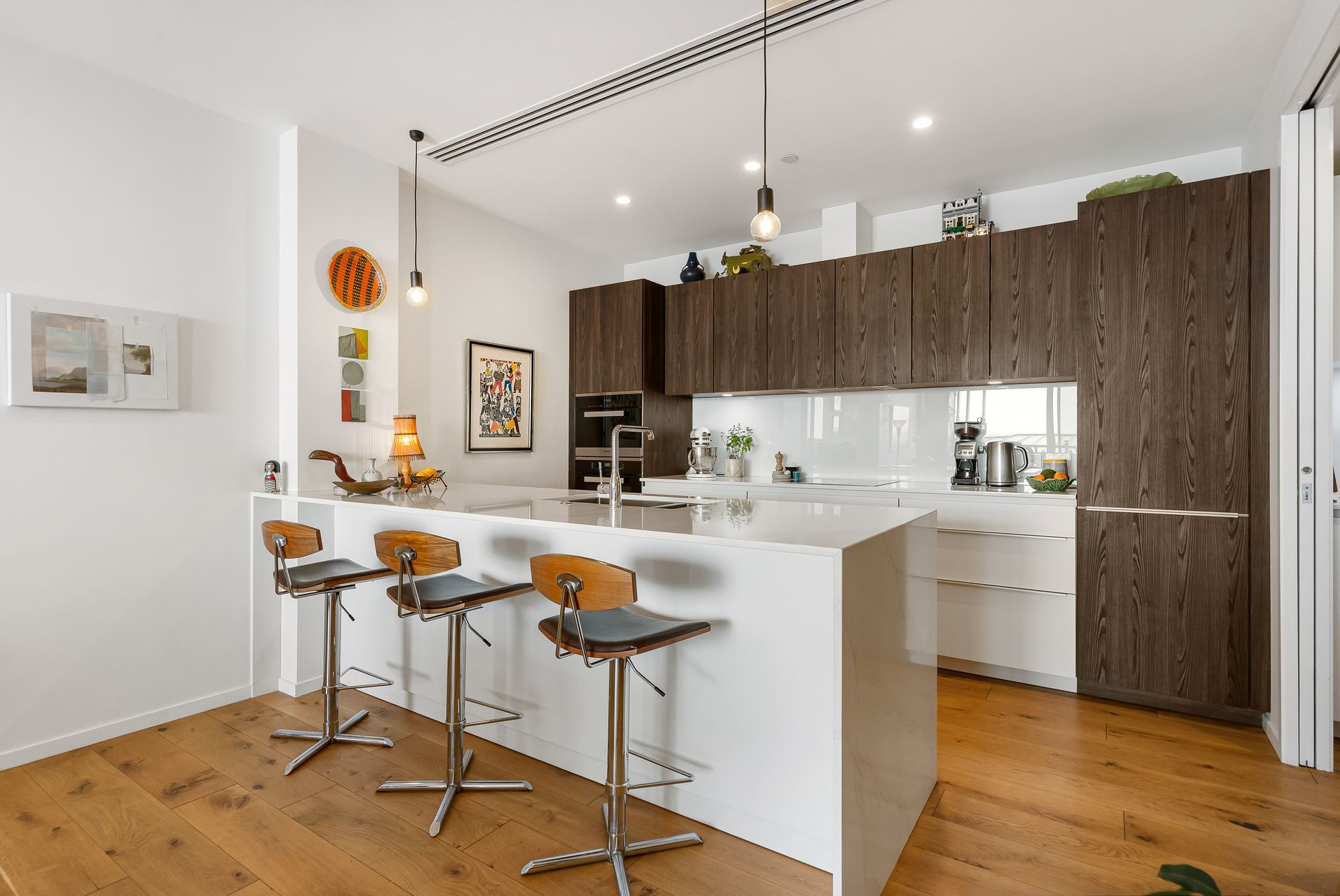 Oak flooring anchors the living areas that lead to the impressive PoggenPohl kitchen. Featuring integrated Miele appliances, dual ovens, engineered quartz-stone benchtops and, a game-changer in apartment-living, the adjoining scullery with second sink and wine fridge.