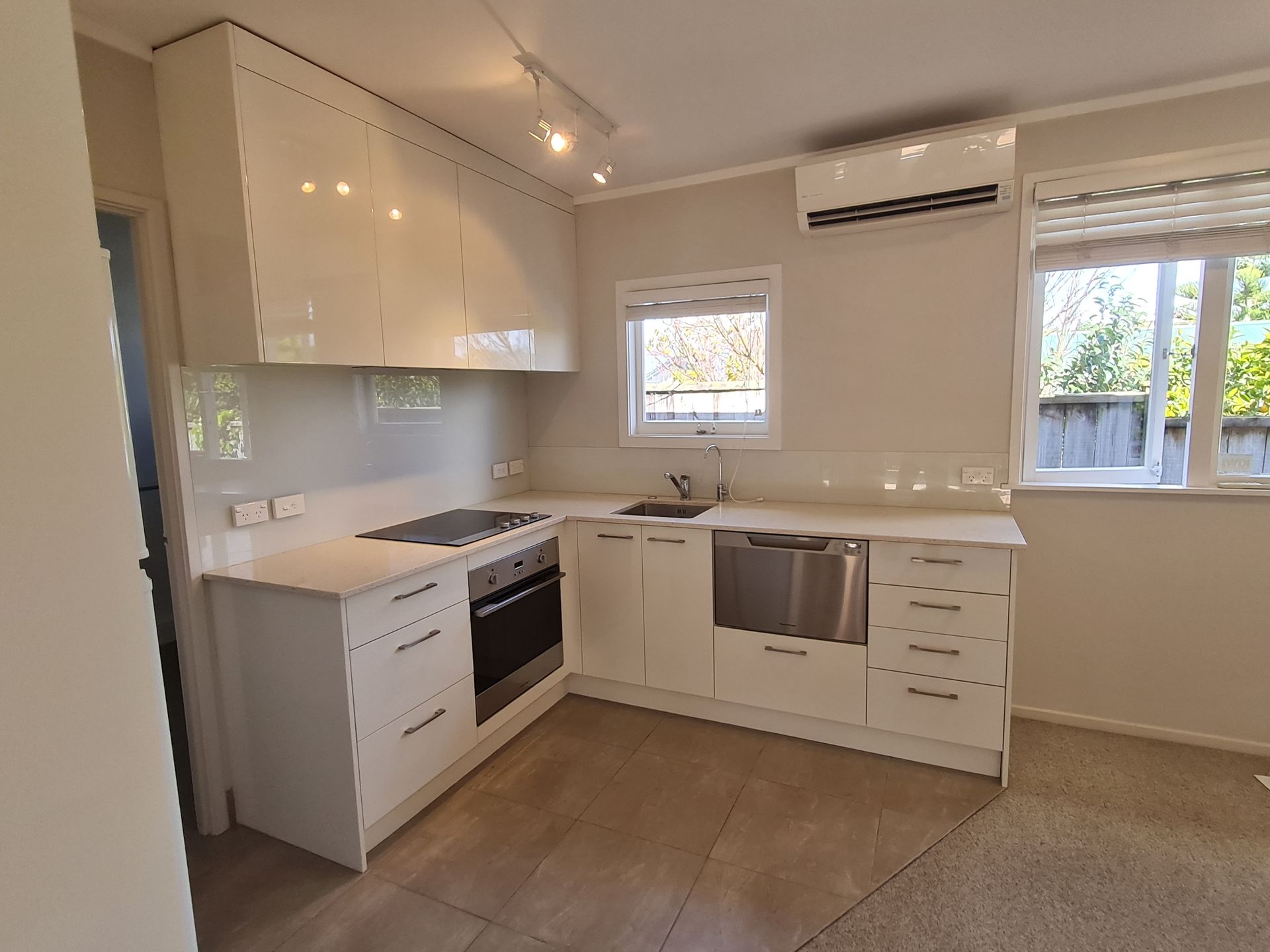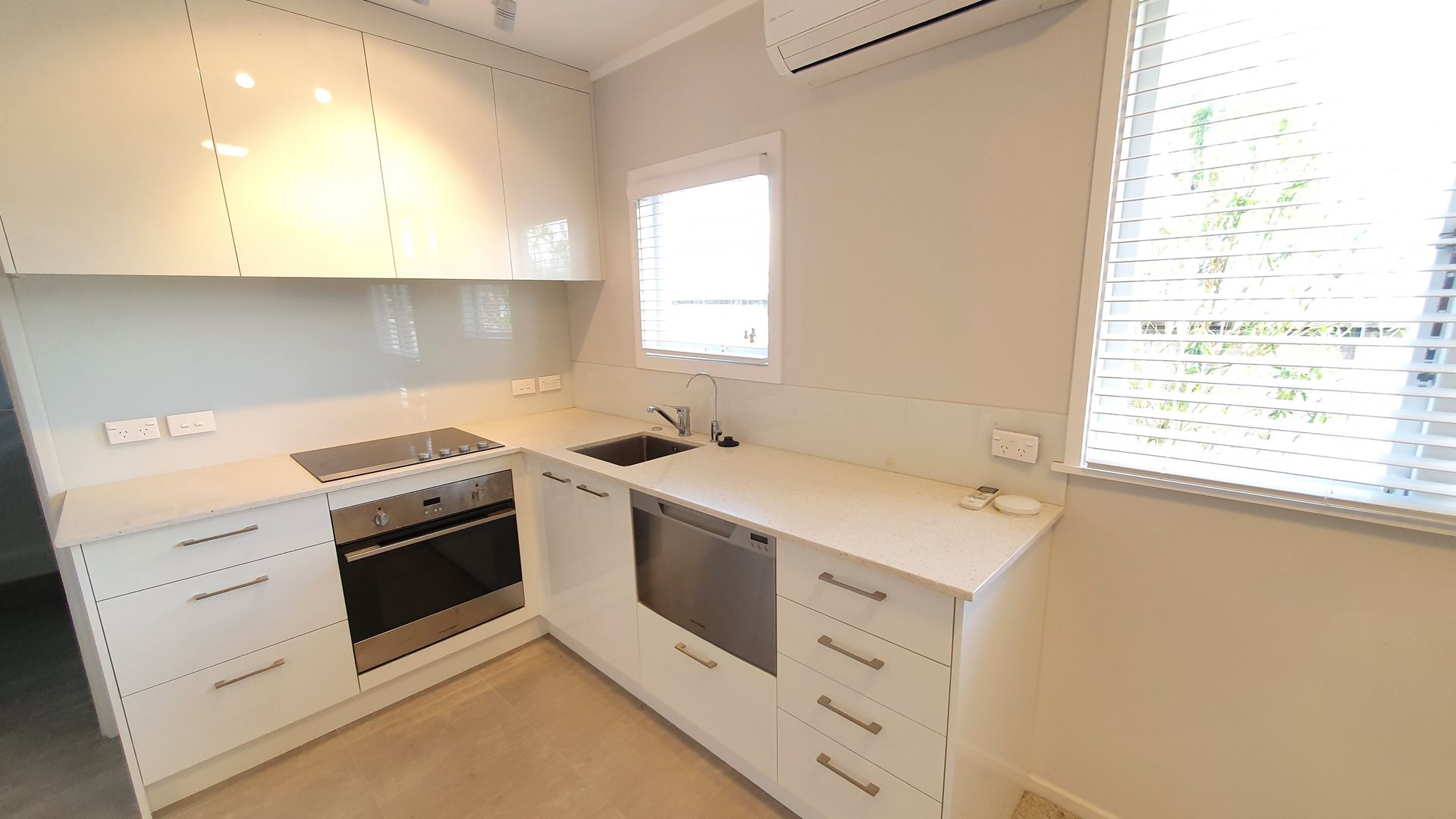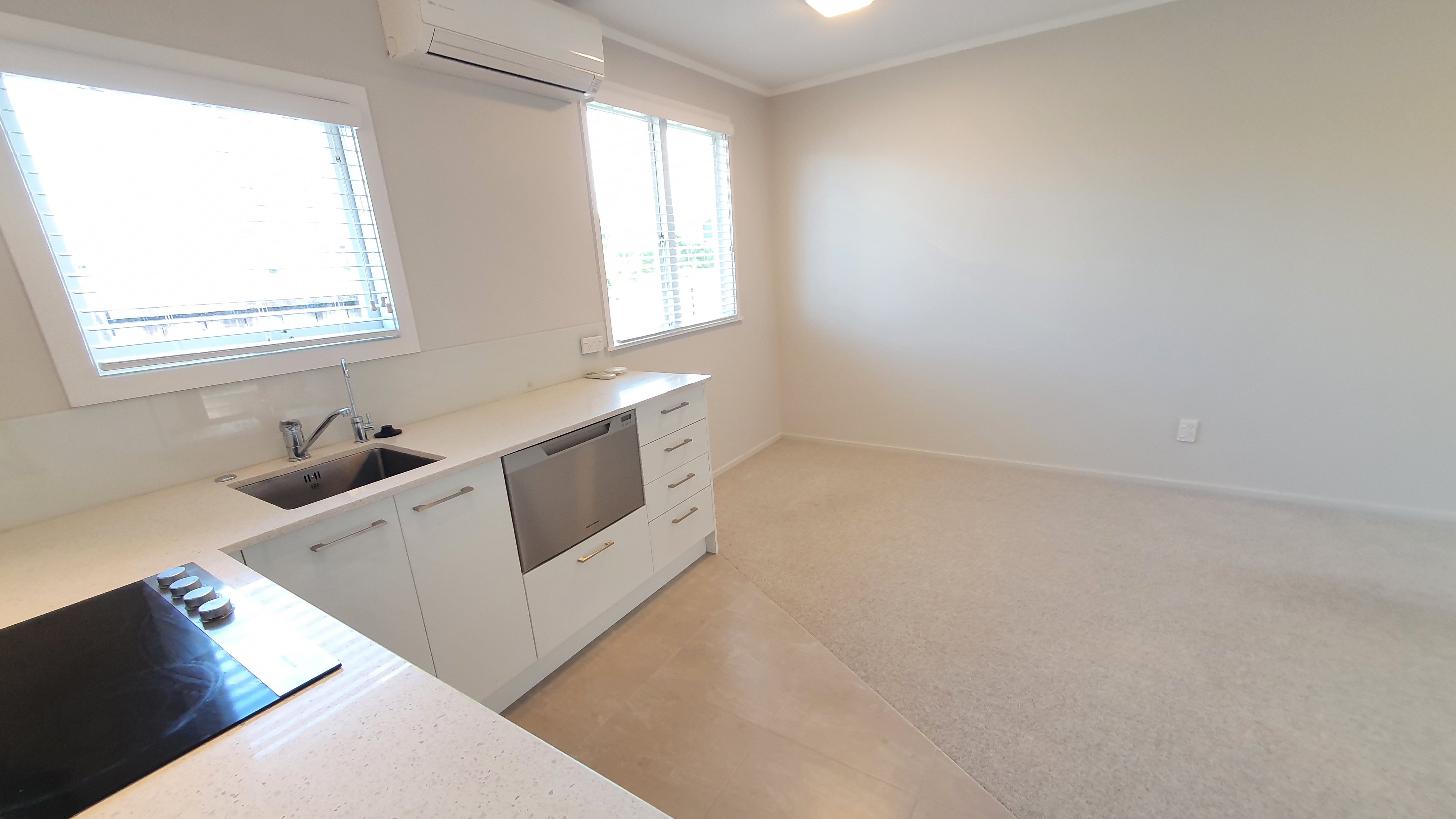 Open plan modern living with nice kitchen. Kitchen has a dishwasher.