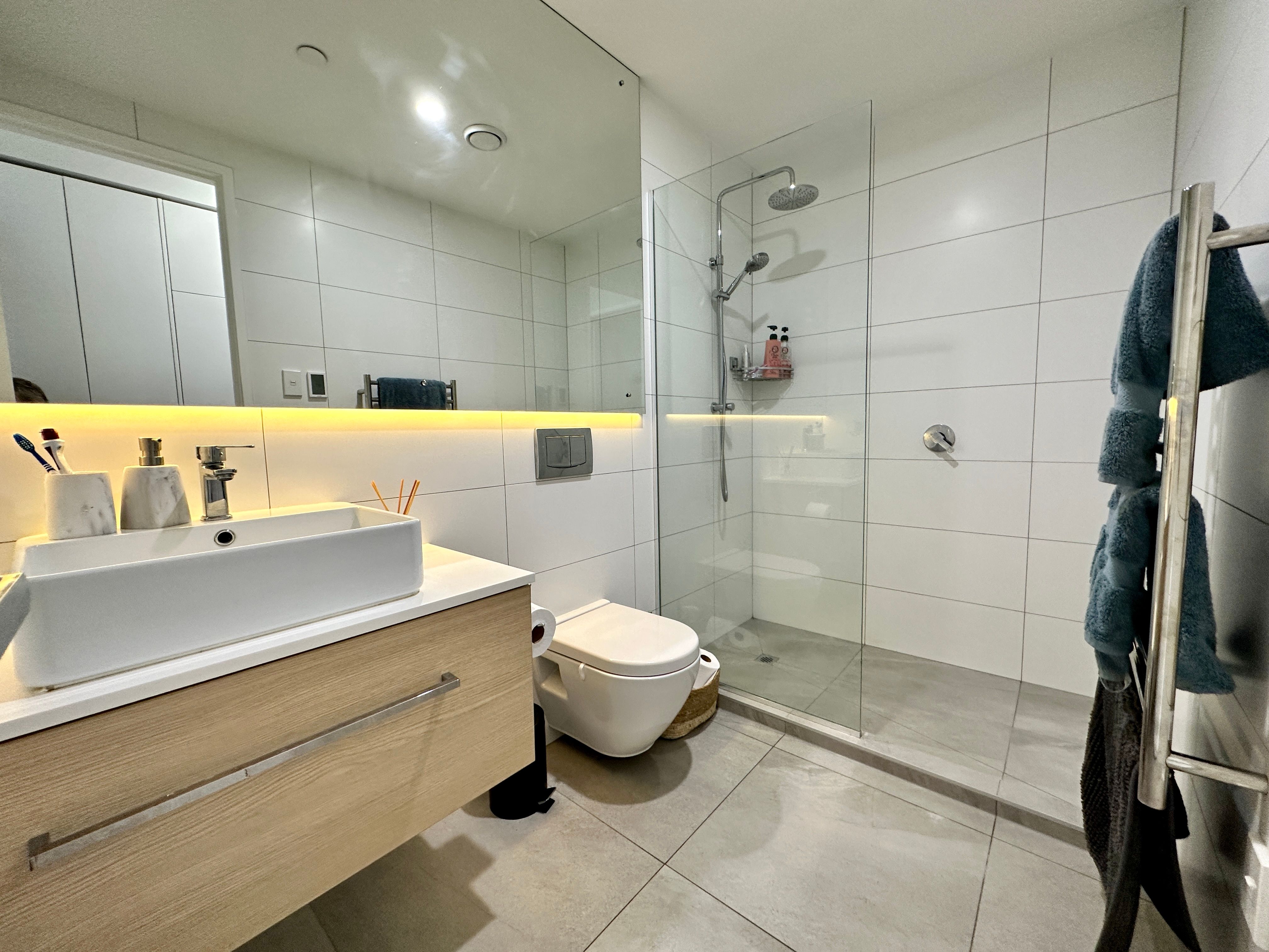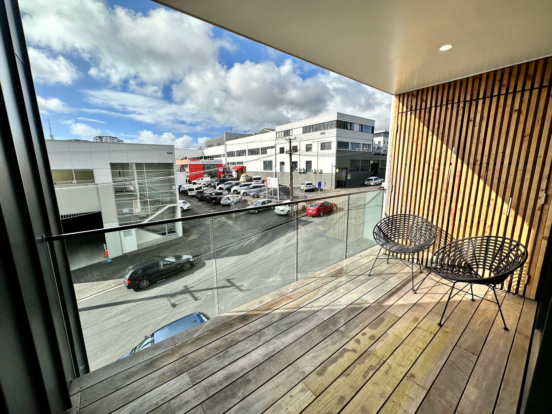 The large balcony, with its hardwood flooring, provides the perfect retreat to relax and soak up the sun while enjoying second-floor views towards the iconic Sky Tower. The no-fuss kitchen impresses with its engineered stone benchtops, stylish linear LED lighting, and tiled splashback. The open-plan kitchen, dining, and living areas feature engineered timber flooring, completing the modern aesthetic. Extras abound in this apartment, including a heat pump, heated underfloor flooring in the bathroom, a rain shower head, intercom system, and double glazing.
