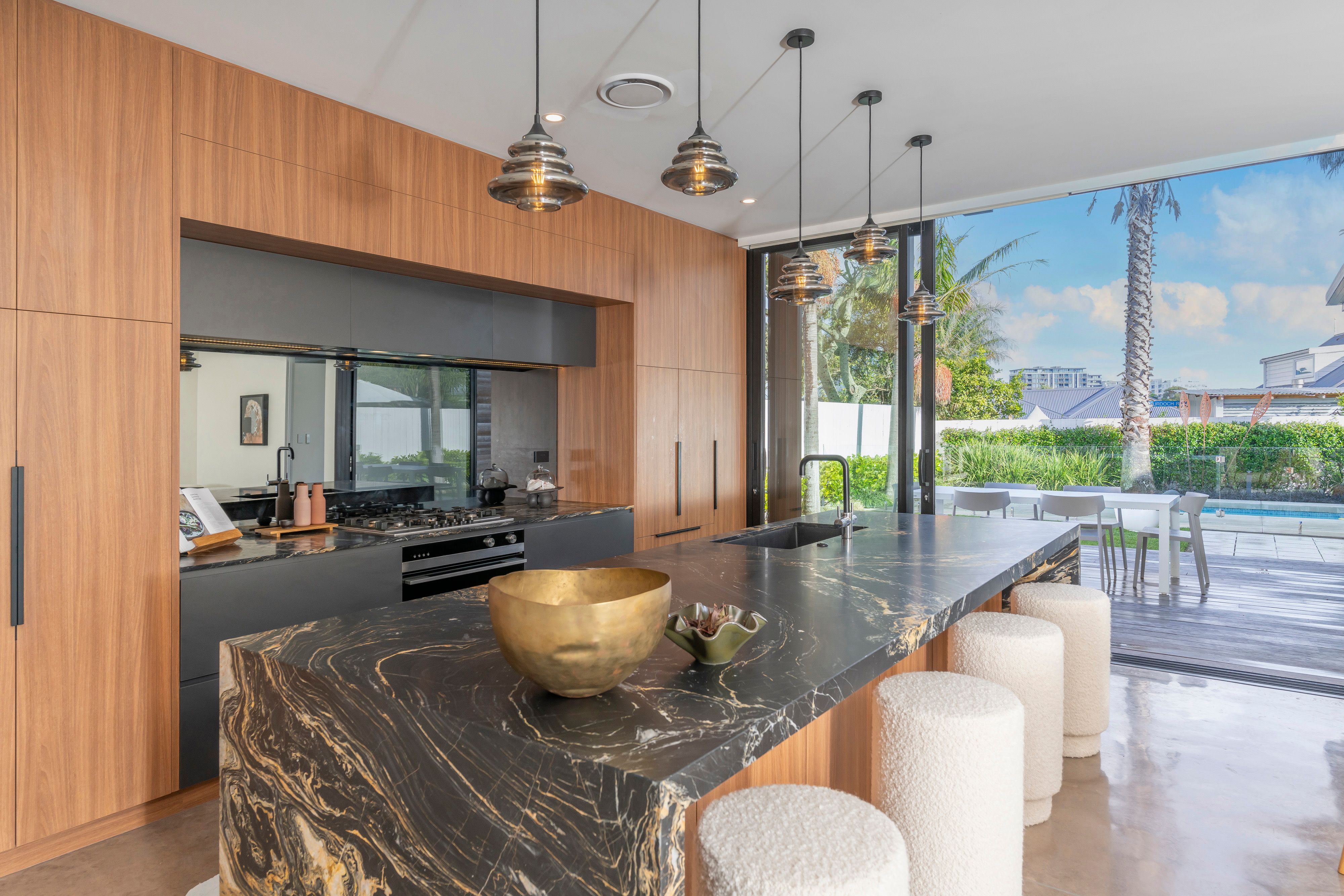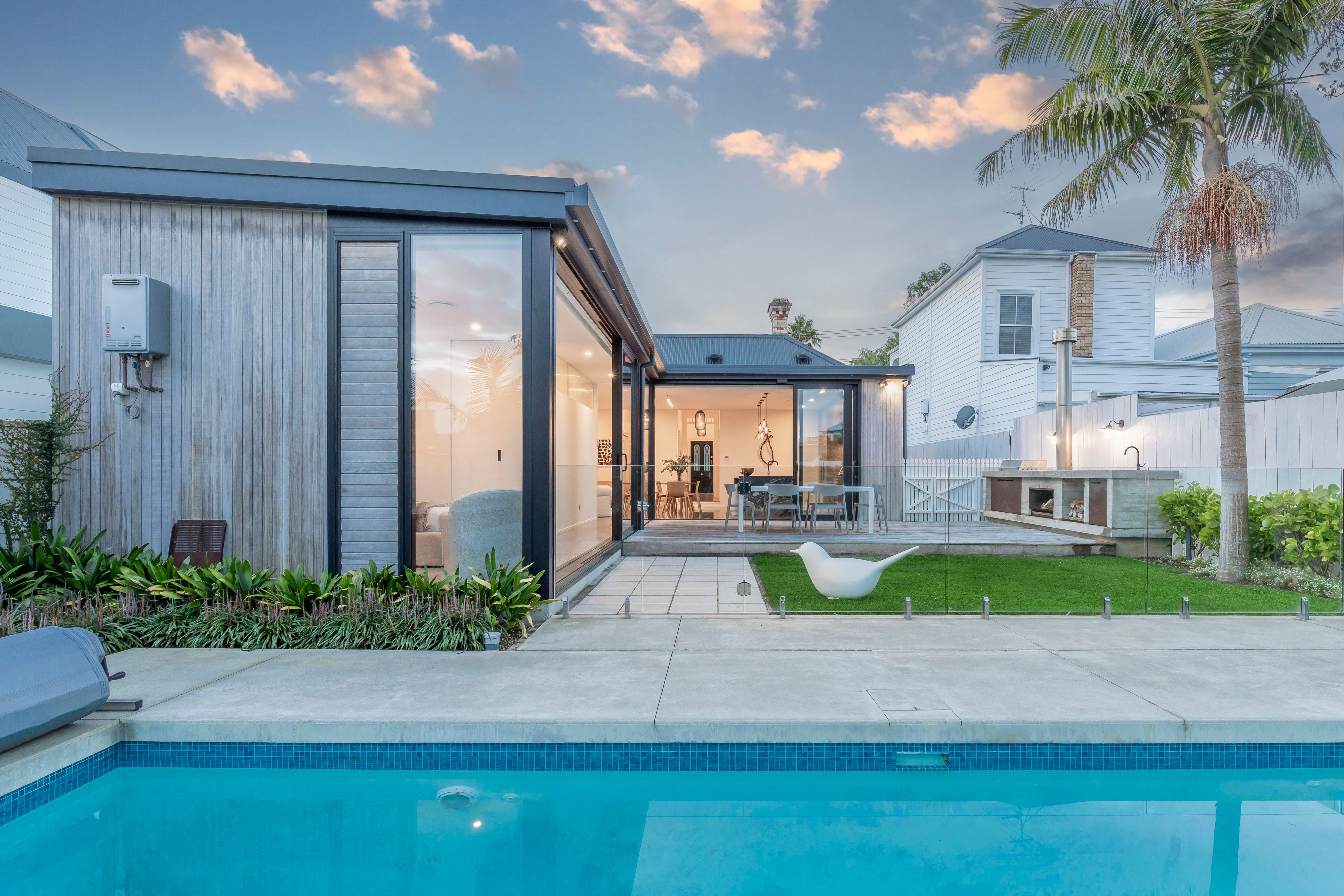 Open the oversized doors to the stunning, resort-style pool and garden framed by established tropical plantings. Host loved ones on the generous al fresco deck complete with built-in barbeque and fireplace. In the cooler months, retreat to the warm, inviting lounge with gas fireplace.