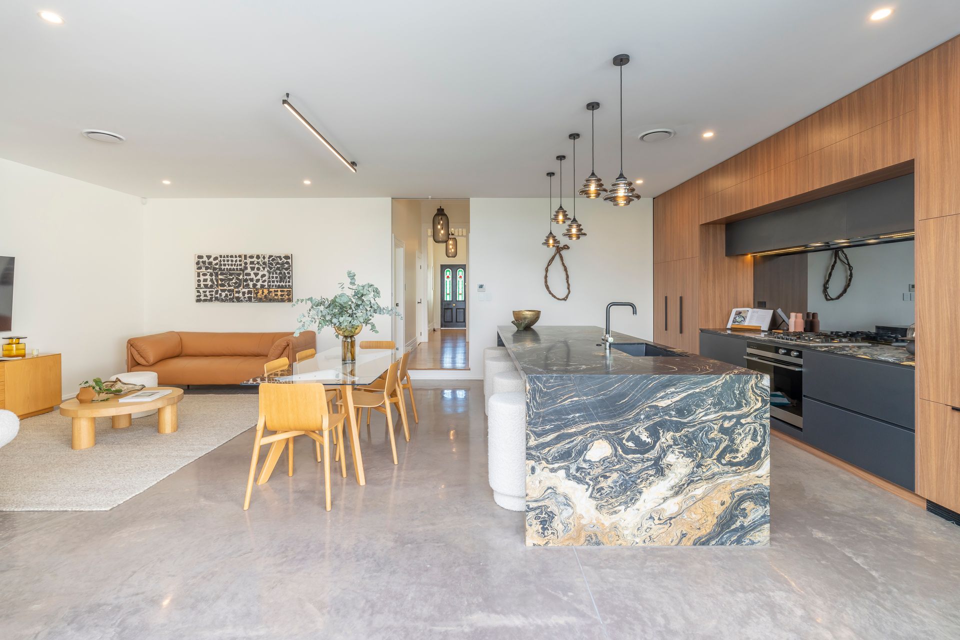 Step past the pristine white picket fence, across the polished native timber floors to the open plan living room where the sophisticated centrepiece kitchen invites lavish entertaining around a striking waterfall marble island.