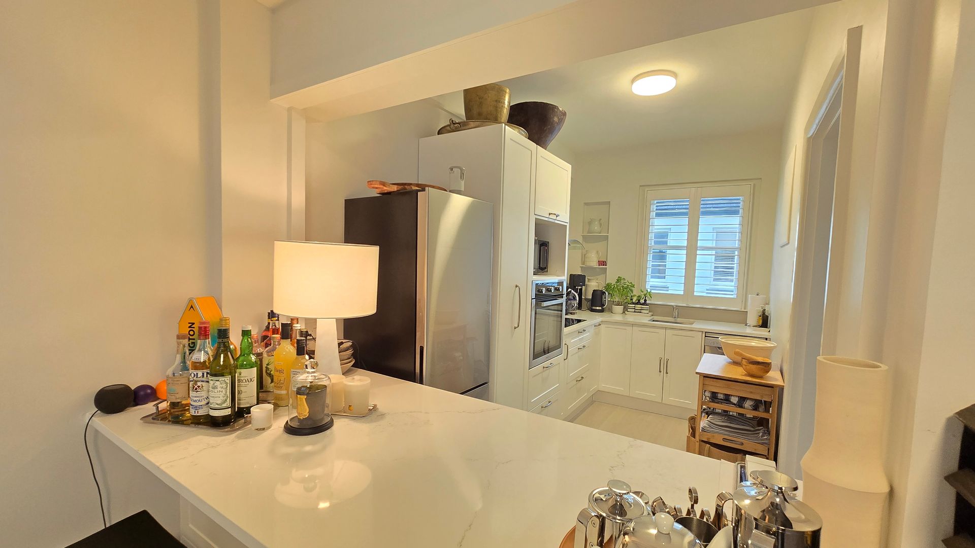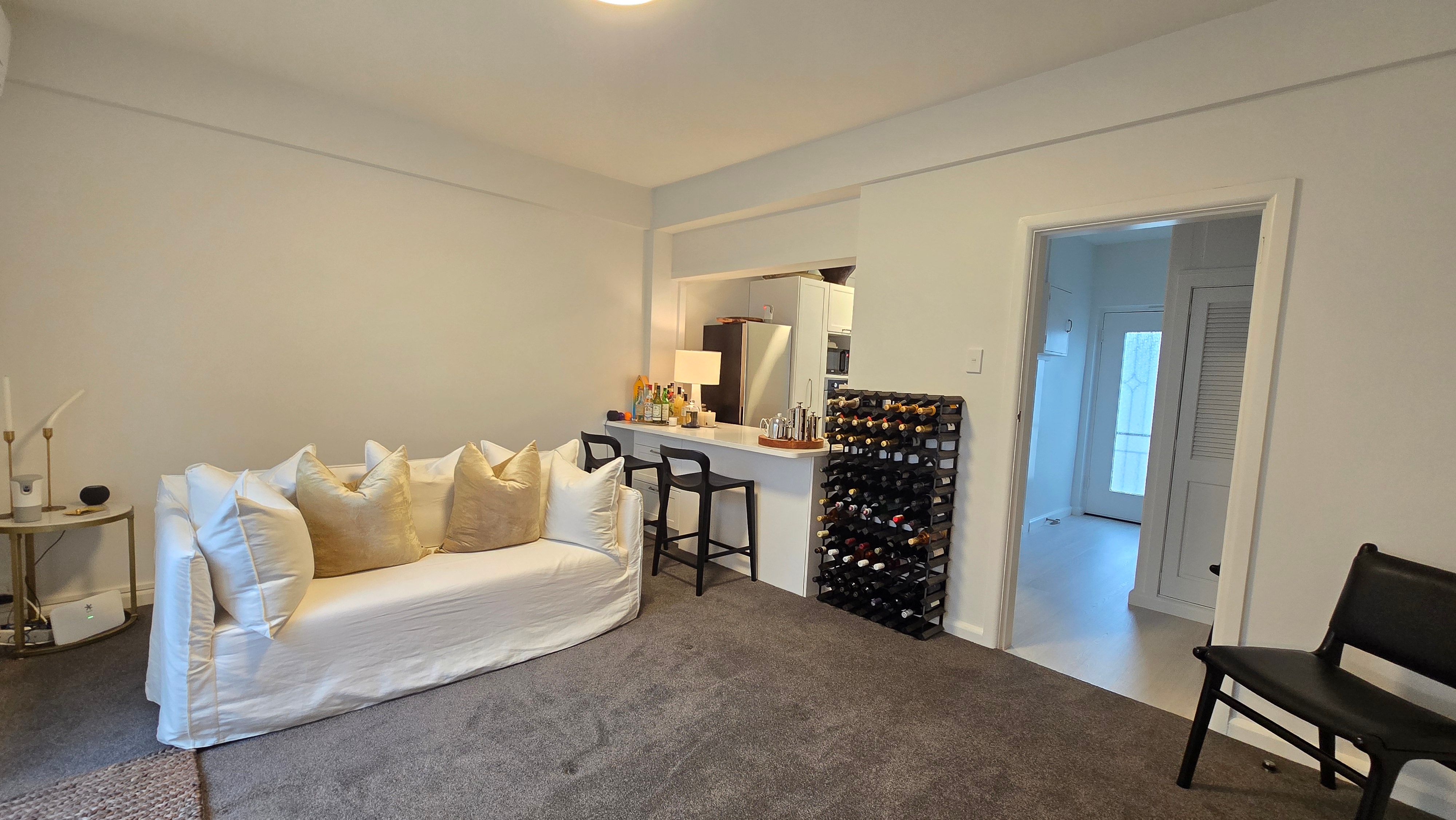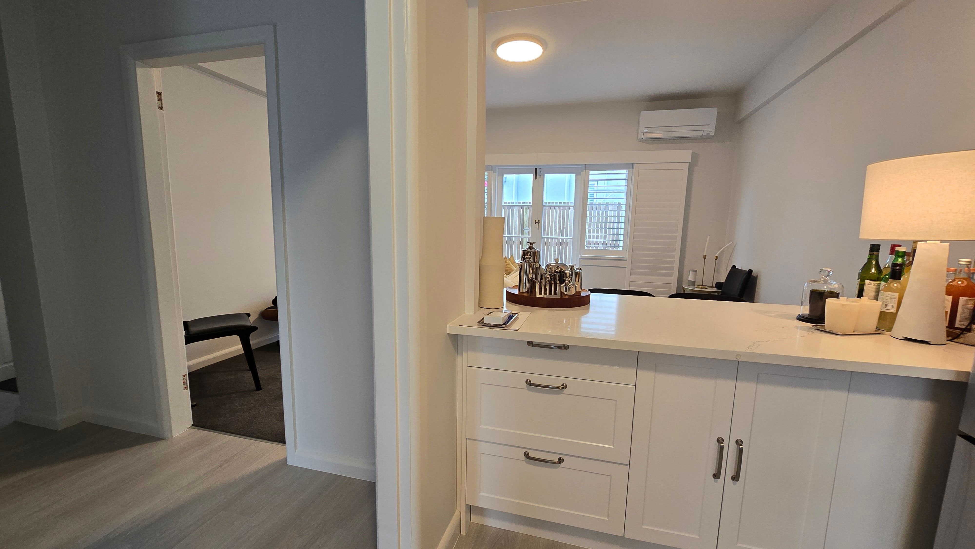 This is a downstairs apartments with open planned living space with a look through kitchen to living area. Modern kitchen with stone bench tops. Kitchen comes with fridge and dishwasher.