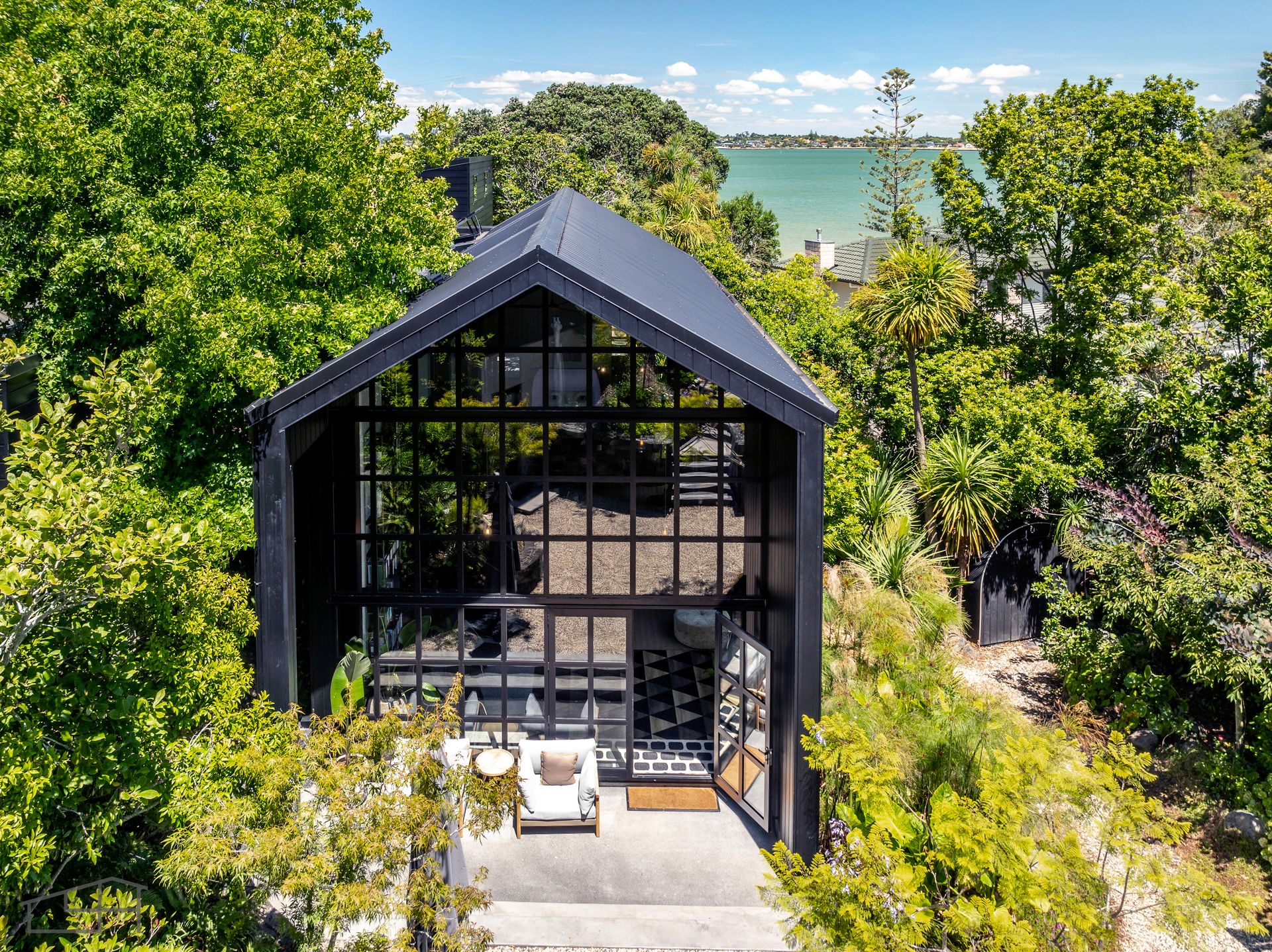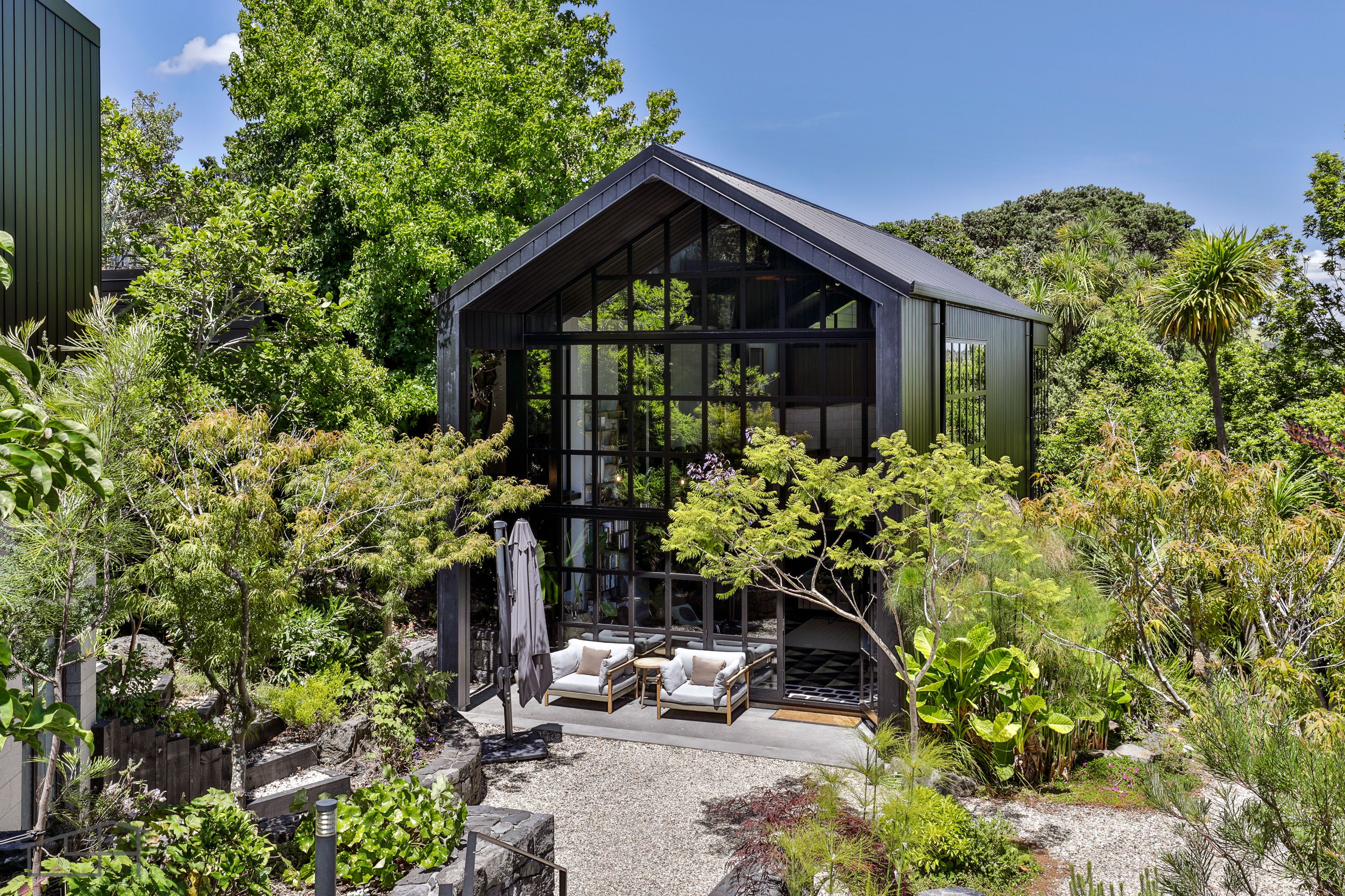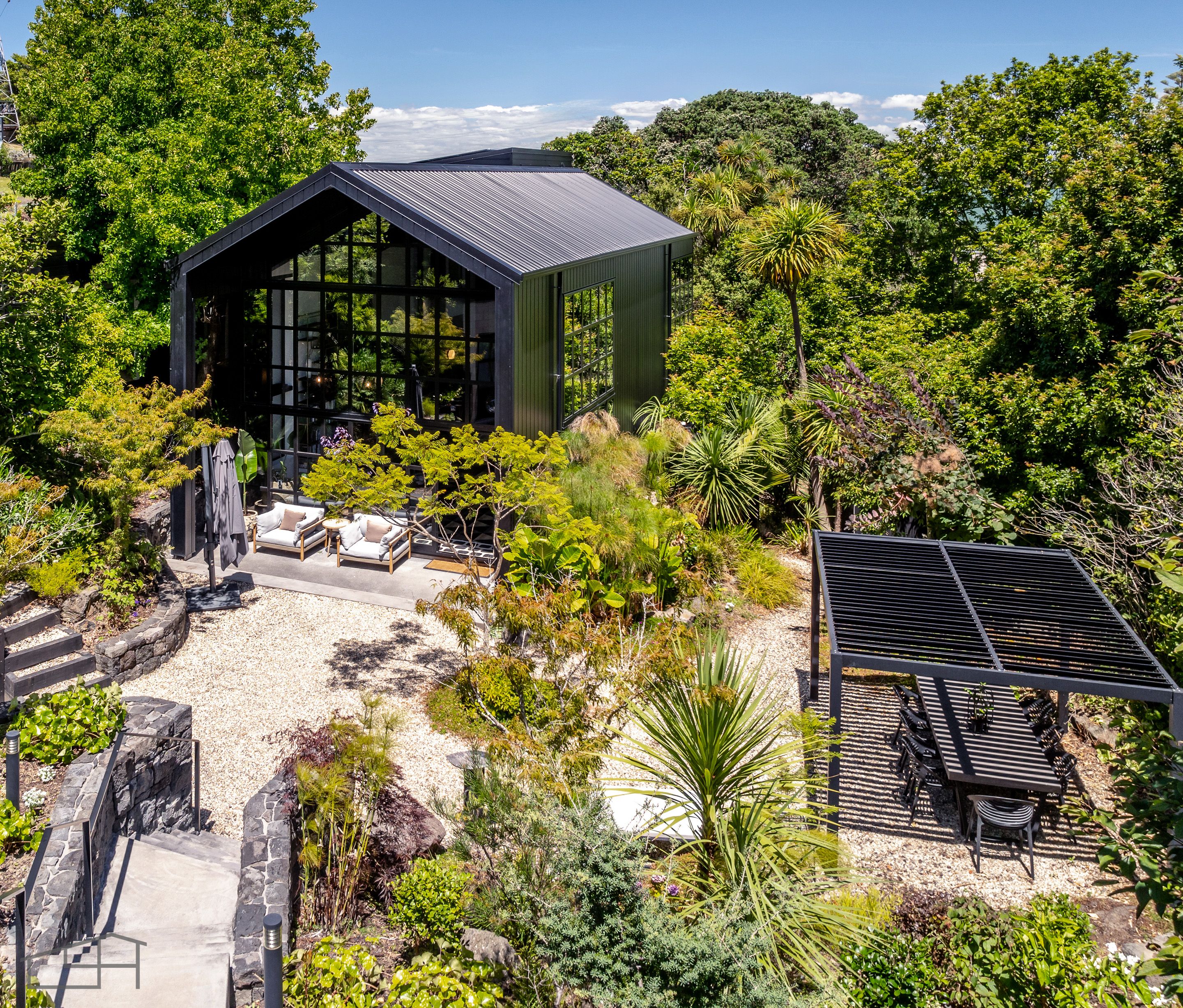 At the centre of the home lies an expansive, underfloor heated atrium flowing to the outdoors. Floor to ceiling picture windows bathe the interiors in natural light and frame the private entry courtyard. Featuring an outdoor dining area set beneath an arbour of established plantings, this is an inviting place to gather with family and friends. The garden lighting is magical - follow the pathway leading to a secret hangout spot for summer evenings under the pohutakawa trees where you can enjoy the sounds of birdlife and views of the Manukau harbour. The kitchen is luxuriously appointed for effortless epicurean adventures.