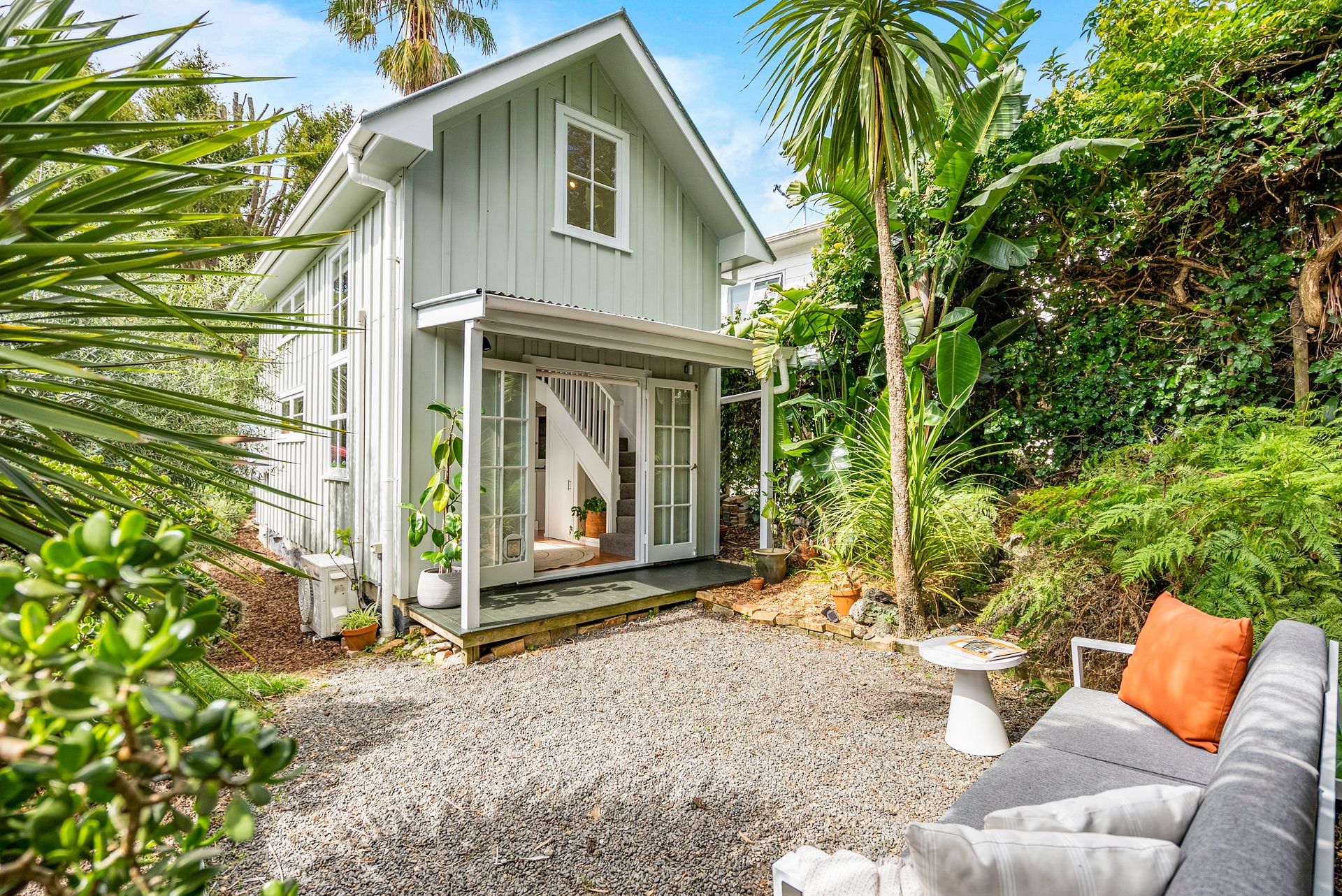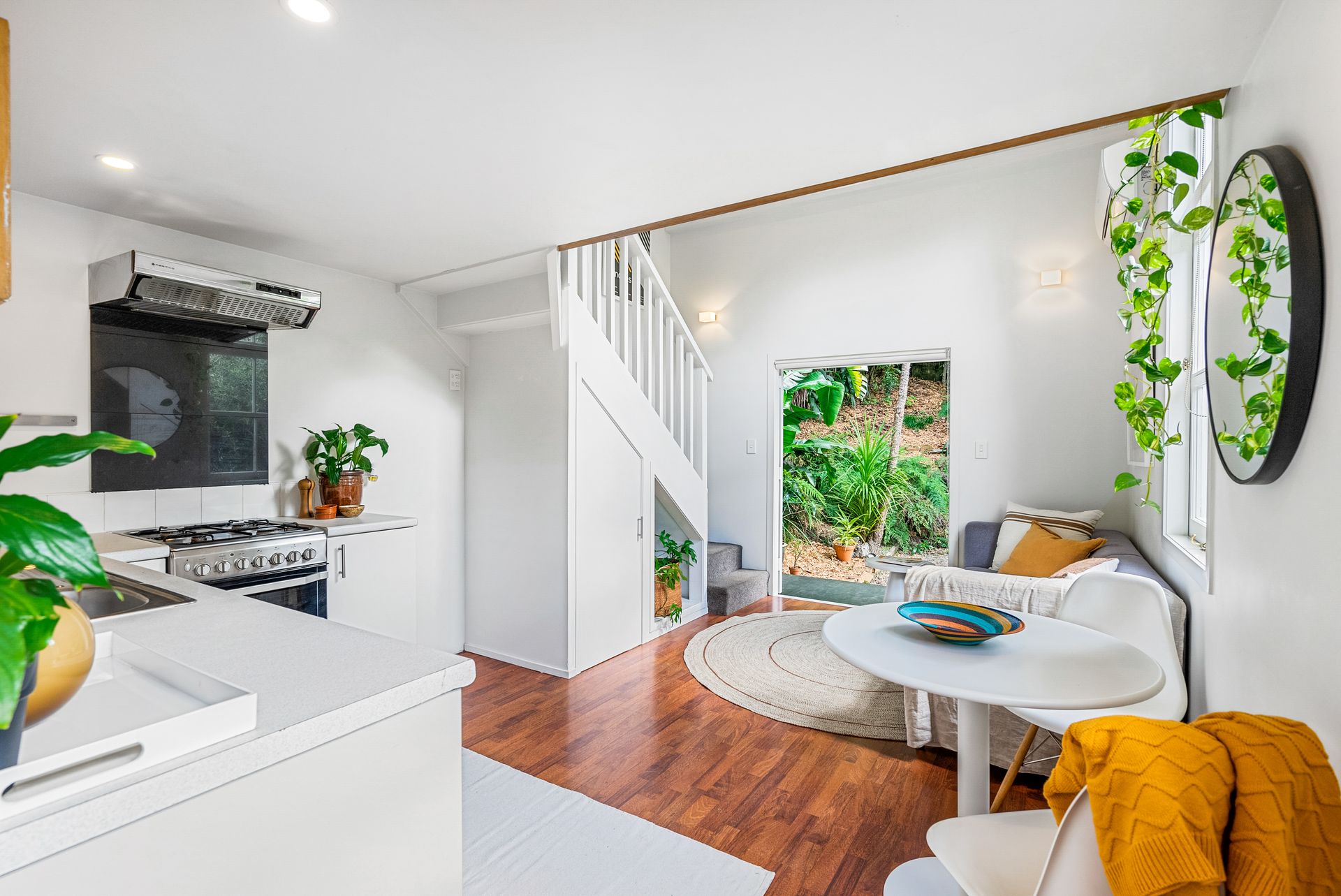 With an open plan living space downstairs and a mezzanine bedroom above, you'll find it is surprisingly spacious inside. It has the light and airy open plan feel of an apartment, but in a standalone home with off street parking and an absolutely luscious tropical back garden.