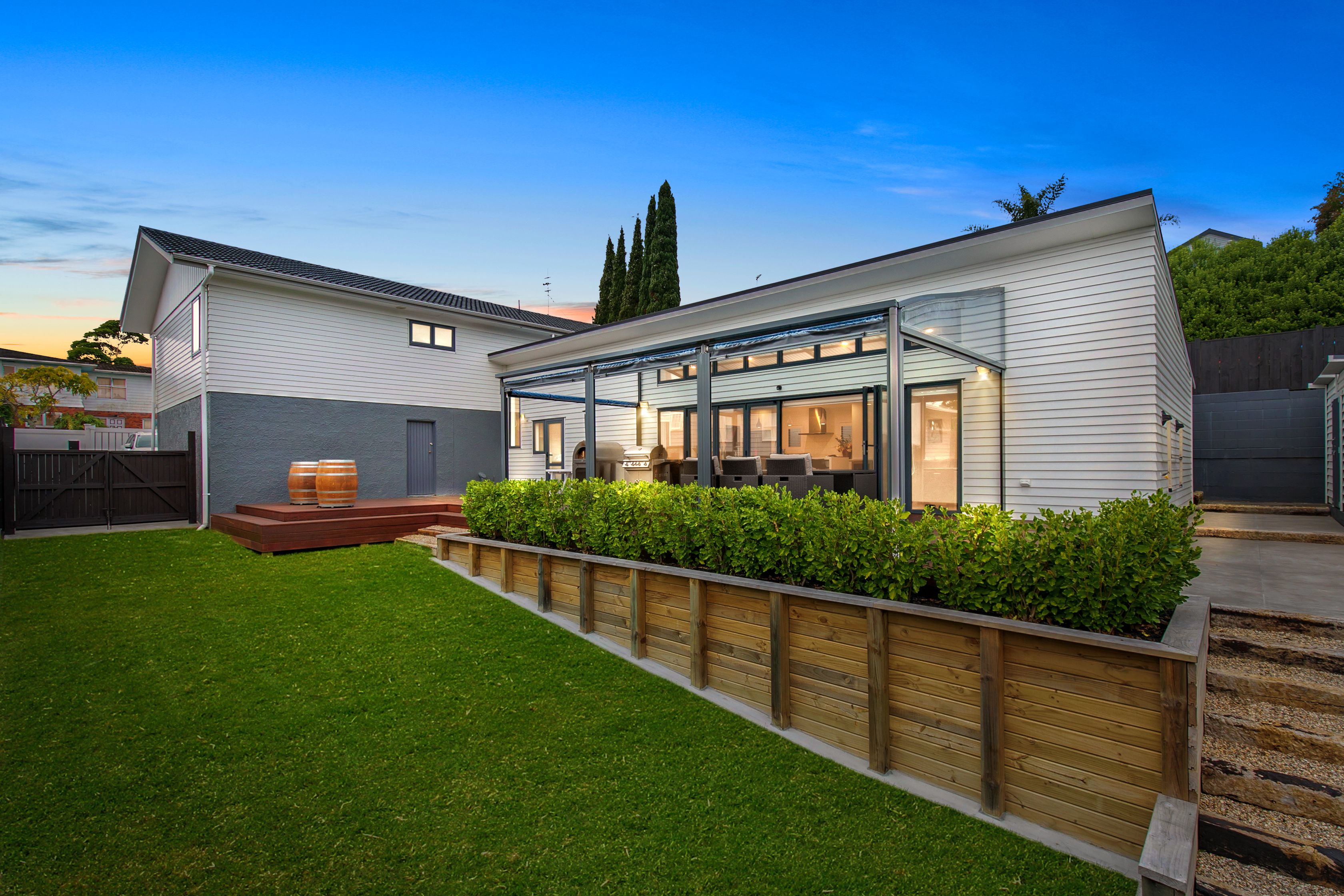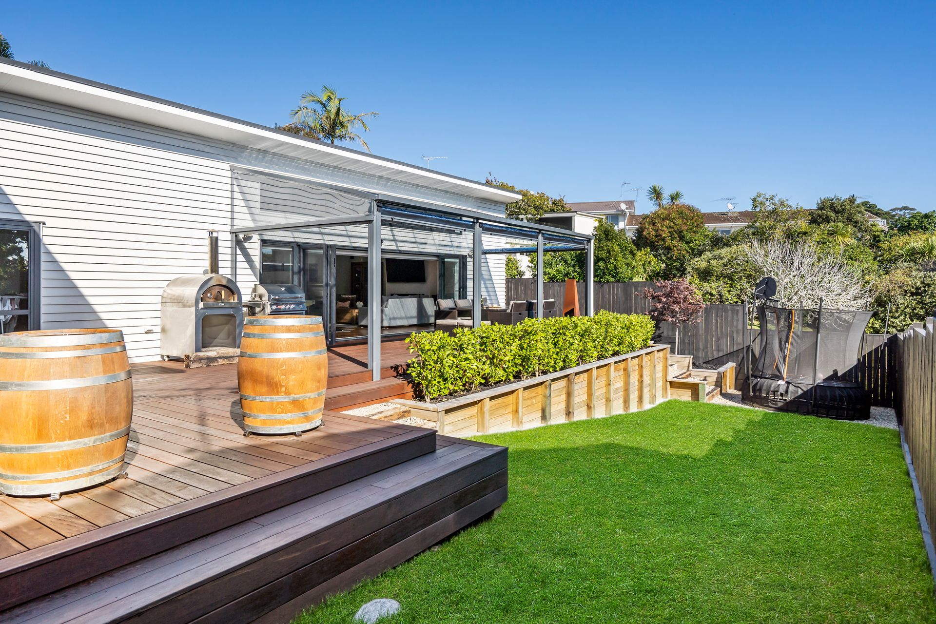 Basking in all day sun, the fully fenced landscaped child and pet friendly section has an abundance of lush grass and even room for the pool.