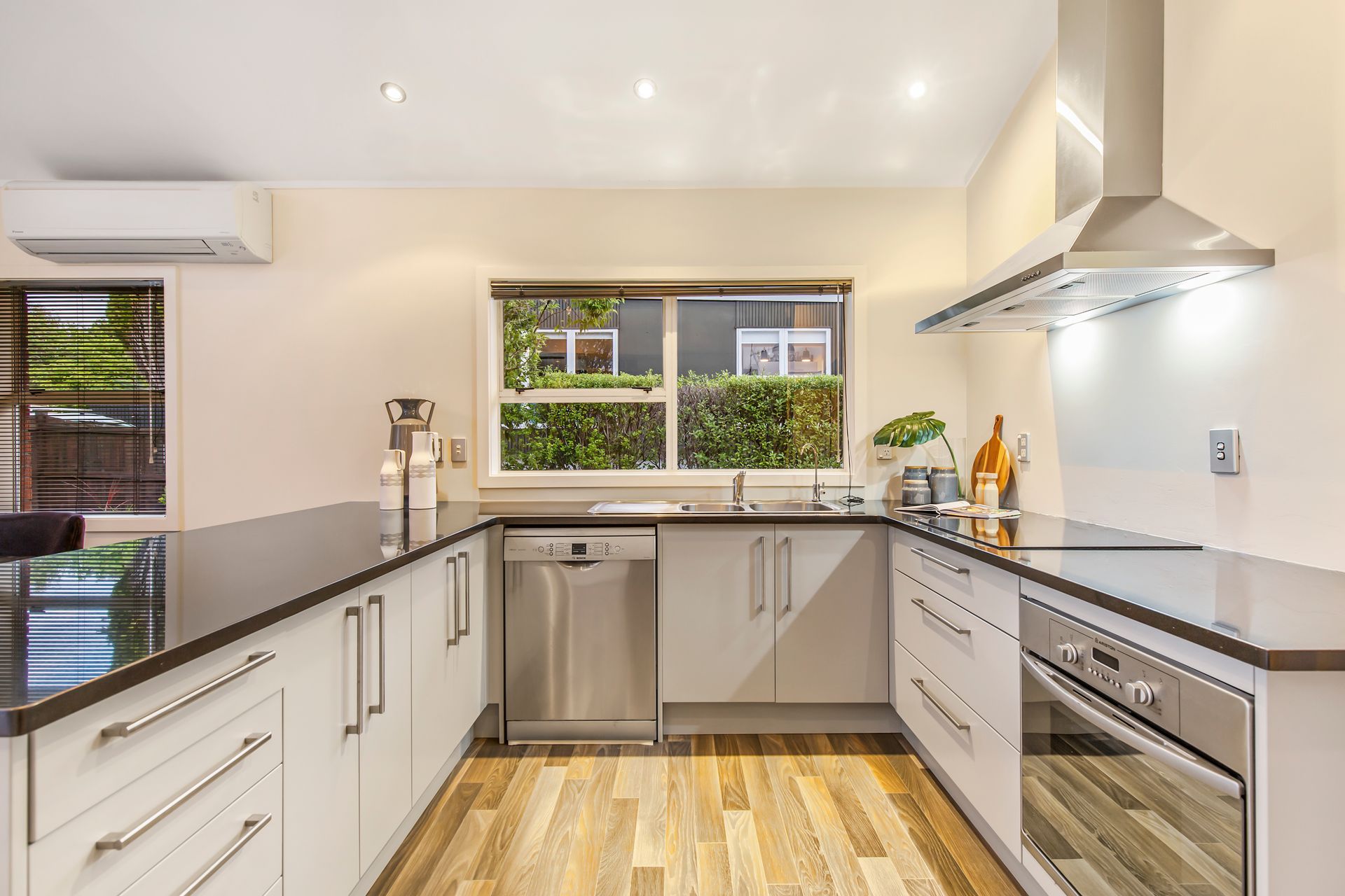 Laden with natural light, the spacious living and dining featuring double height windows is adjacent the modern kitchen featuring quality stainless appliances.