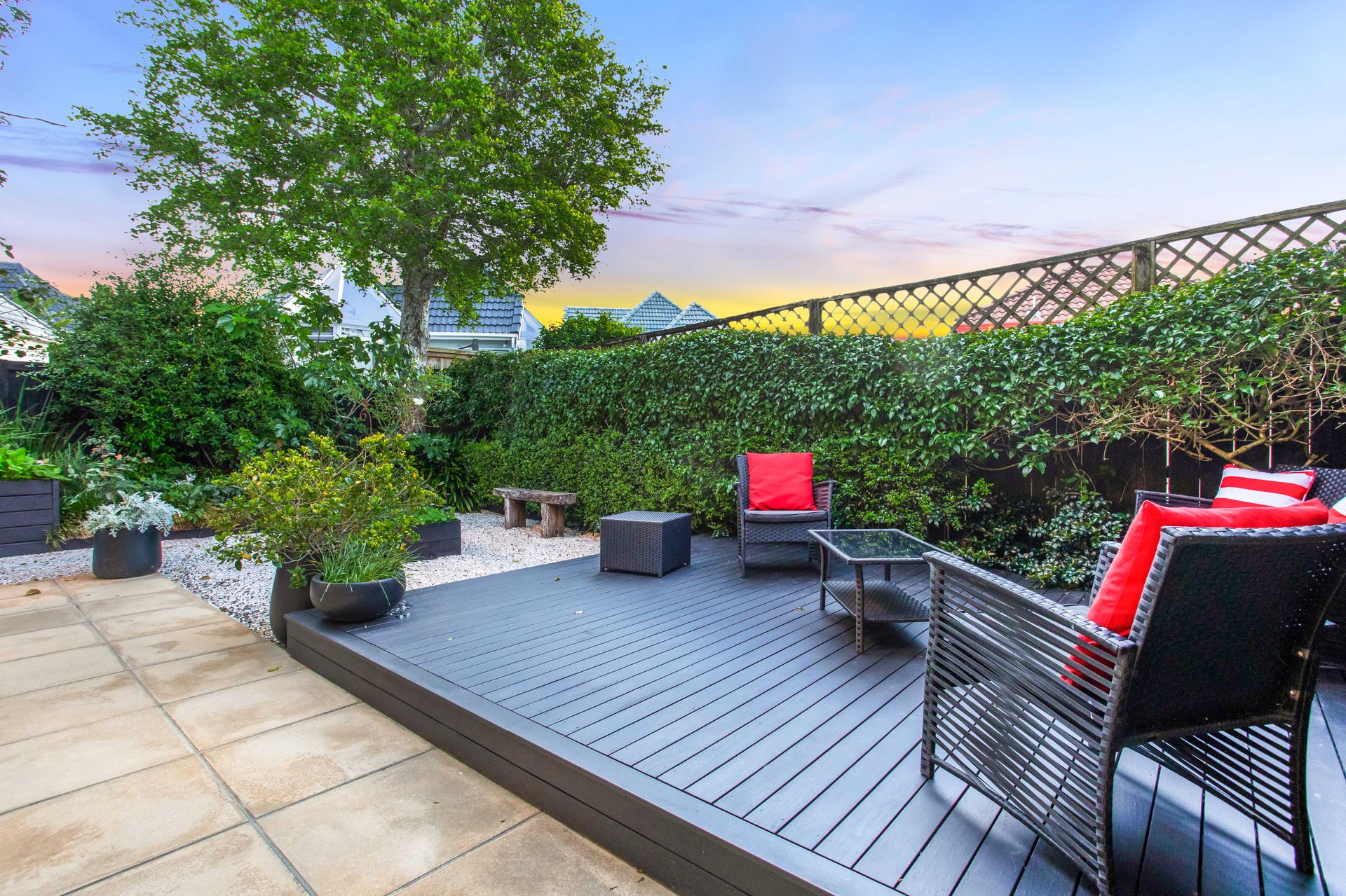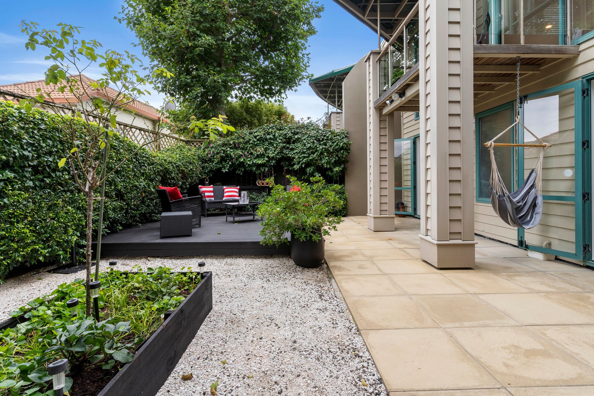 The lower level features two generous bedrooms, both opening directly onto a landscaped garden retreat. A dedicated decked area enjoys the warmth of the afternoon sun-an ideal space for relaxing or entertaining. A full-sized bathroom on this level, complete with a bathtub, ensures comfort for family and guests.