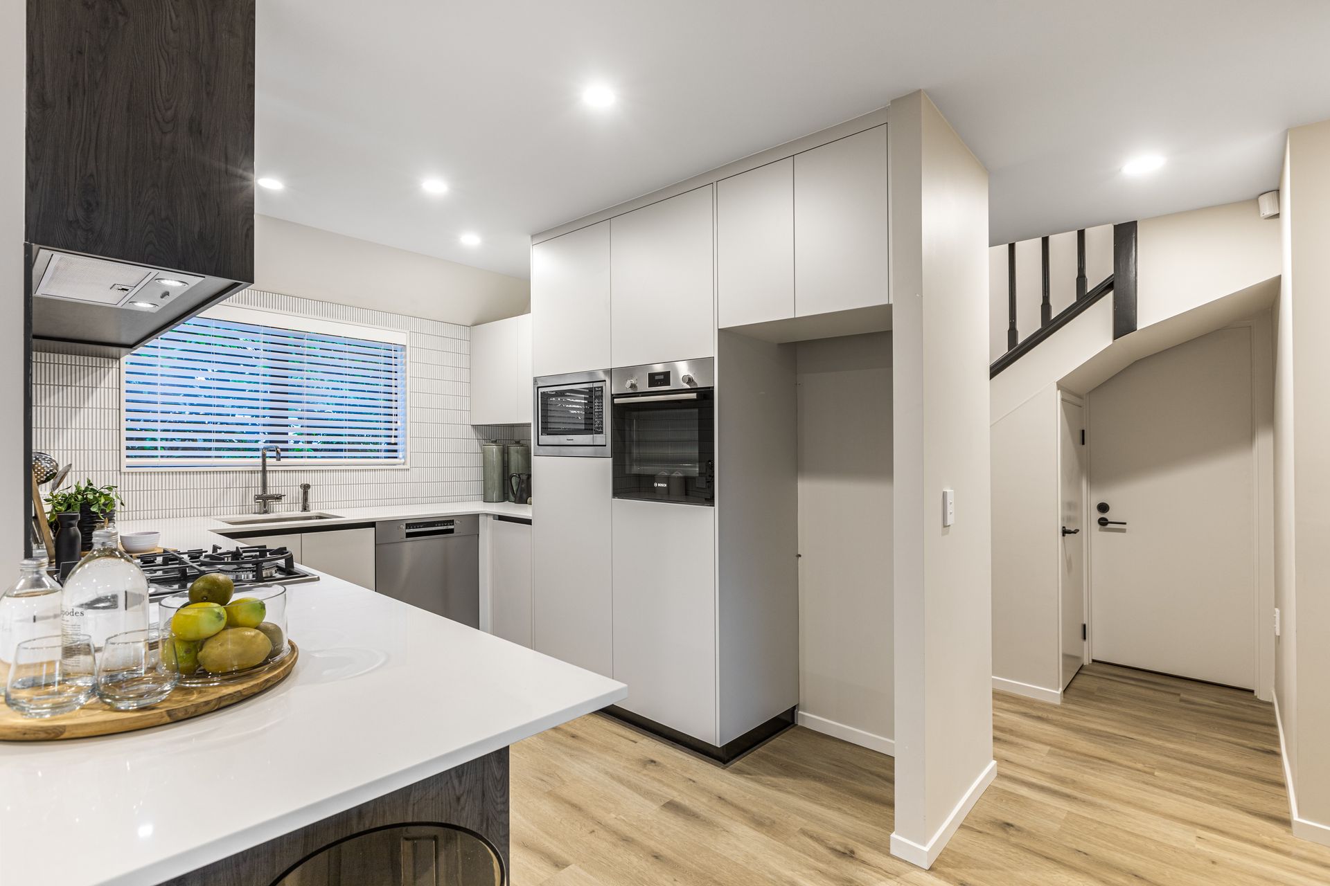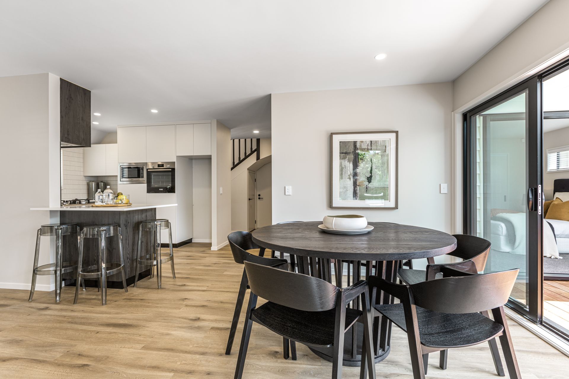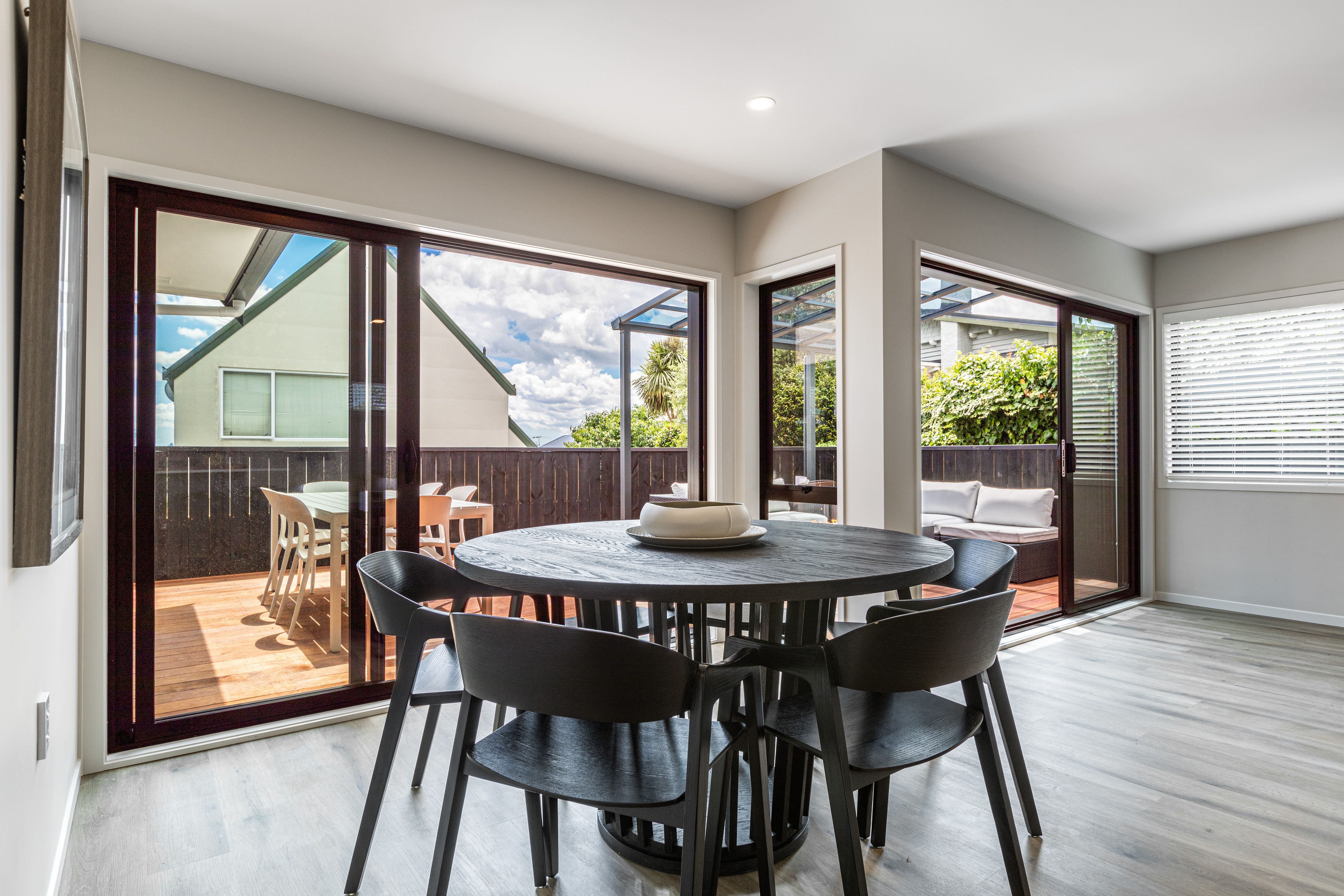 The ground floor layout encompasses all entertaining spaces where stackable sliders open onto a private and sheltered deck where guests can move freely from dining table to alfresco. The master bedroom on this floor also accesses the same sunny deck and has its own fully tiled designer ensuite. A stairway illuminated by stylish pendant wends its way to the upper floor where two more double bedrooms include one with walk in robe and both sharing another similarly adorned bathroom.