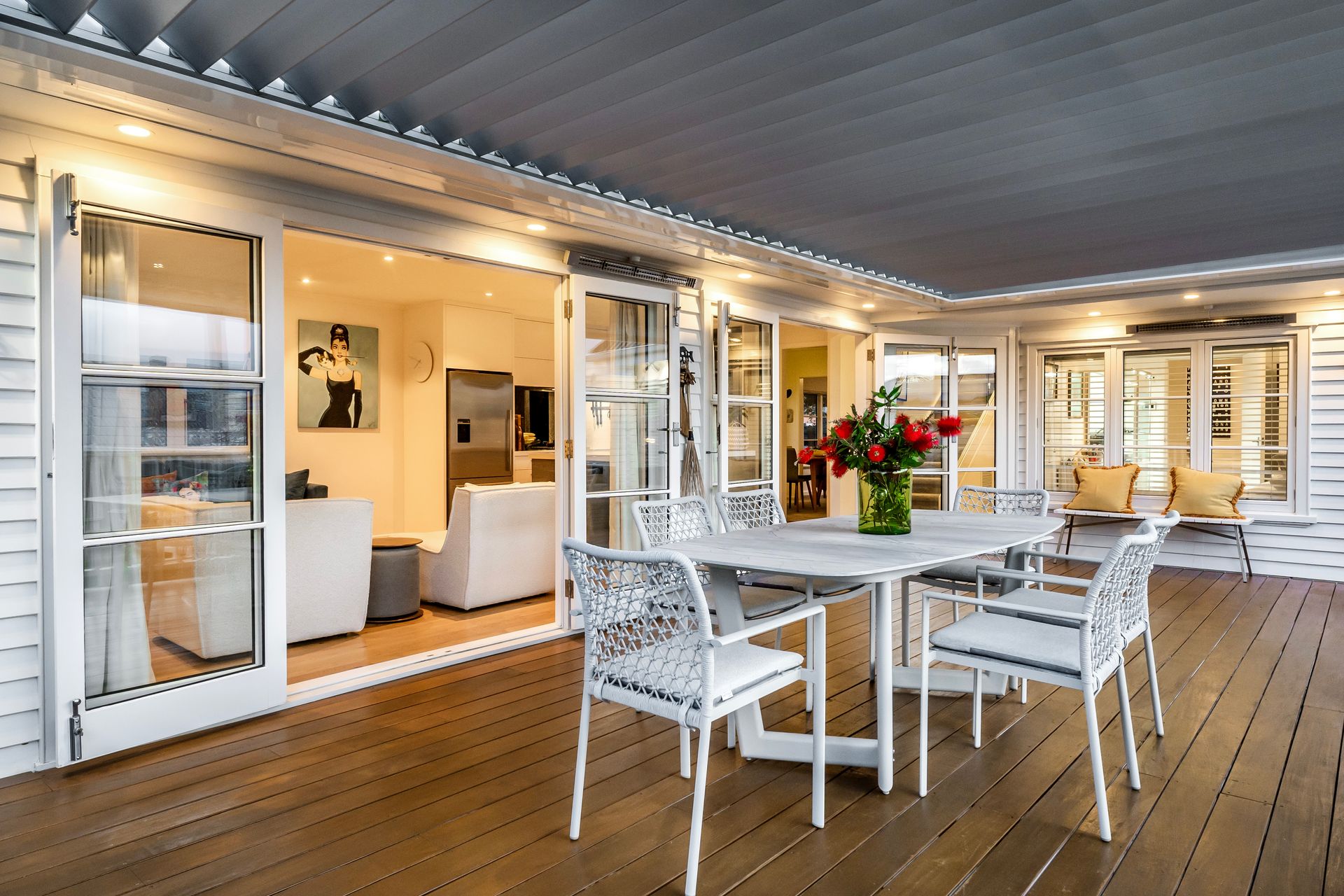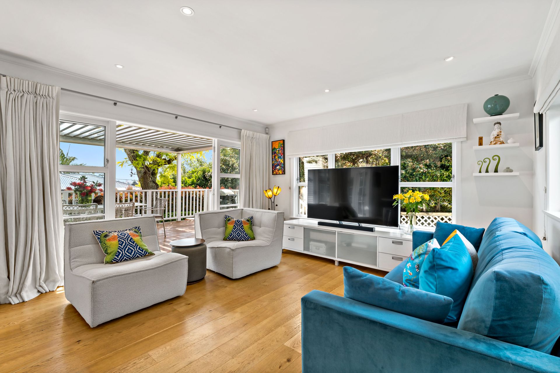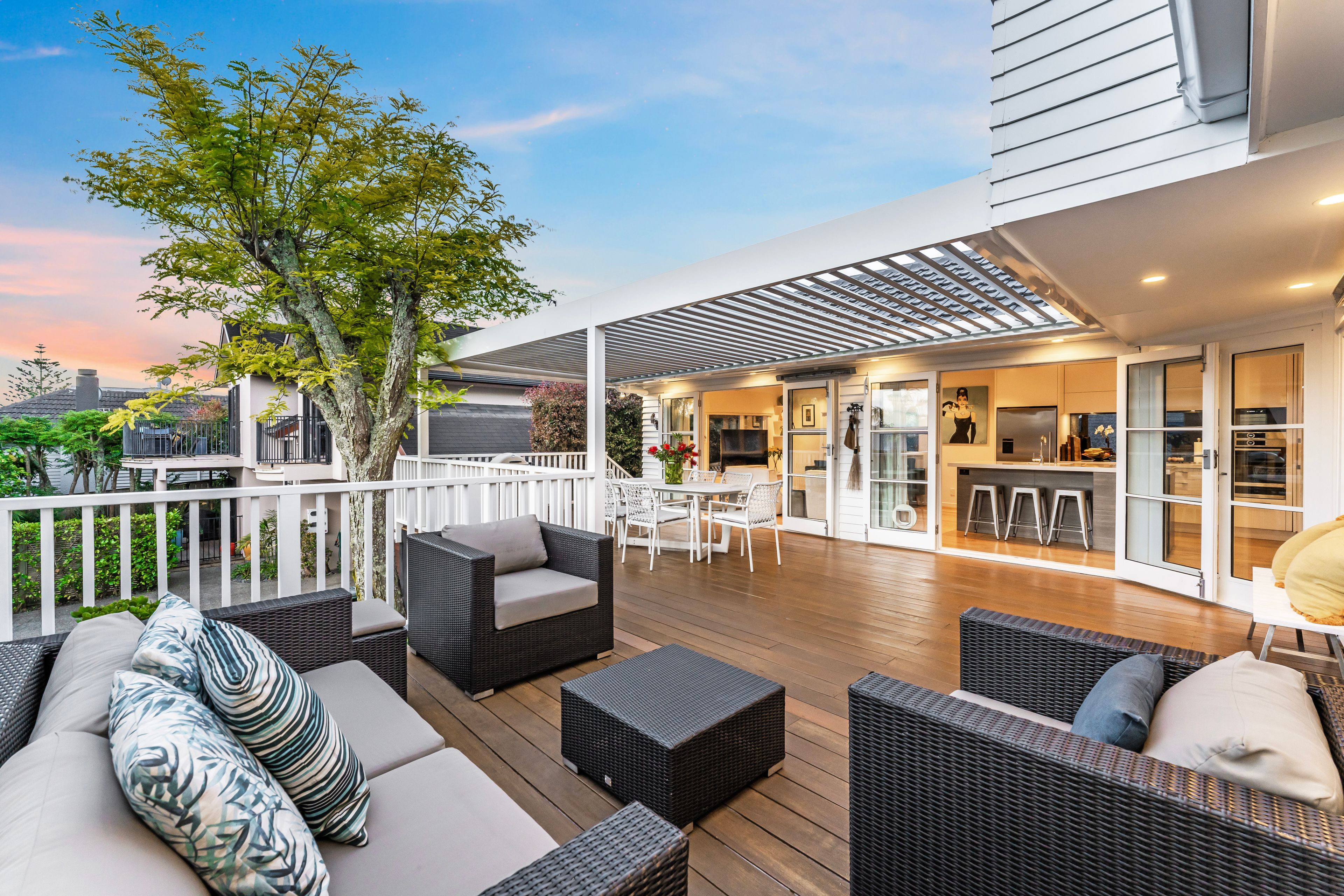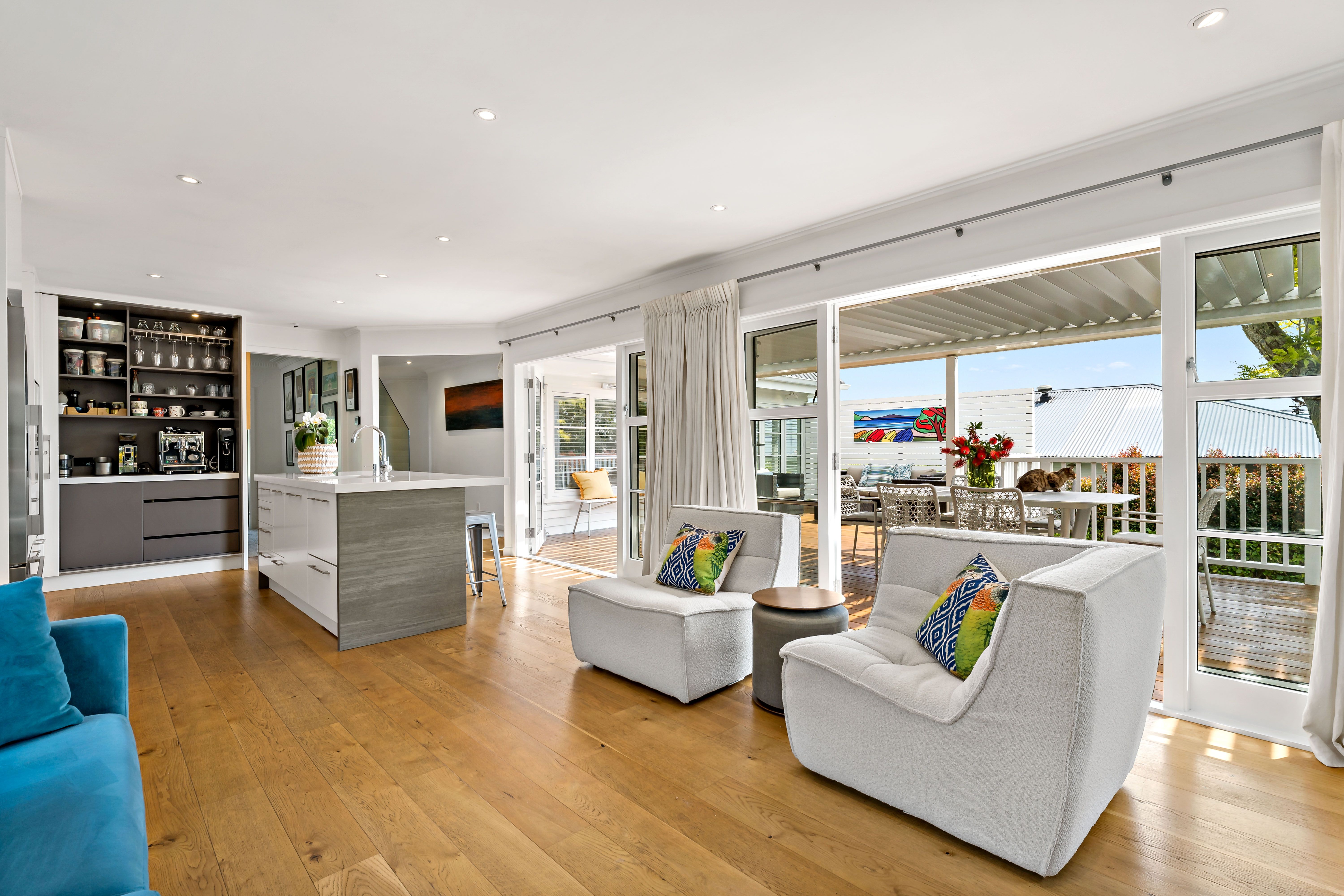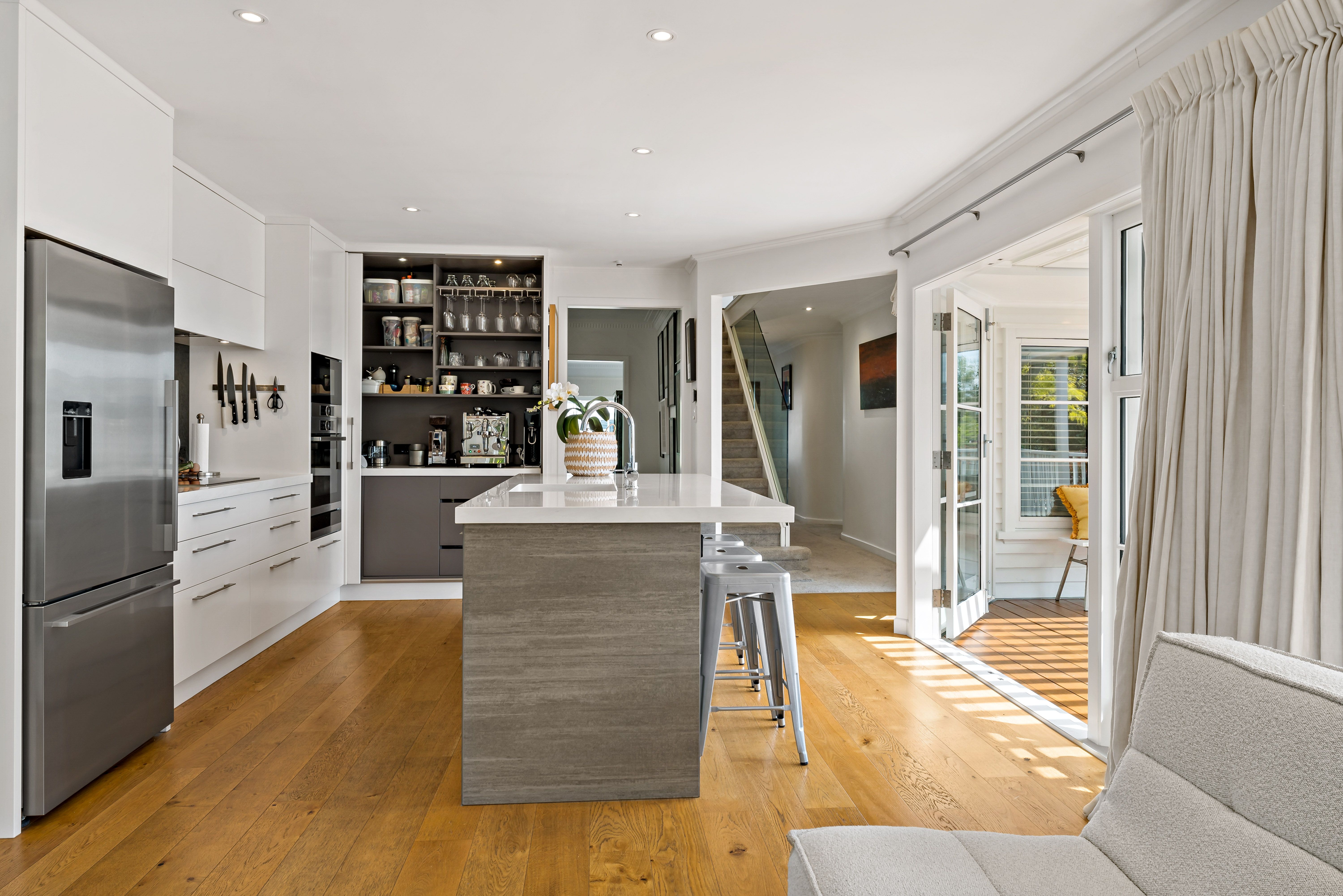 The layout is ideal, starting with a custom kitchen that sits at the heart of the home, perfect for entertaining. A central island serves as a focal point, while a cleverly designed alcove provides storage for wine and champagne glasses for gatherings and a coffee machine to kick-start your mornings. The cosy adjacent living space is perfect for everyday lounging and opens beautifully to louvretec-covered, northwest-facing decks, offering views of the Sky Tower-ideal for year-round gatherings with family and friends.