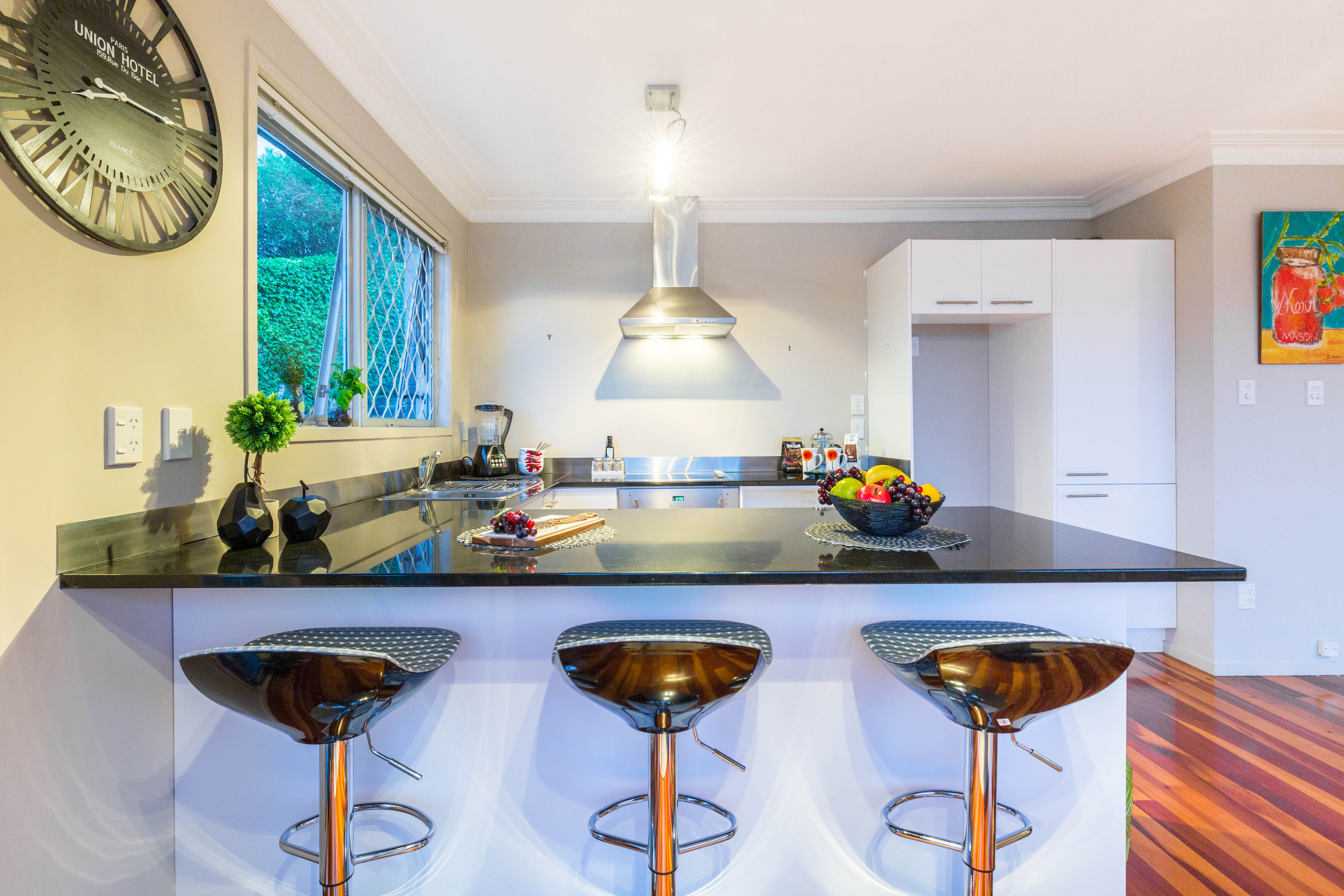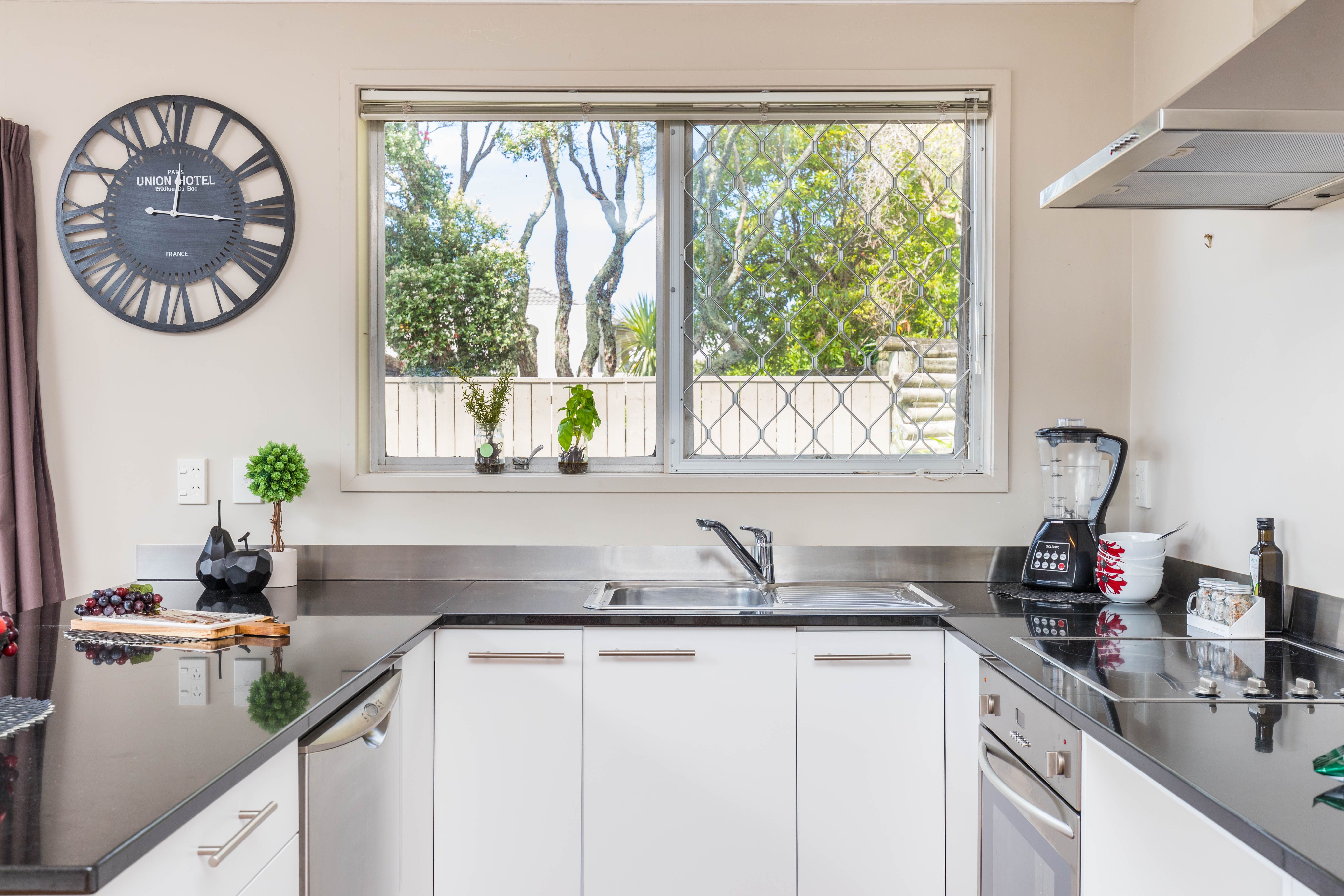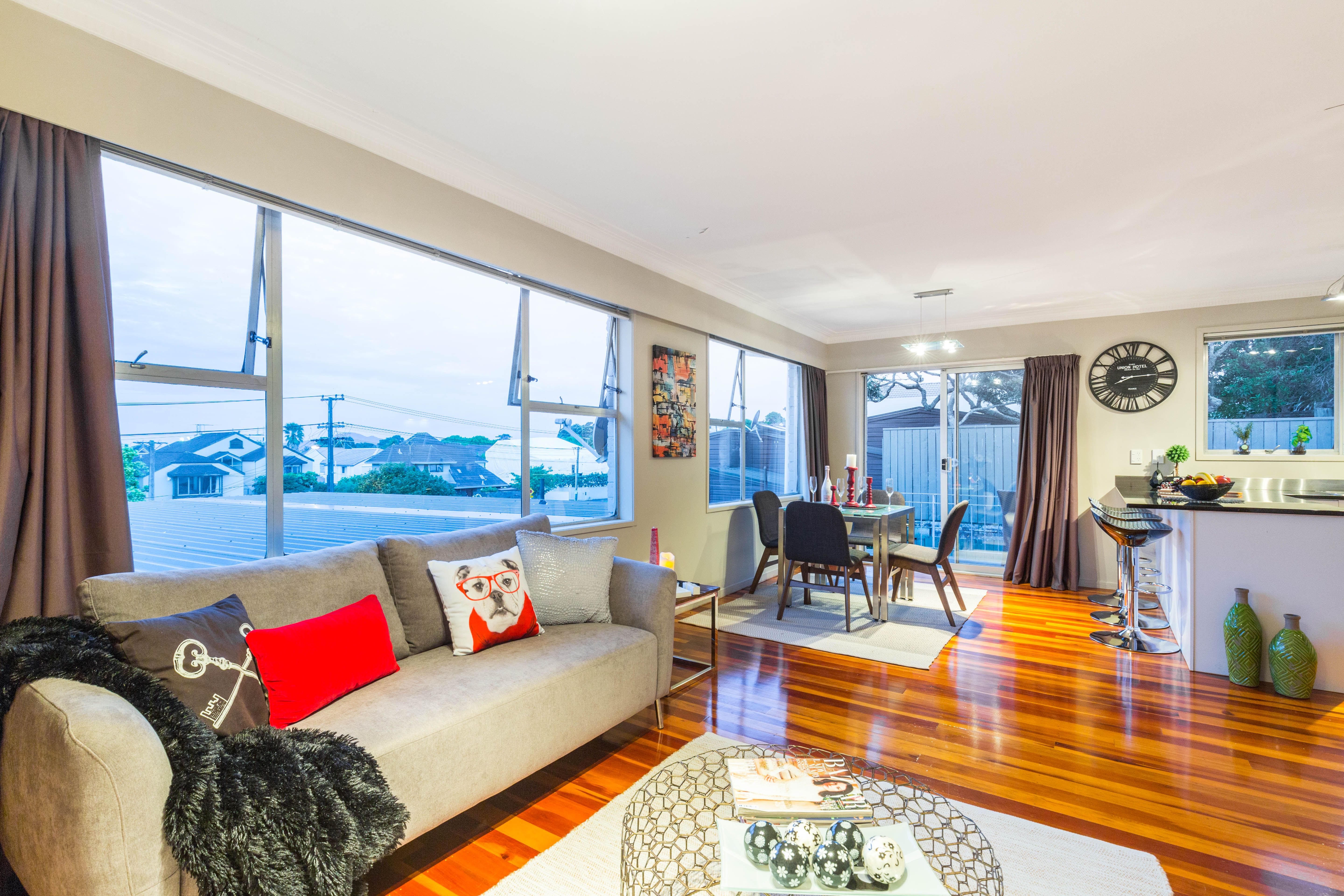 This 1960's property built of solid materials has stood the test of time and still looks great with the original wooden floors. It has a large modern open plan kitchen with granite benches, dining area and lounge where you can look out over the roof tops to Rangitoto. A northern aspect means you are bathed in all day sunshine and you can step out onto a deck to sit and relax with a gin and tonic and watch the amazing sunsets this location offers.