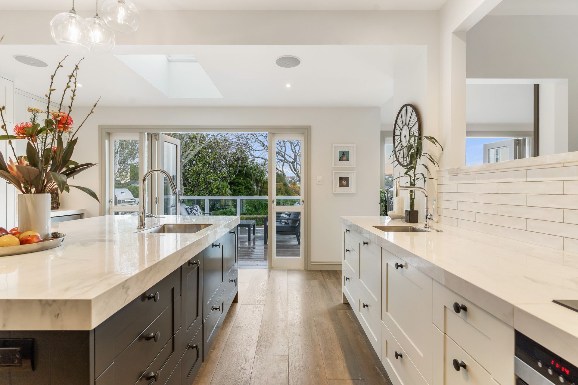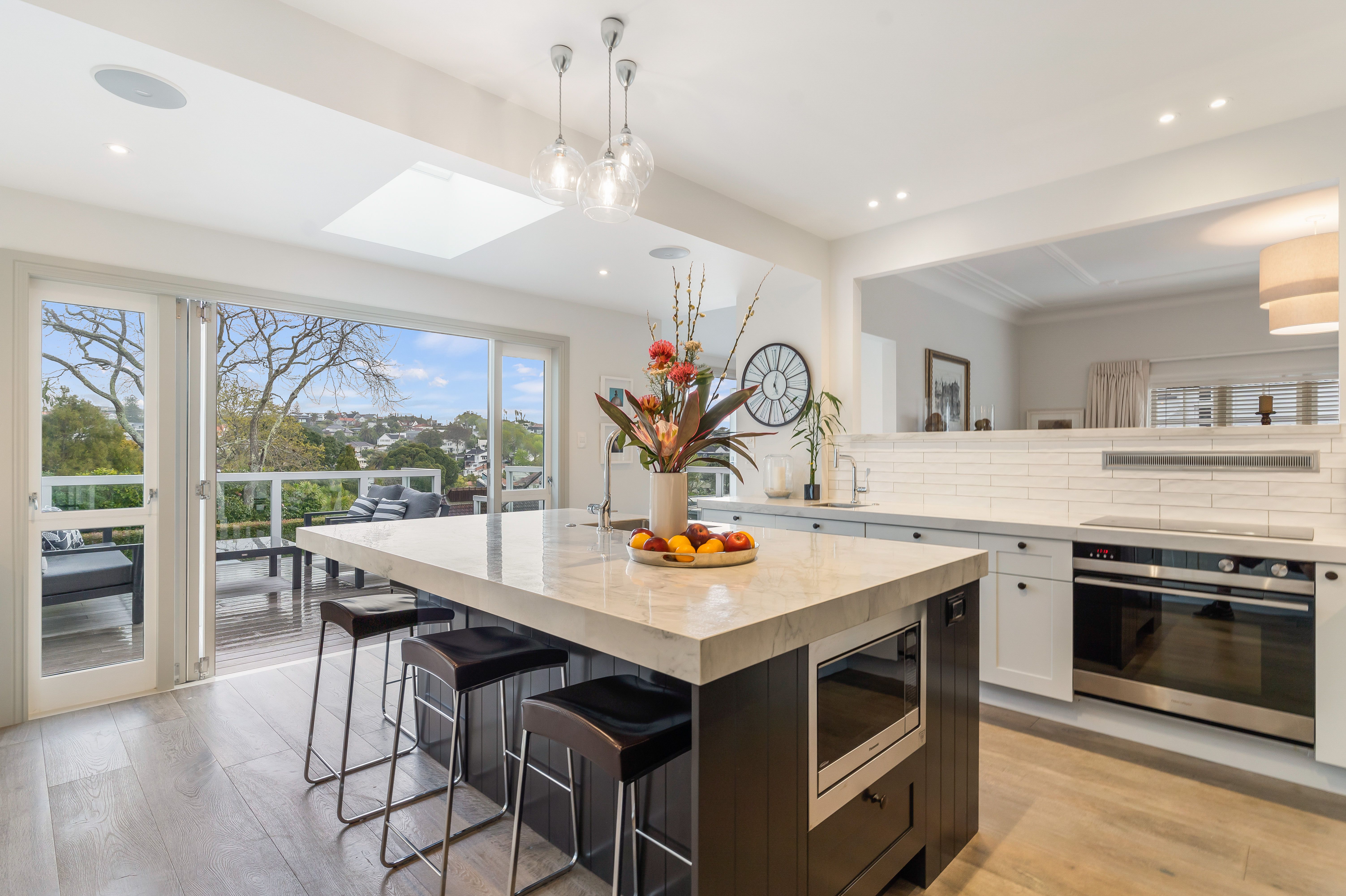 Enjoy family dinners in the designer kitchen which flows out onto a large west-facing patio and lower deck, promising plenty of afternoon sunshine.