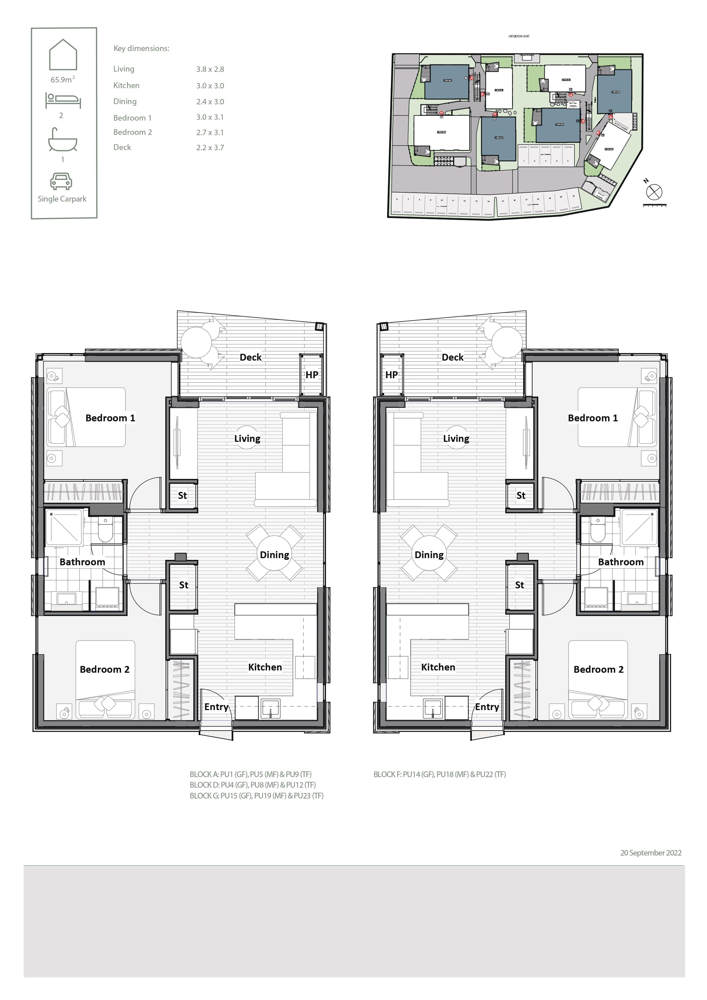 The 65.9sqm (more or less + deck) layout spans across a single level and features two double bedrooms with large built-in wardrobes and a bathroom fit with a cleverly designed laundry space to assist both rooms. The kitchen is a highly functional culinary hub with the kitchens being visual highlights, finished with soft-close drawers, stone benchtops, a stainless-steel sink and a range of appliances, easing through to the dining area and lounge, expanding to a dedicated deck to complete the layout.