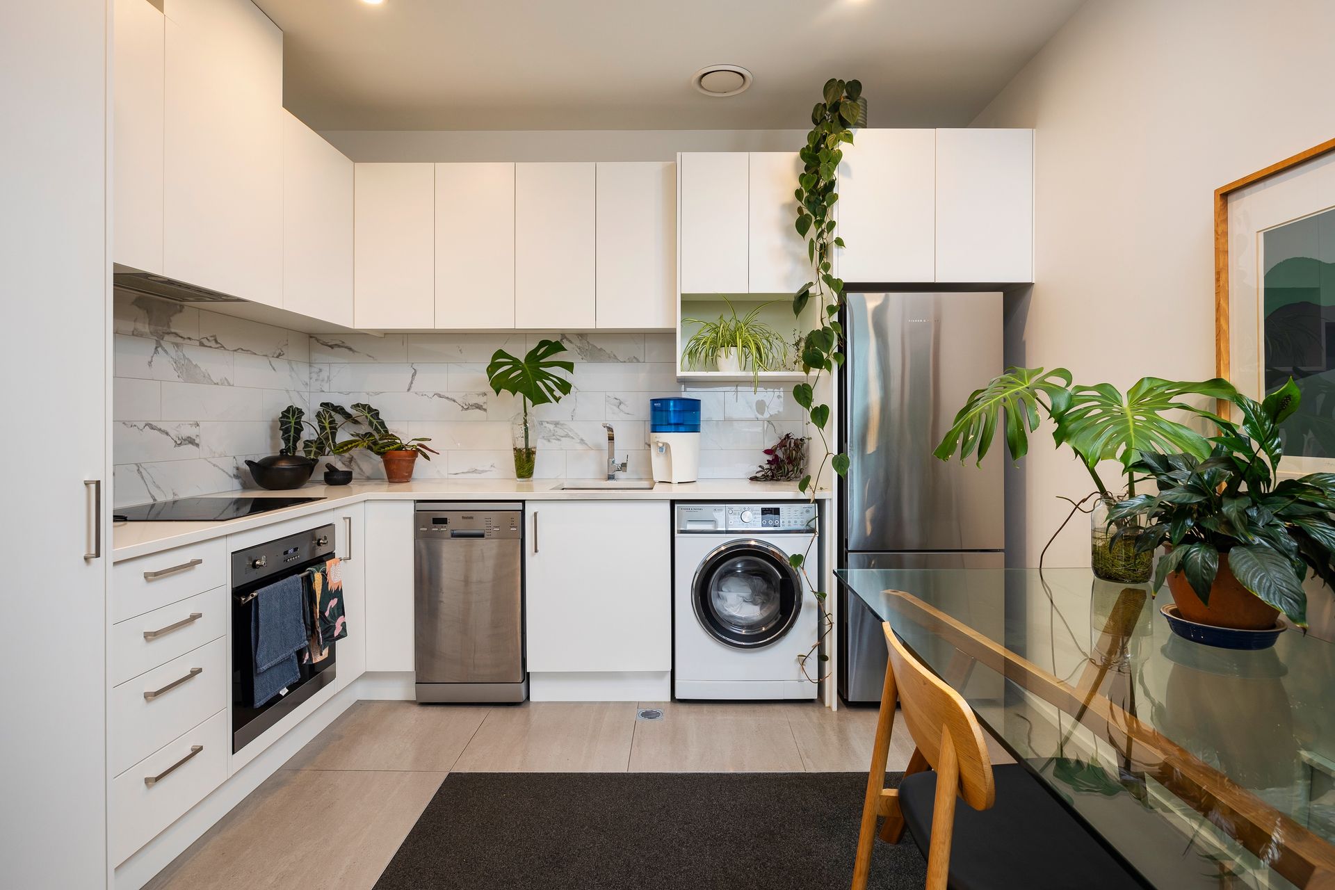 · F&P appliance set including a fridge-freezer, dishwasher, induction cooktop, rangehood & Oven.