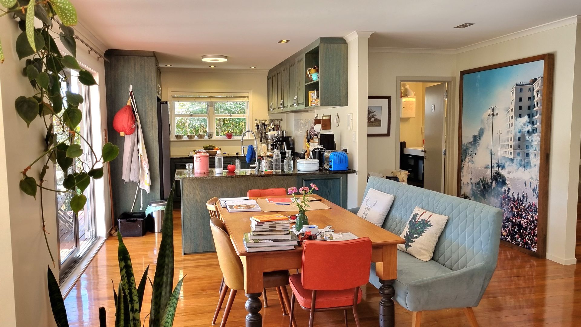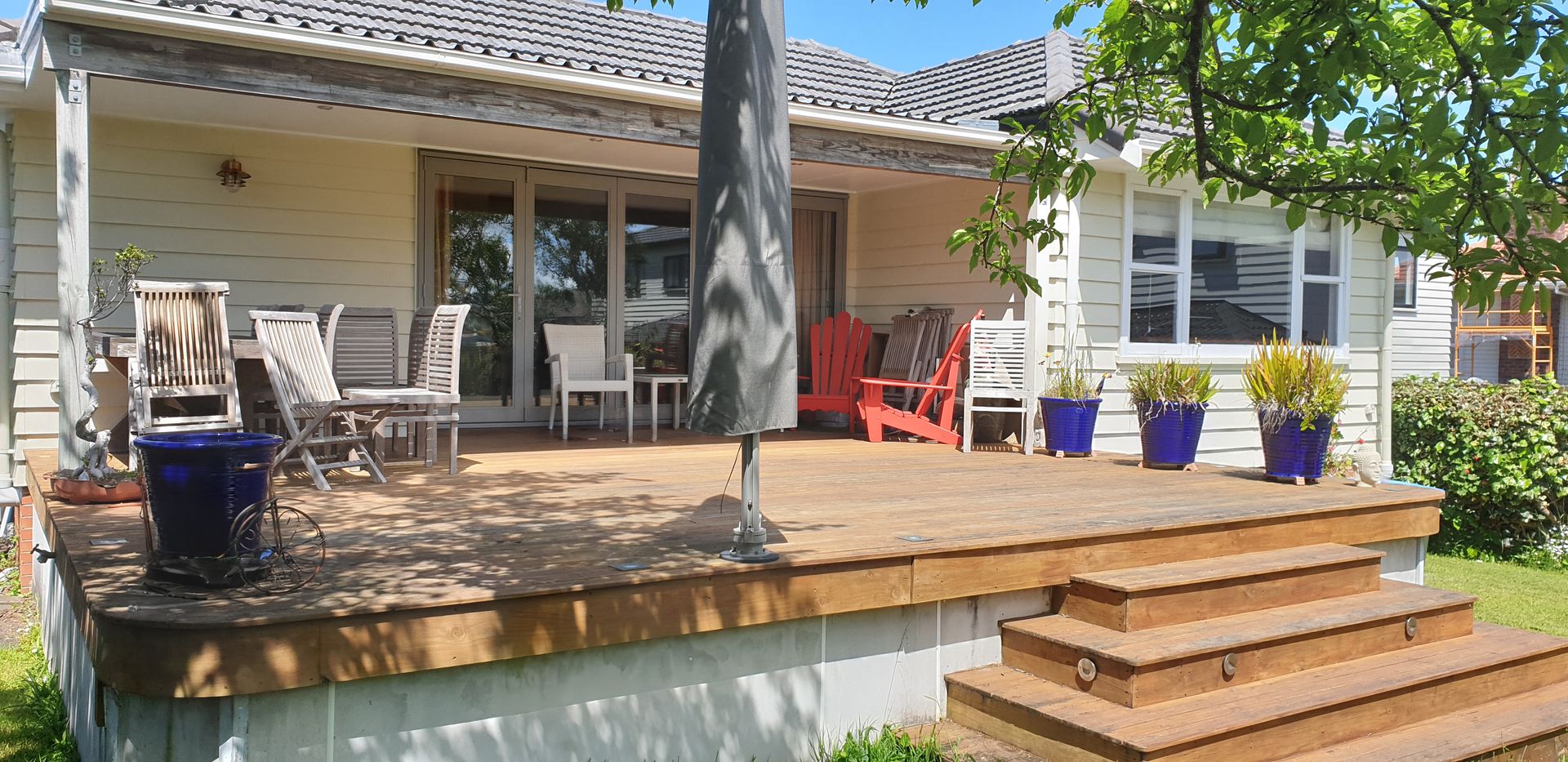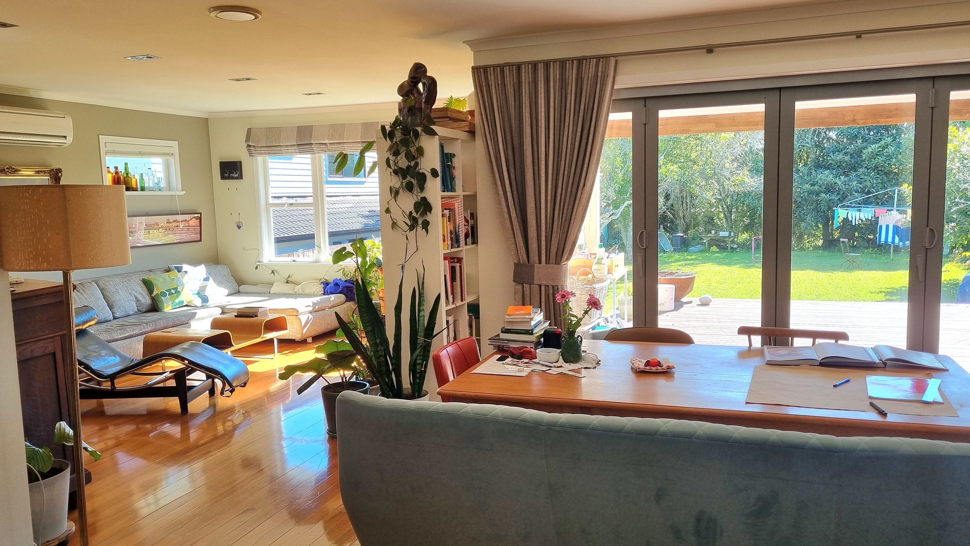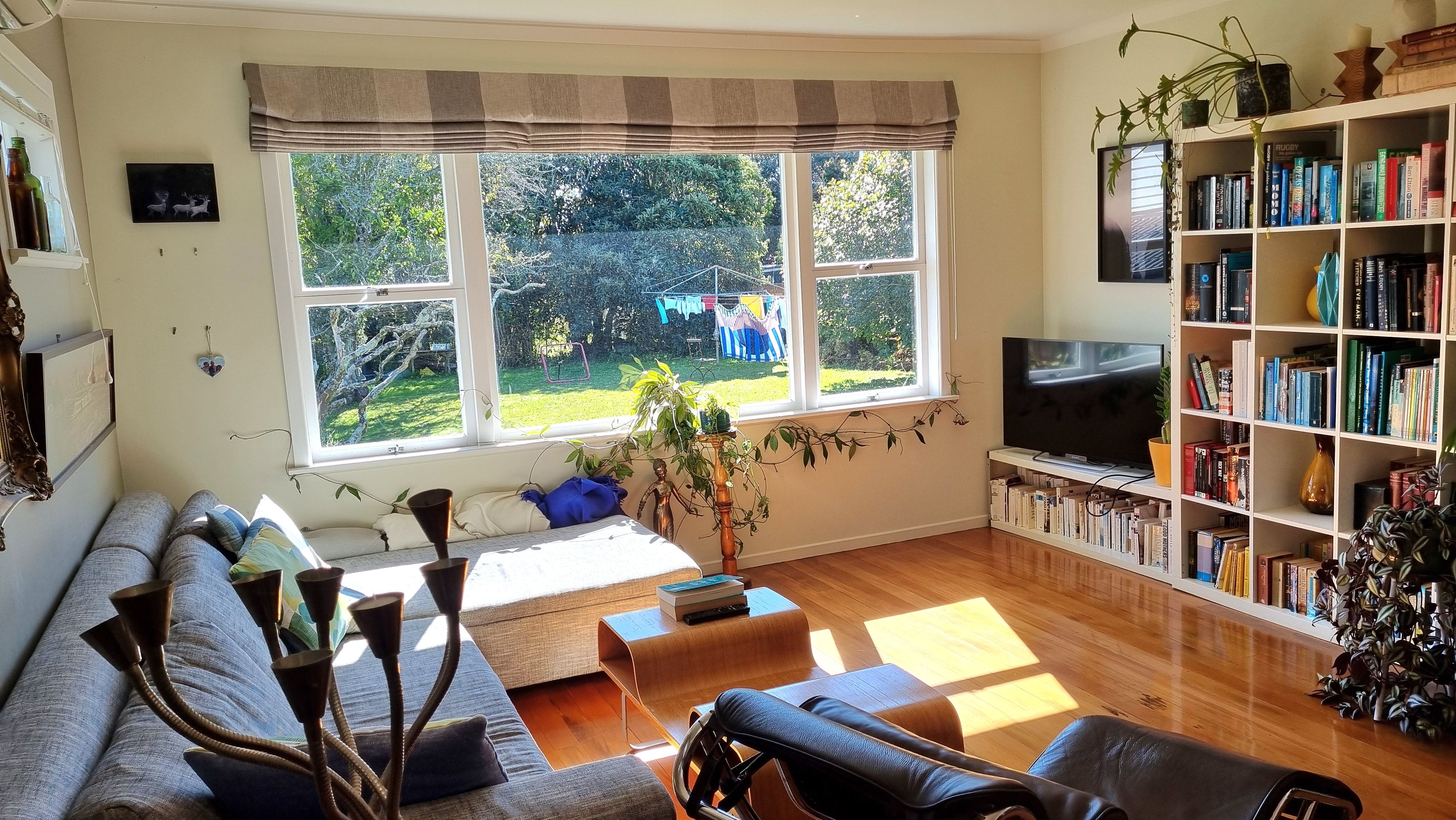 The open plan living is at the rear of the house and opens out on to the north facing deck, lawn and garden. Plenty of outdoor space for kids to run around.