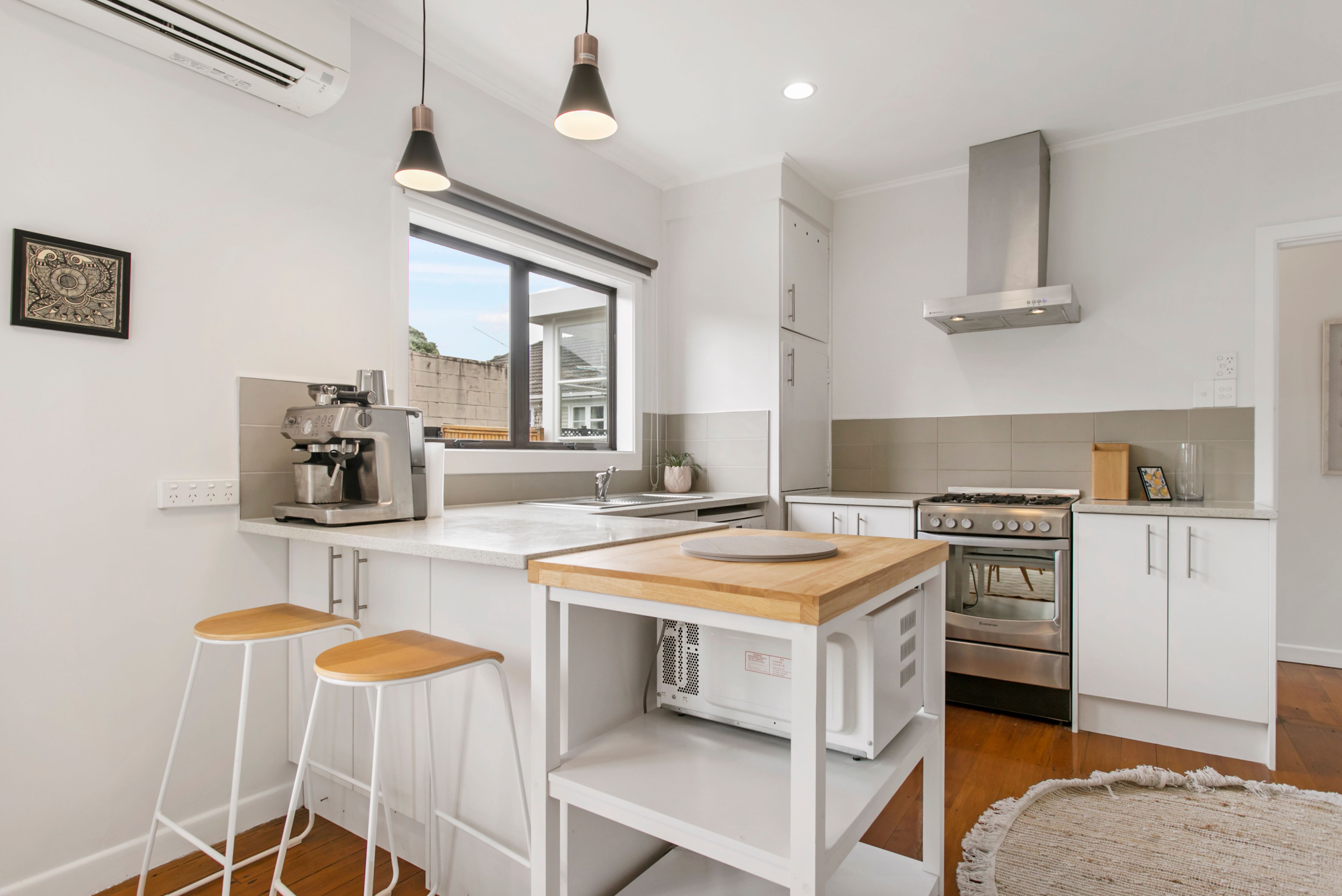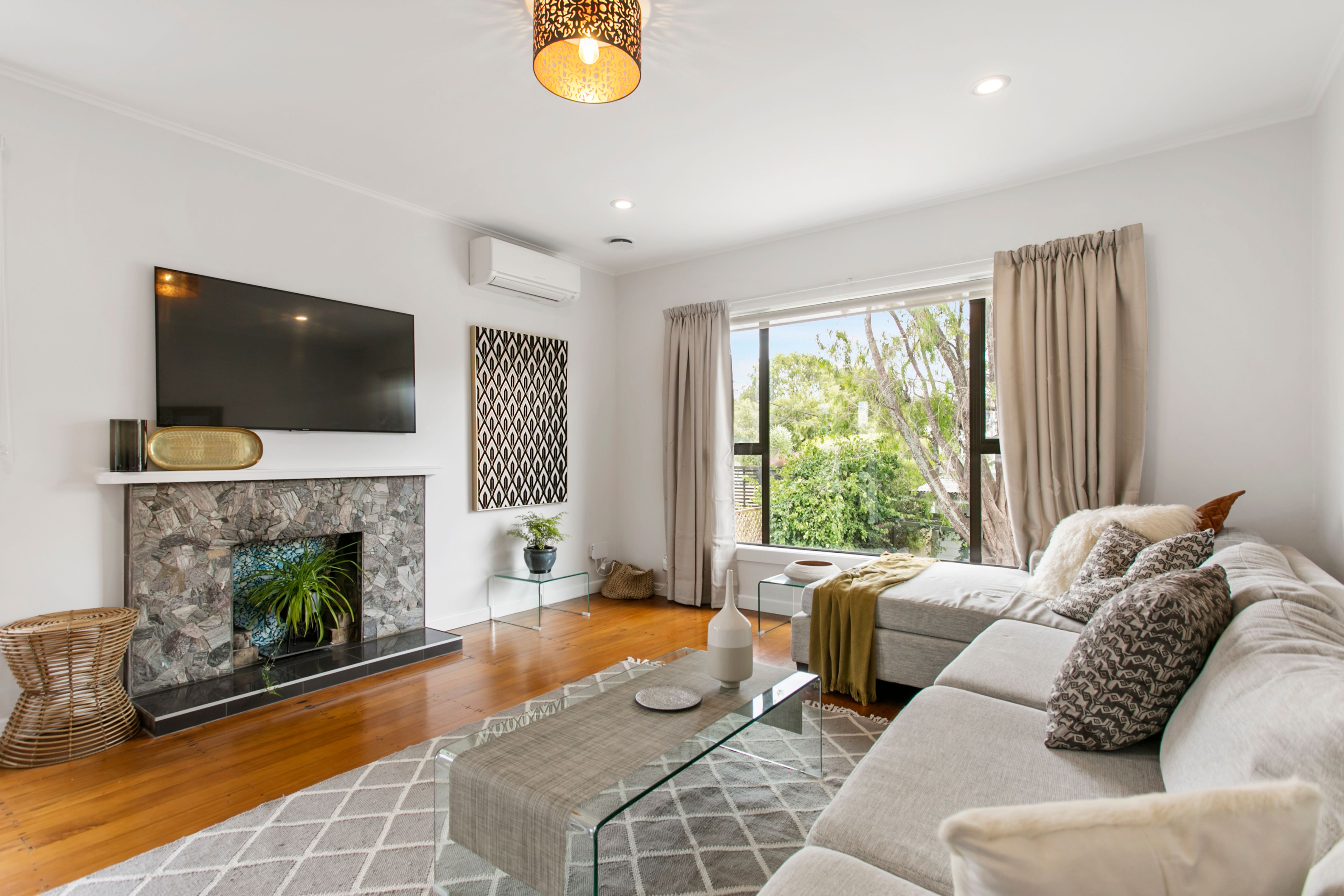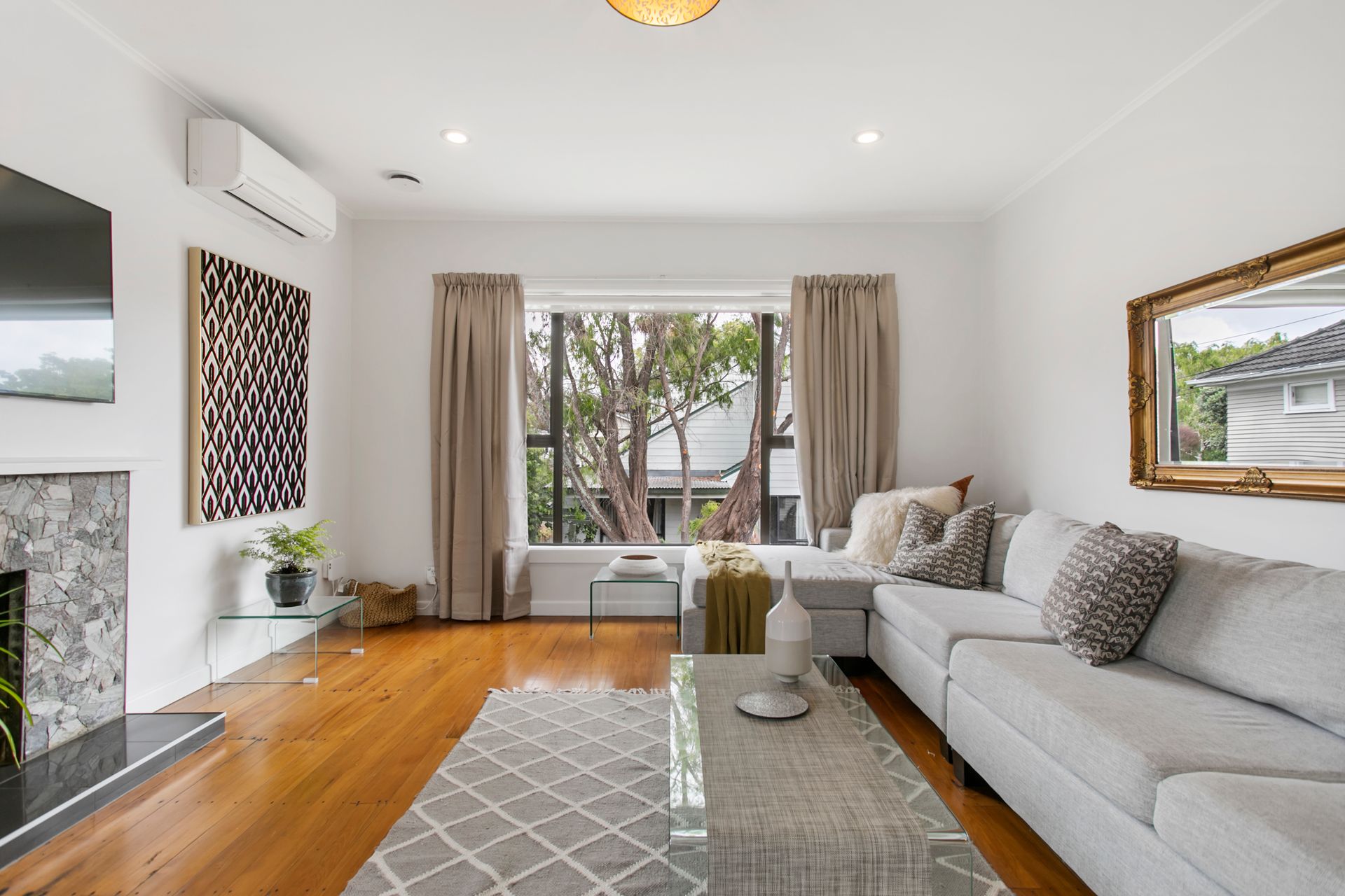 - Native timber flooring anchors a neutrally toned interior decor with large picture windows, soft drapes, and modern fittings throughout including multiple heat pumps