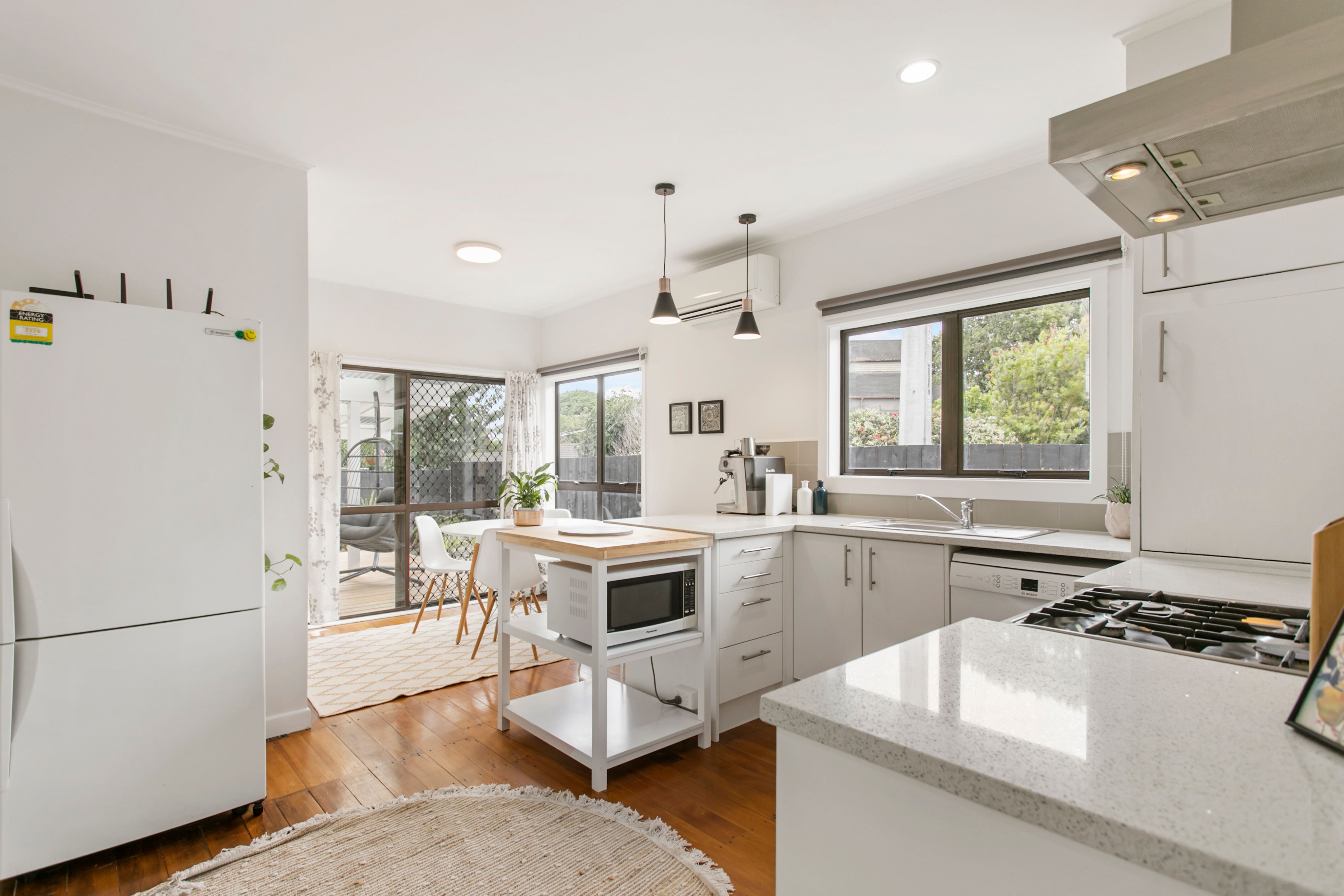 - An open plan dining area shares the space with a beautifully renovated kitchen featuring composite stone benches modern appliances and white cabinetry