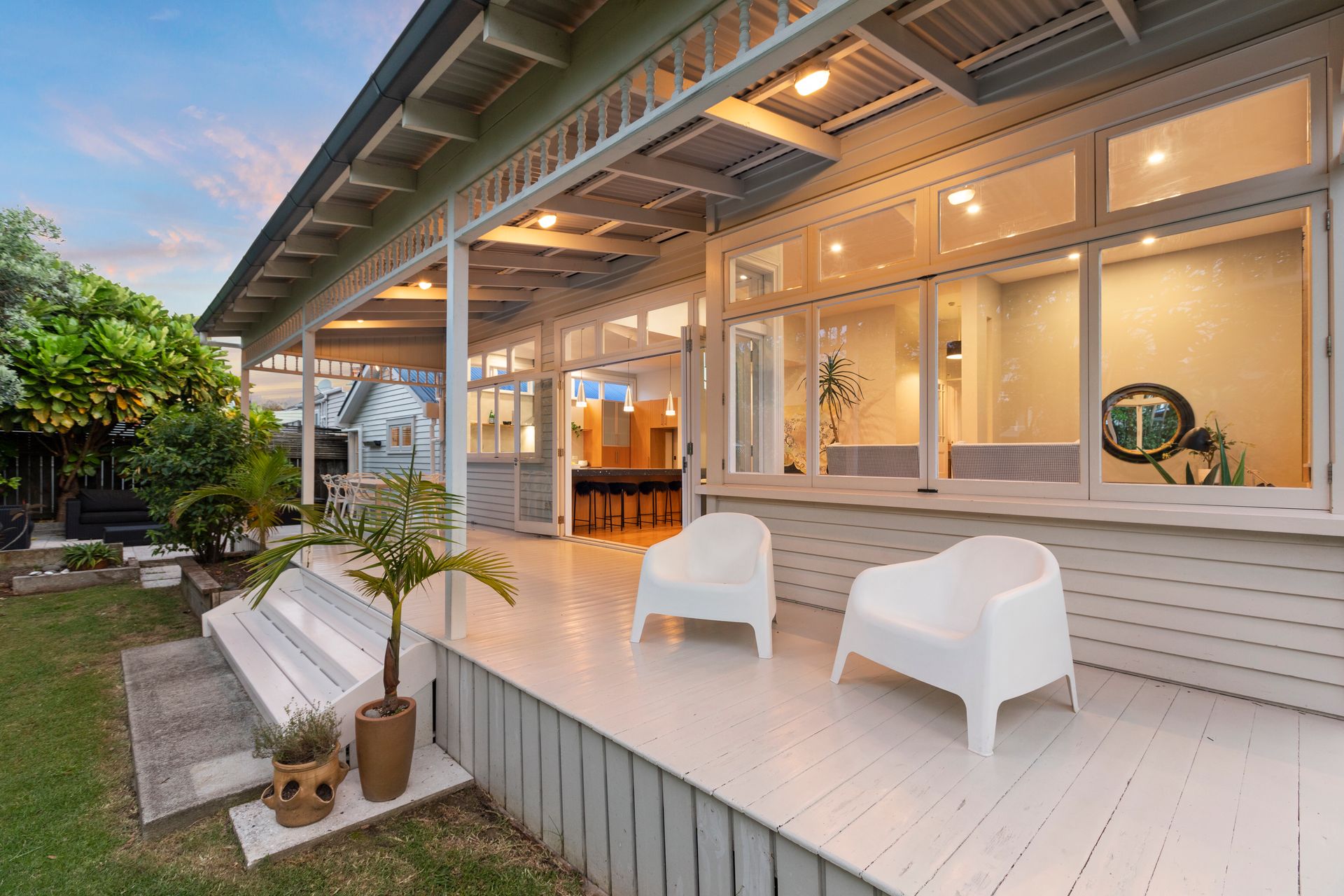 A desirably detailed kitchen and light-filled living and dining zone sit privately at the back of the floor plan, featuring a generous selection of windows as well as a sizeable bi-fold door that effortlessly engages with the classic verandah.