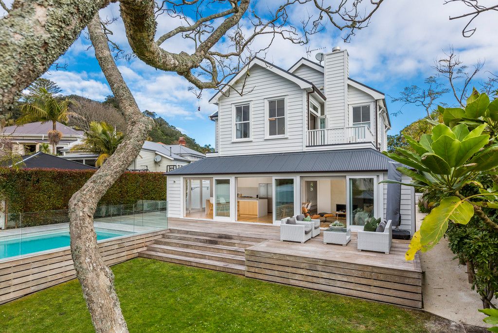 Upstairs the separate master suite enjoys a spacious walk-in wardrobe, elegant ensuite and private balcony with expansive west-facing views, the perfect spot to enjoy a glass of wine as the sun sets over the Waitakeres. There are four more generous double bedrooms, two further luxurious bathrooms, kitchen scullery, spacious laundry, plus double internal access garage. Copious storage is also catered for, with built in robes in each bedroom and attic storage accessed from both the home's upper level and garage.