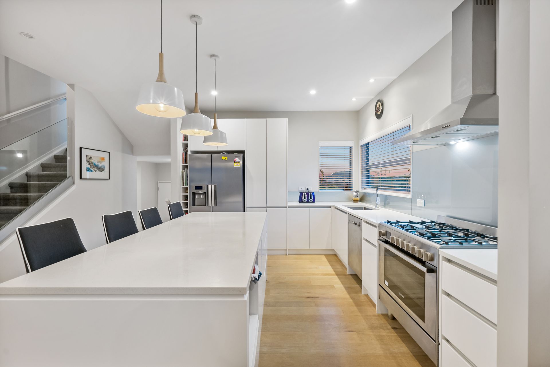 gourmet gas hob, engineered stone benchtops and island.