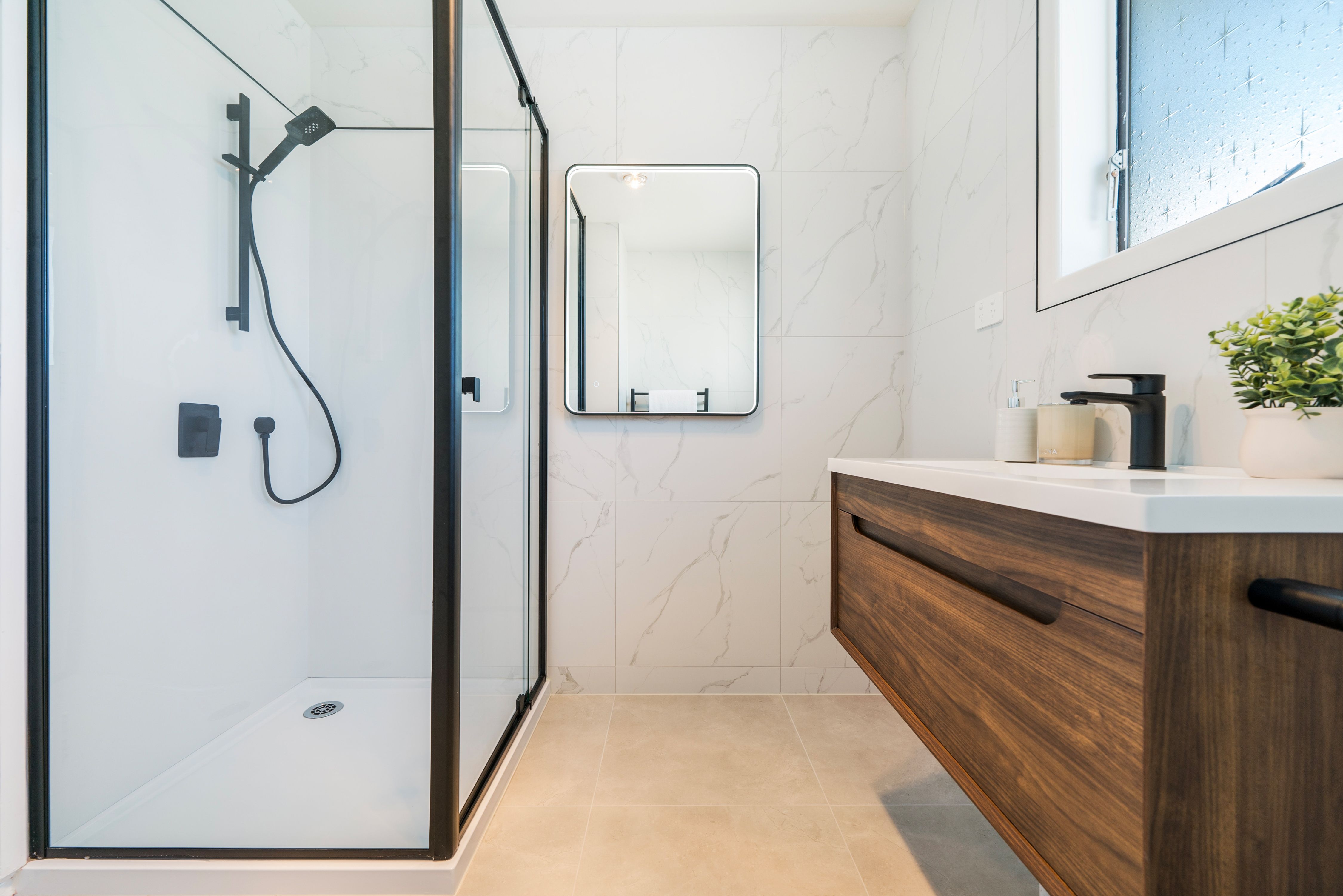 Modern Bathroom - Enjoy a contemporary bathroom with a walk-in shower, LED vanity mirror, heated towel rail, and built-in exhaust fan for your comfort and safety.