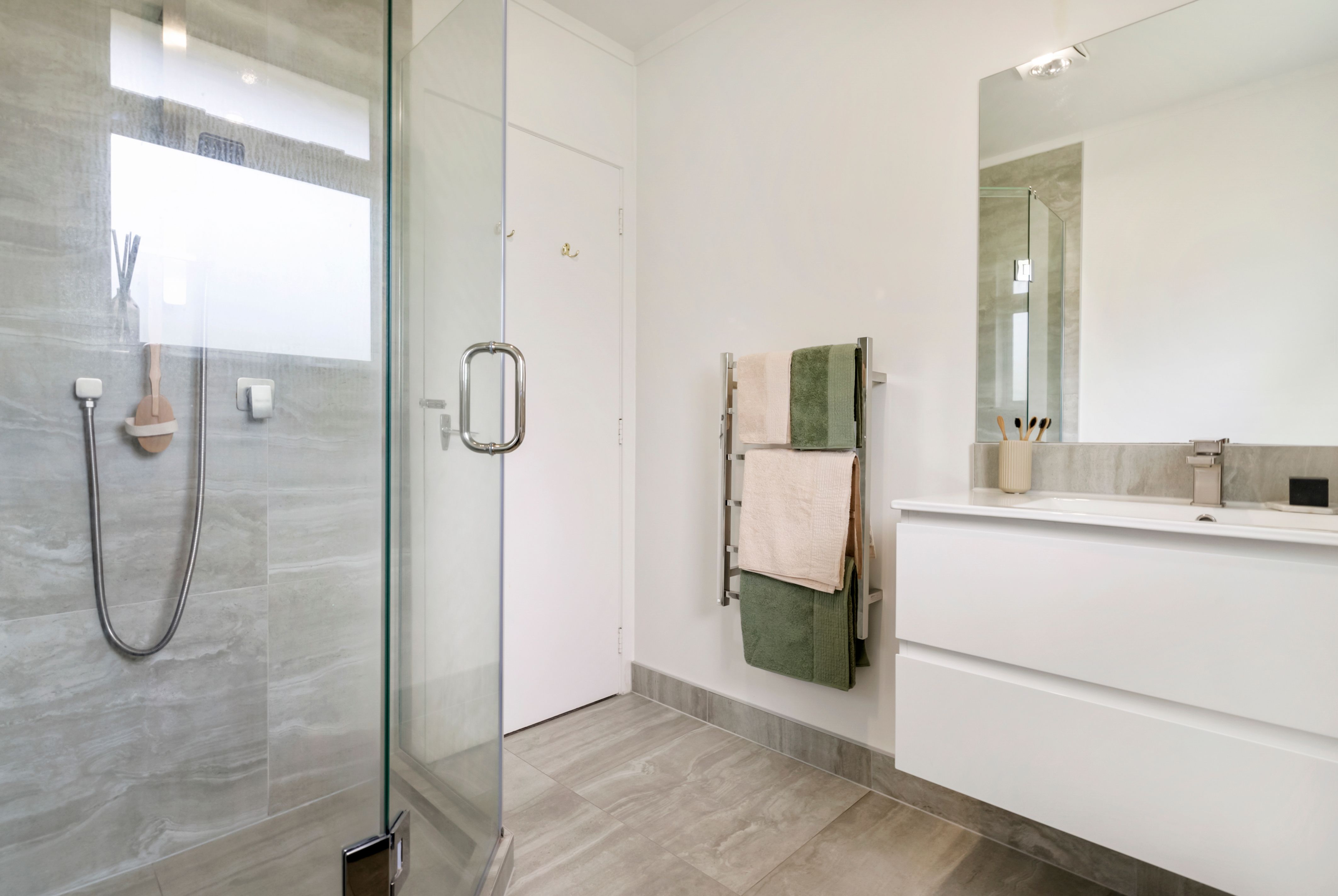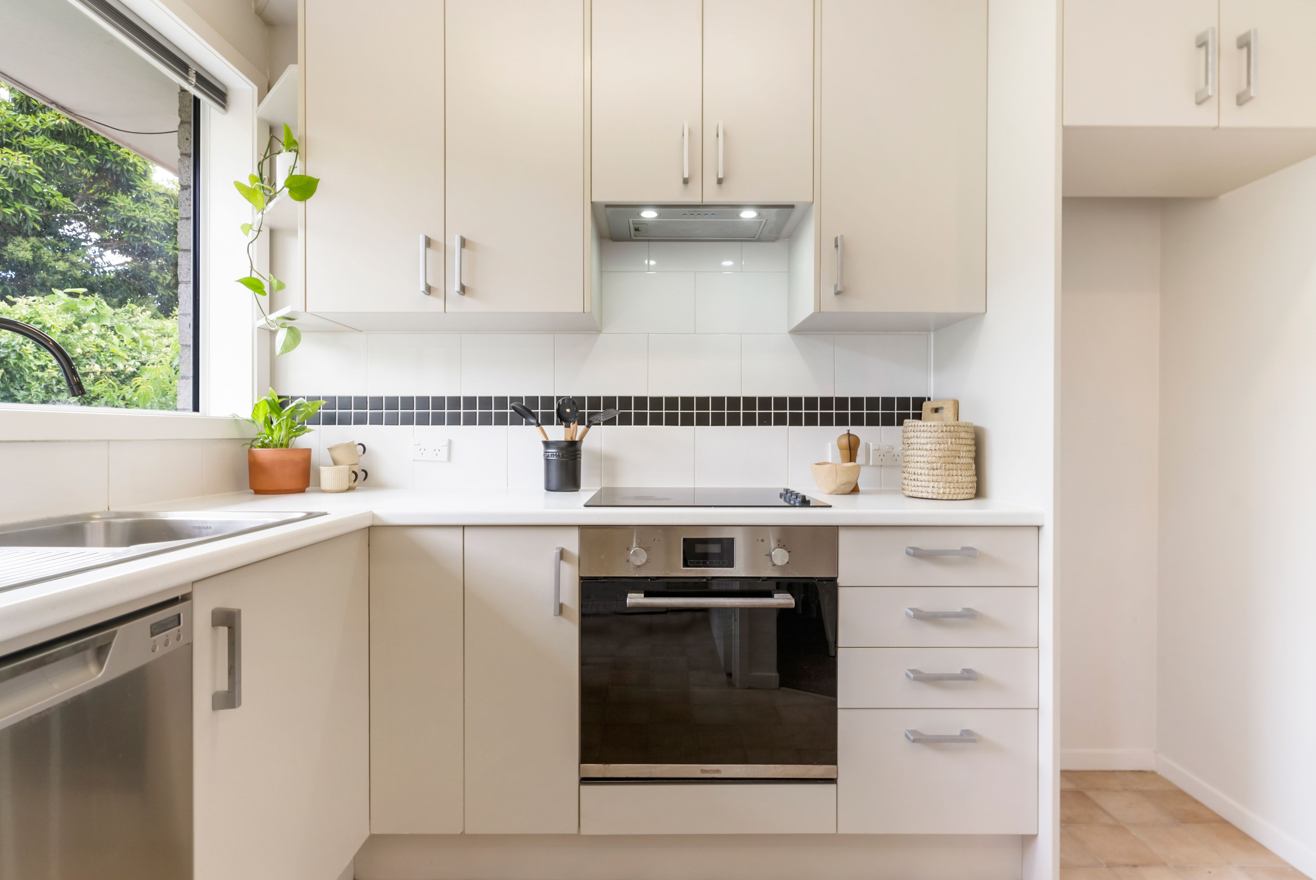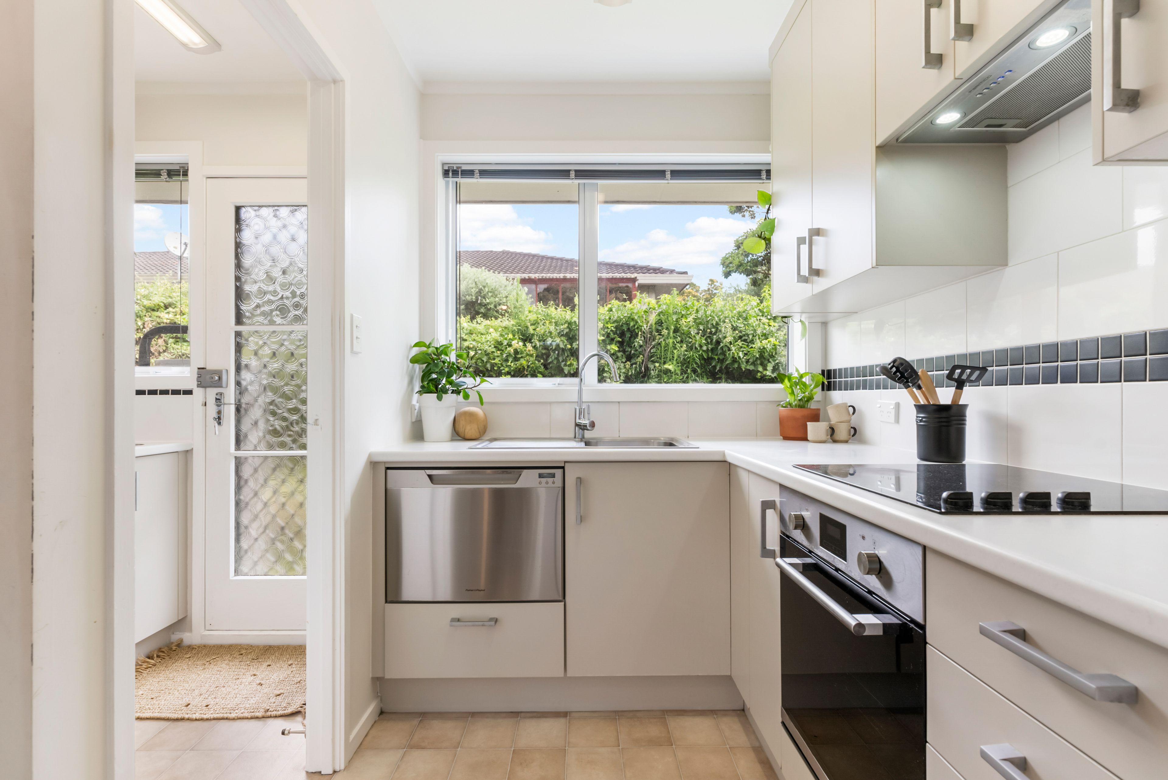 Recently treated to a substantial upgrade, the insulated and double-glazed interior has been freshly repainted in agreeable neutral tones. All this underpinned by new carpets while new drapes and blinds create a ready made setting for folk who are keen to just move in and relax. The front door opens into a spacious open plan lounge fitted with wall mounted heat pump and allocated nook for the dining suite. Alongside this, a newly installed kitchen has pleasant greenery aspect and boasts lots of cabinetry, stainless steel appliances and tiled splash back. The laundry in the back door foyer is another recent upgrade and offers abundant storage cupboards, benchtop, and smart white wall tiles with black mosaic inserts. Two double bedrooms share a brand-new tiled bathroom with extractor fan, heated towel rail and elegant frameless glass tiled shower stall complete with recessed storage.