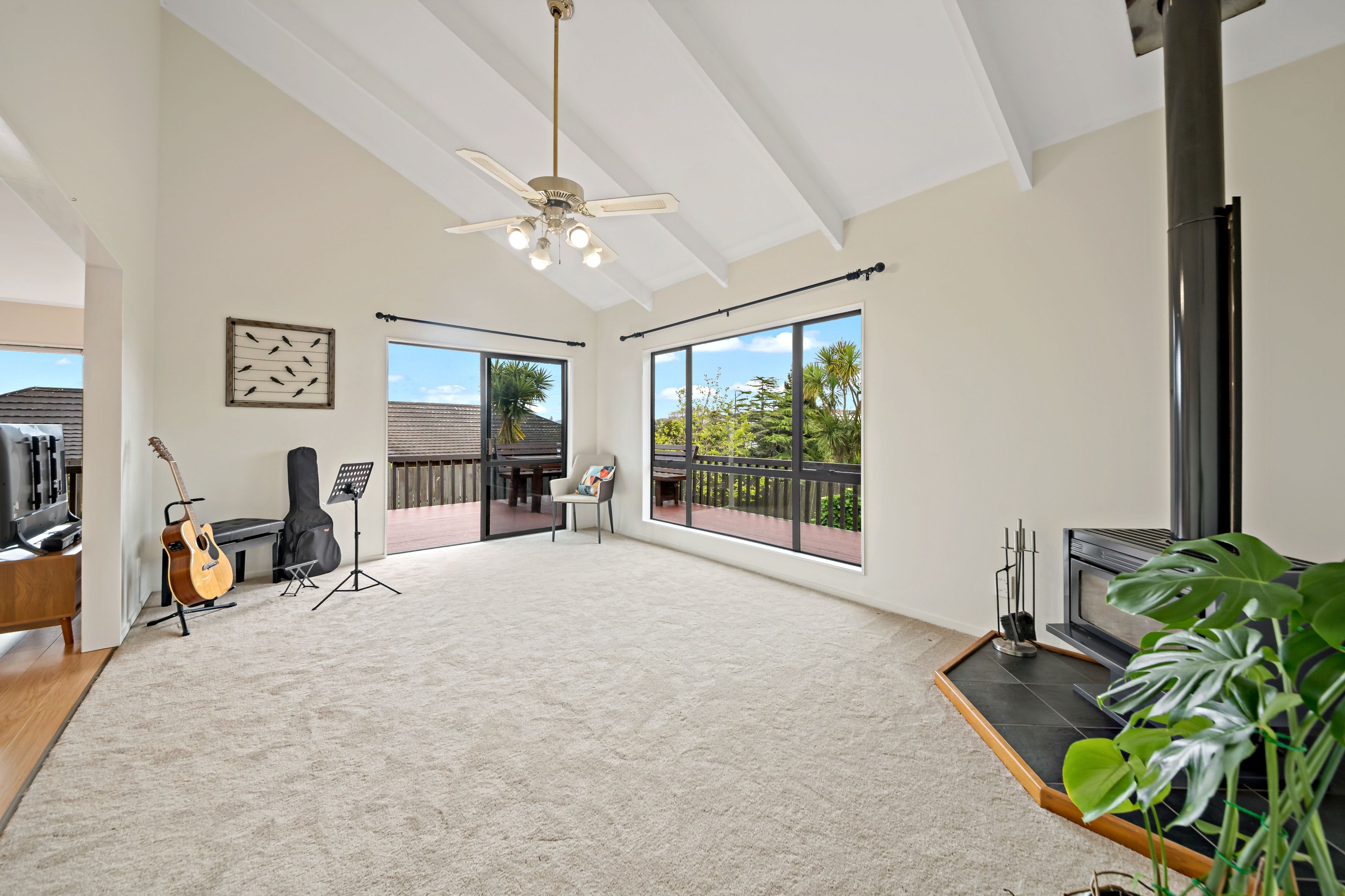 The split-level layout will be welcomed by parents who are keen to put some space between themselves and noisy teenagers! High raked ceilings soar above a spacious formal living room with quality carpeting underfoot while the log burner and breezy ceiling fan maintain year-round comfort. Ranch sliders provide easy access to the enormous wraparound deck with urban vistas also accessed from the adjacent family lounge and dining area. Set up the barbecue, outdoor dining suite, bean bags and kick back to have the summer of your life with room for all comers to savour your hospitality. The stylish kitchen with dazzling lime splashback boasts Bosch oven, composite stone benchtops, stainless steel dishwasher and trendy black tap and sink. A total of four double bedrooms each represent a distinct aspect with one having its own balcony and the master bedroom comprising a walk-in wardrobe and sensational tiled ensuite. The second bathroom echoes the same linear elegance with mosaic motif above the bathtub, wall hung vanity and frameless glass shower. There's a bonus guest powder room toilet and the spatially generous laundry has a back door to another deck.