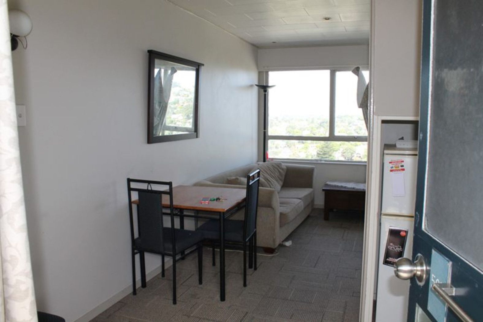 cupboard. Partially furnished with a sofa and dining table..