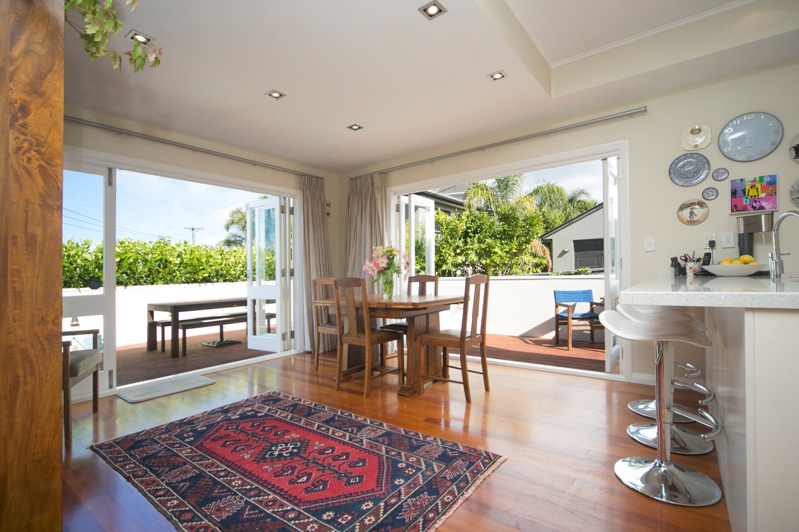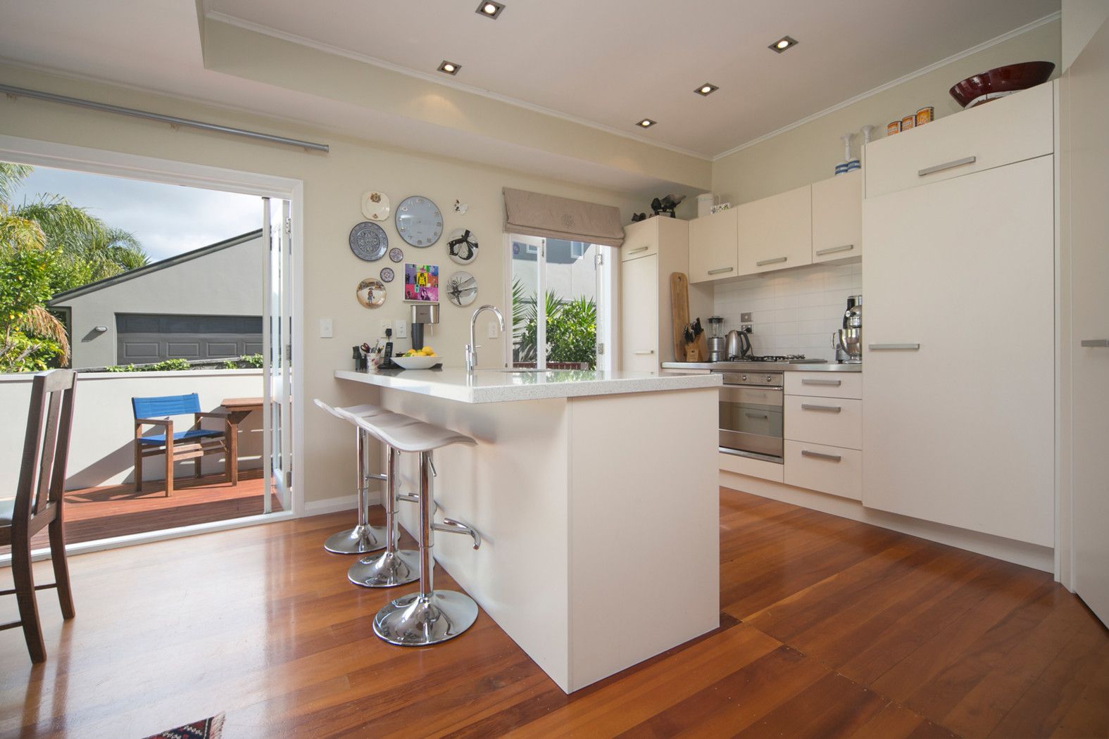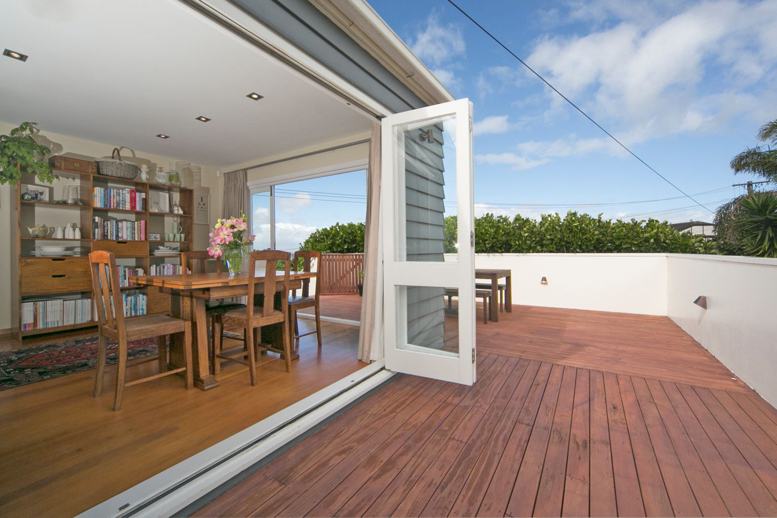 The open plan modern kitchen, dining and lounge flows to the sunny, elevated deck which has views out to the Manukau Harbour.