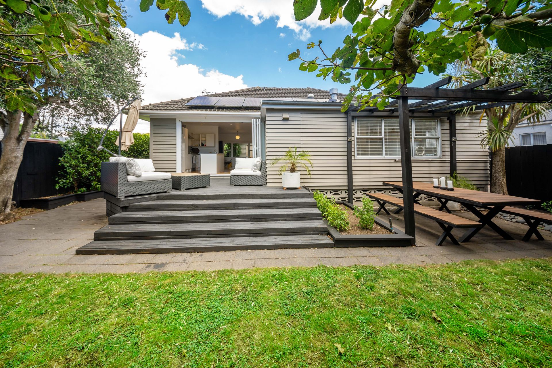 Brand new bi-fold doors open onto the north-west-facing deck, creating an ideal space for entertaining or unwinding with family and friends. The private property is adorned with low-maintenance greenery and hedging, fully fenced to provide a safe play area for children or pets.