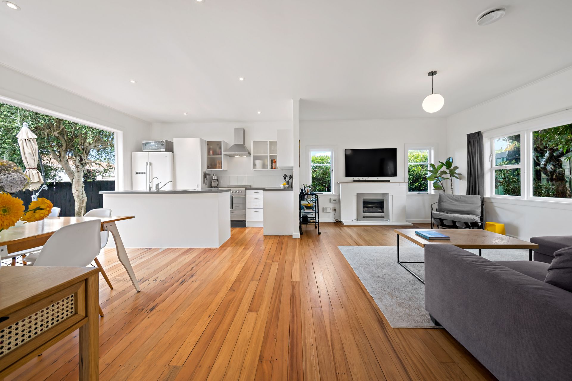 Recently painted throughout, the open-plan living, kitchen, and dining area boasts abundant natural light, complemented by gleaming polished wooden floors. The kitchen features ample cabinetry, storage space, and an island bench, catering to both cooking enthusiasts and those who love to entertain.