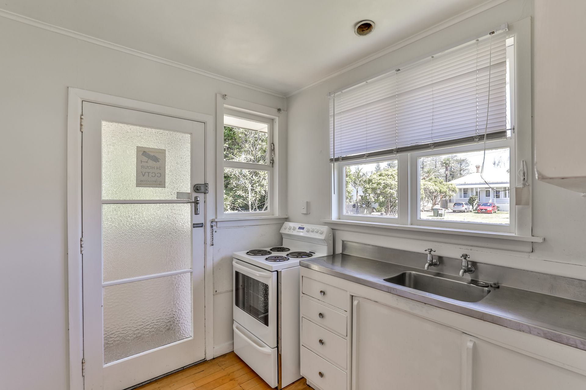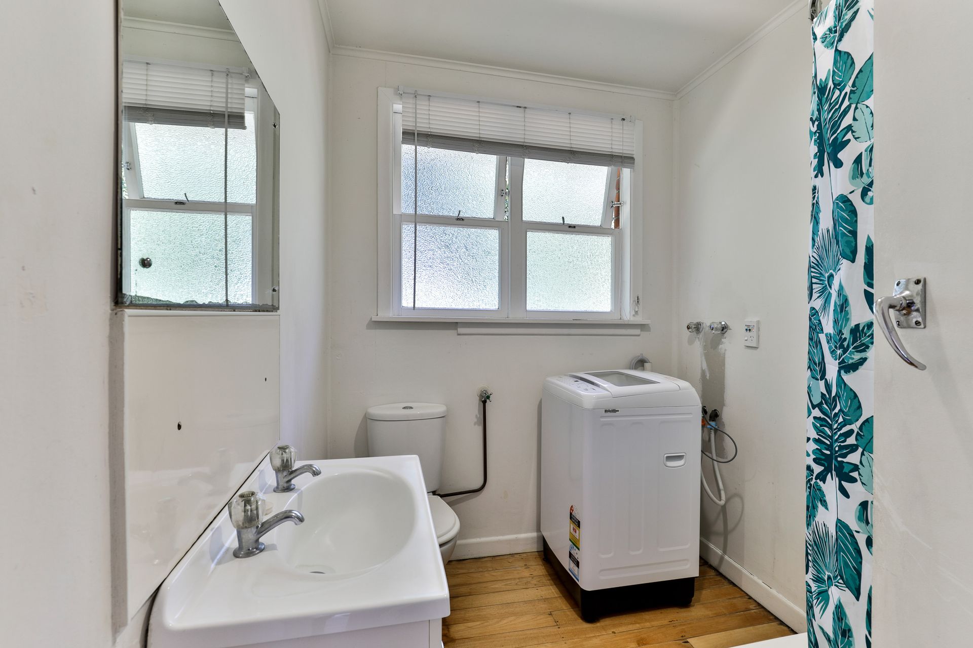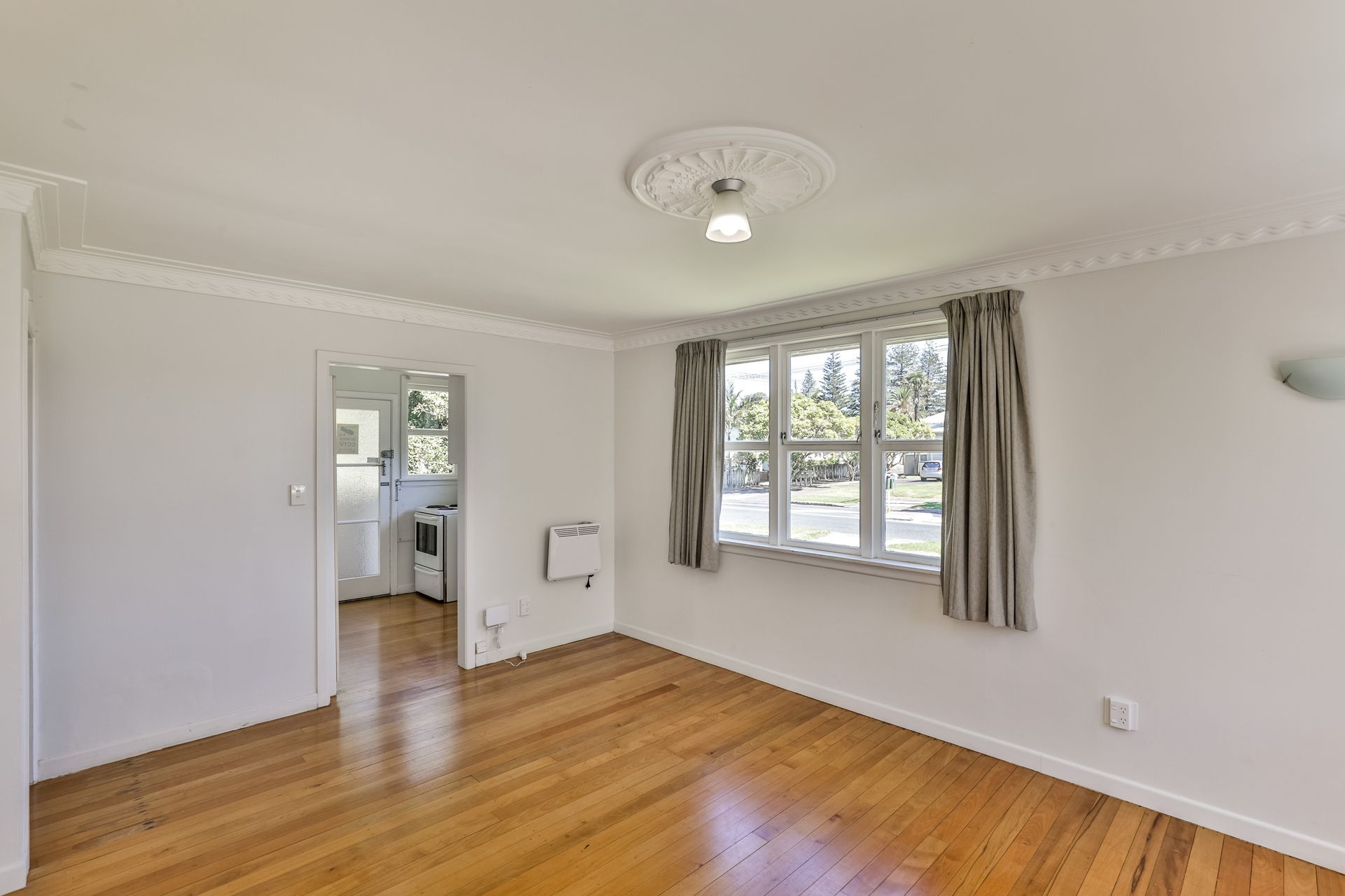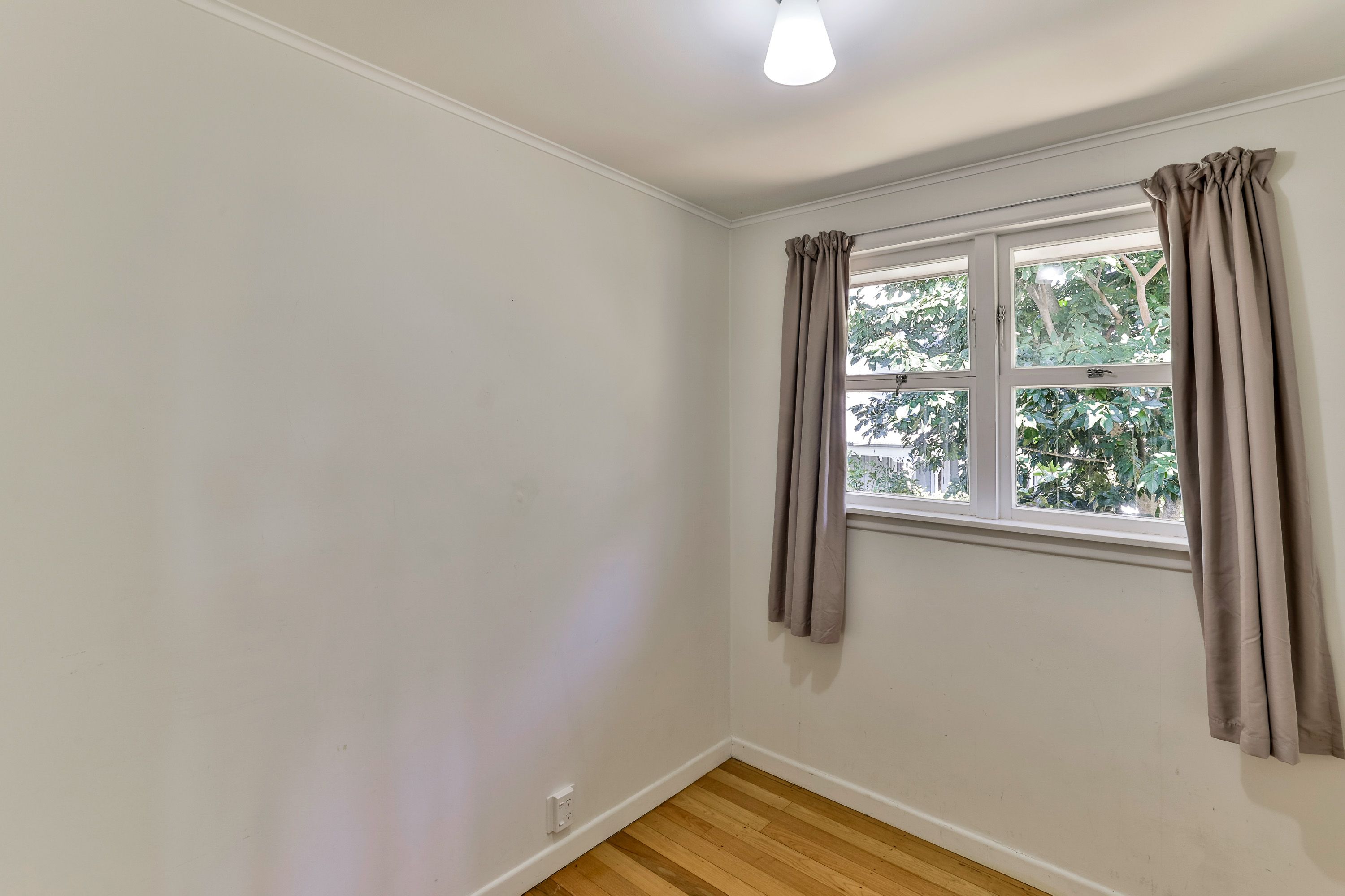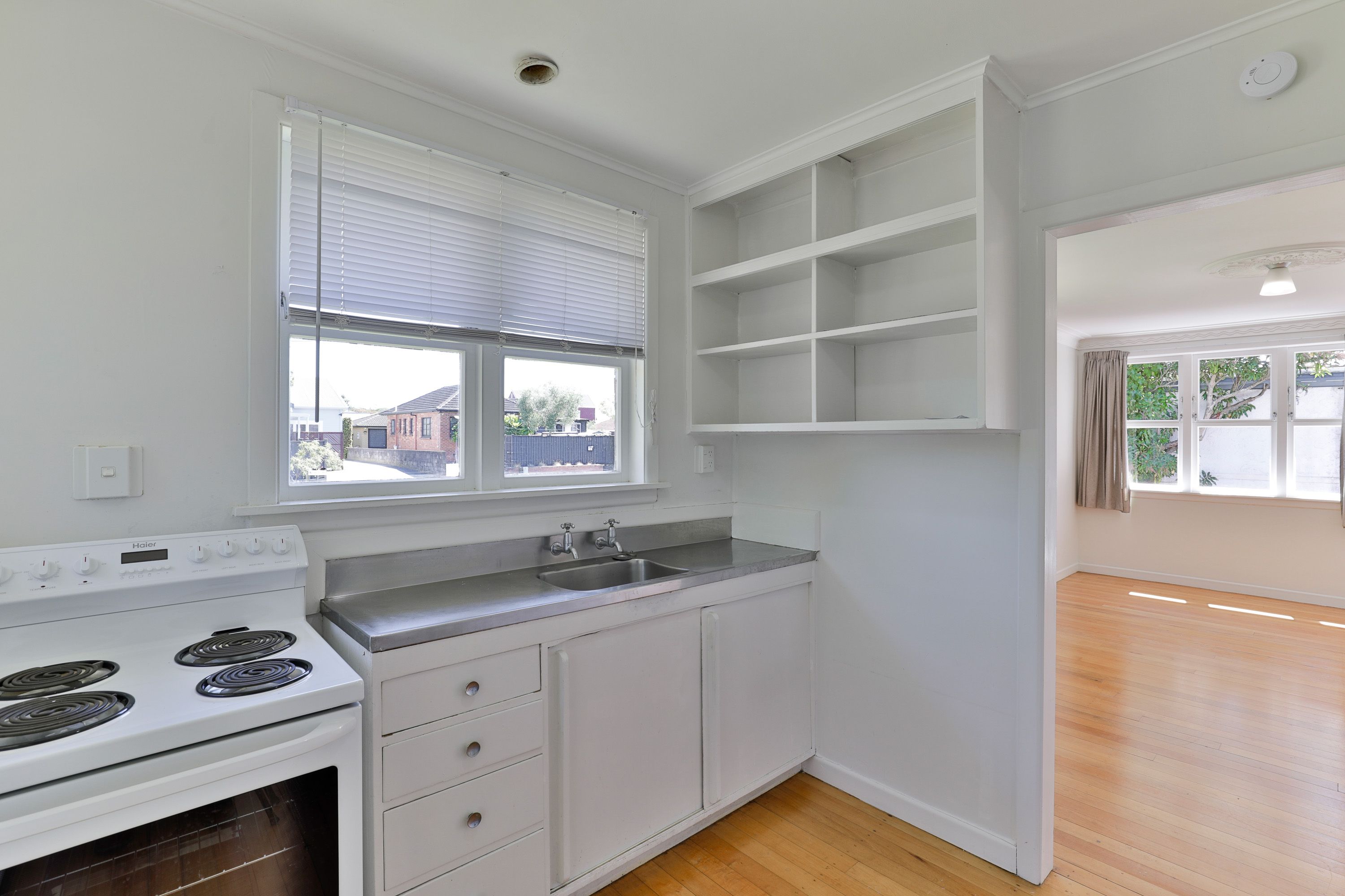 On offer, 1 generous sized double bedroom + 1 large single/study, living with warm polished floors, kitchen with oven and good storage and 1 bathroom including washing machine.