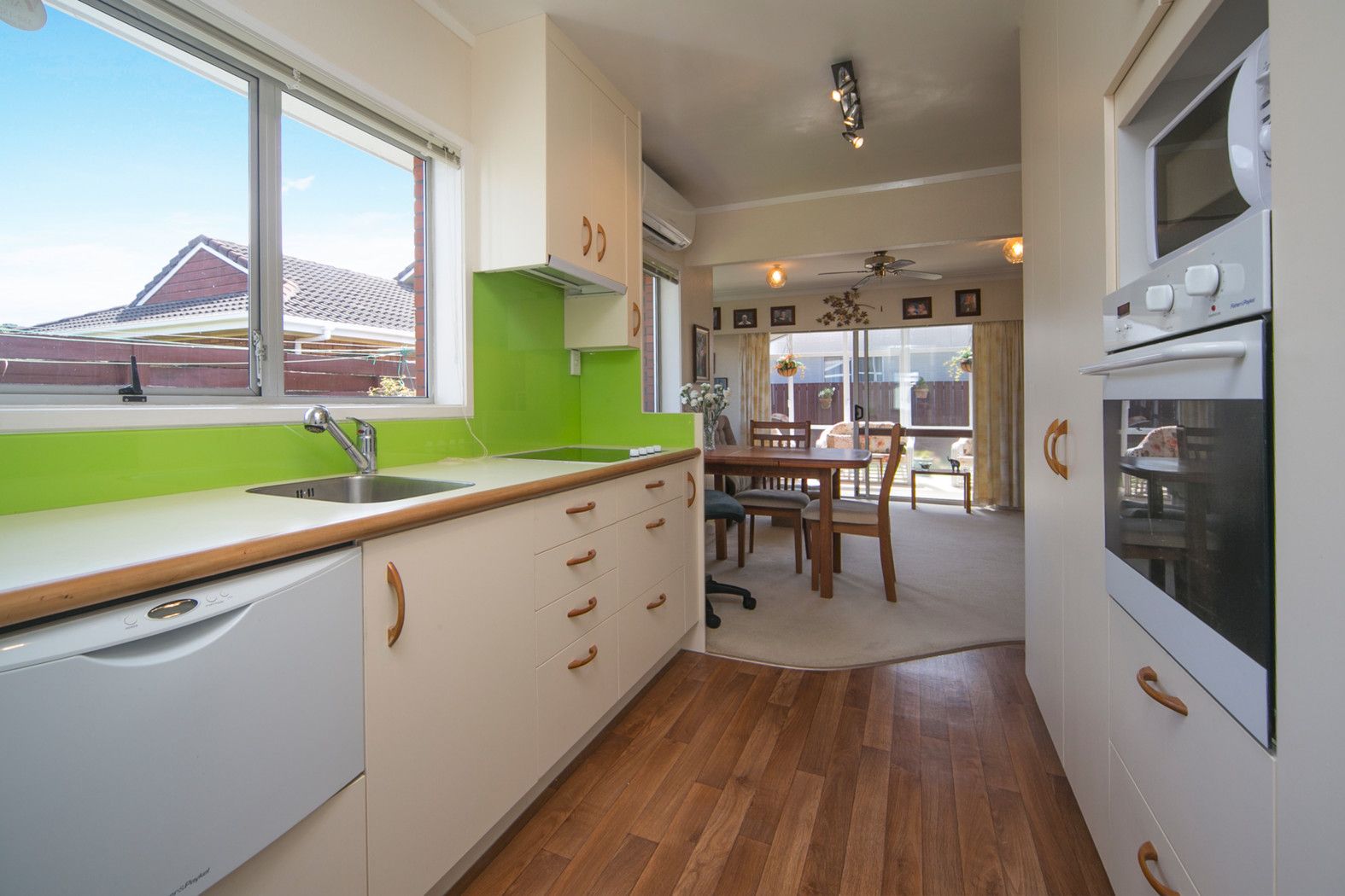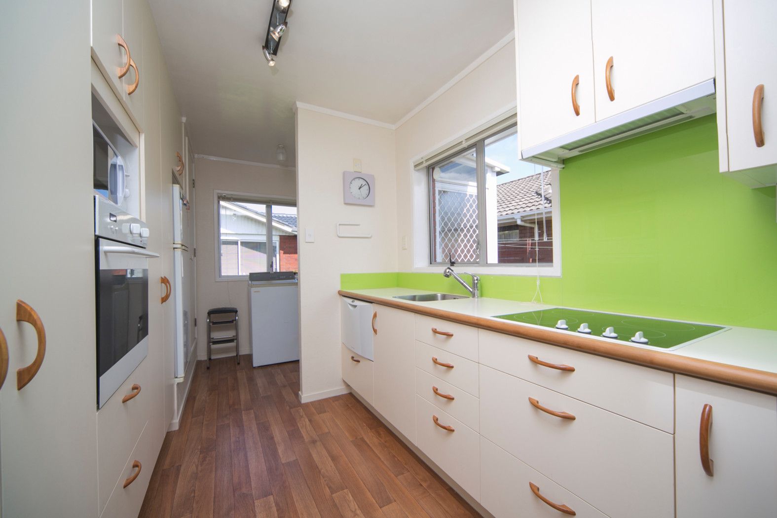 A modern tidy kitchen, with adjoining laundry to back door