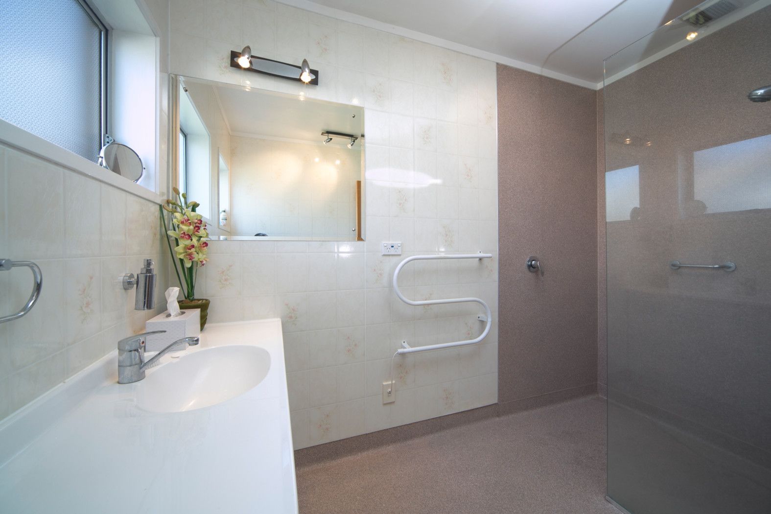 A mobility friendly modern bathroom, with spacious walk-in shower