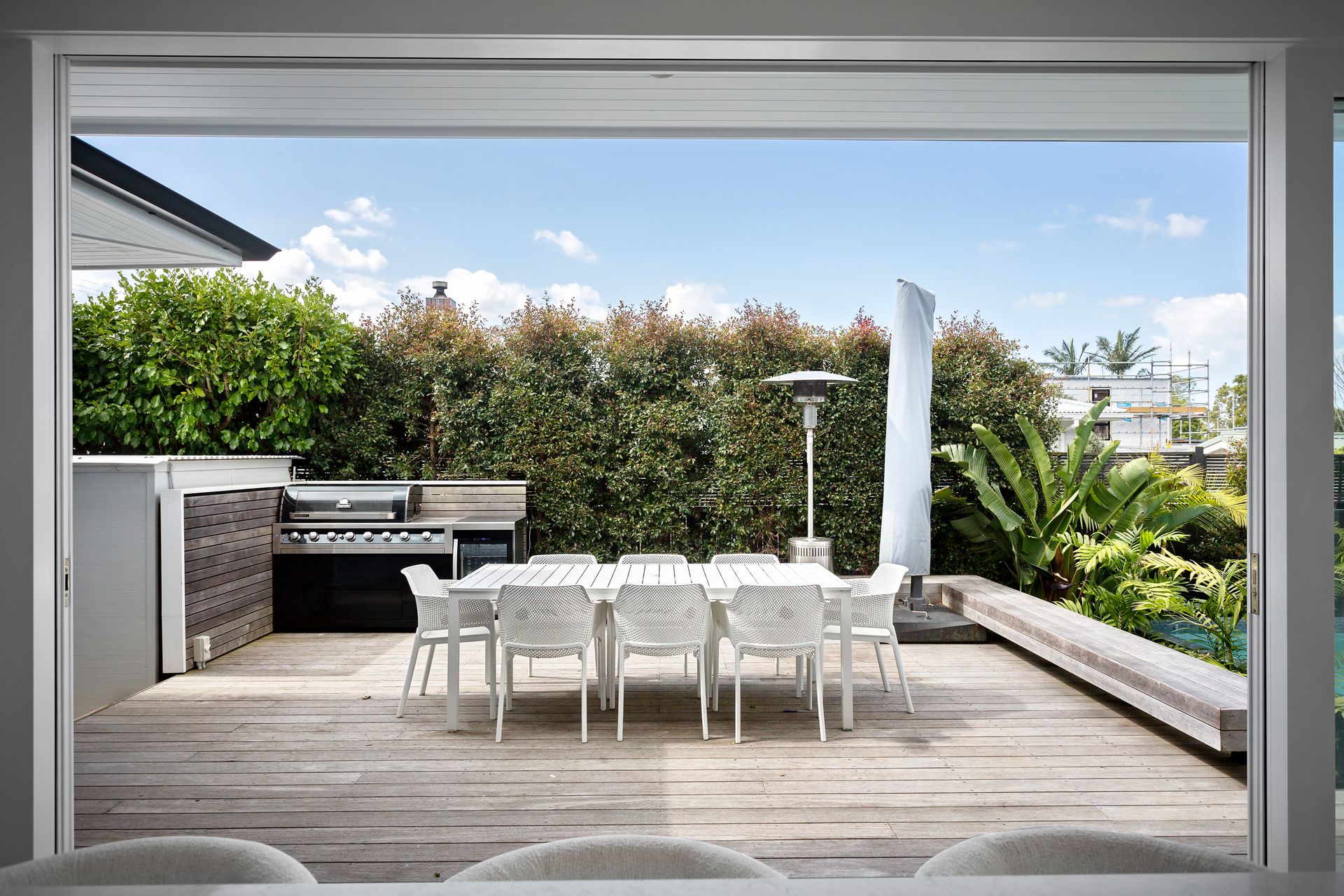 • Outdoor kitchen includes built in BBQ and wine fridge.
