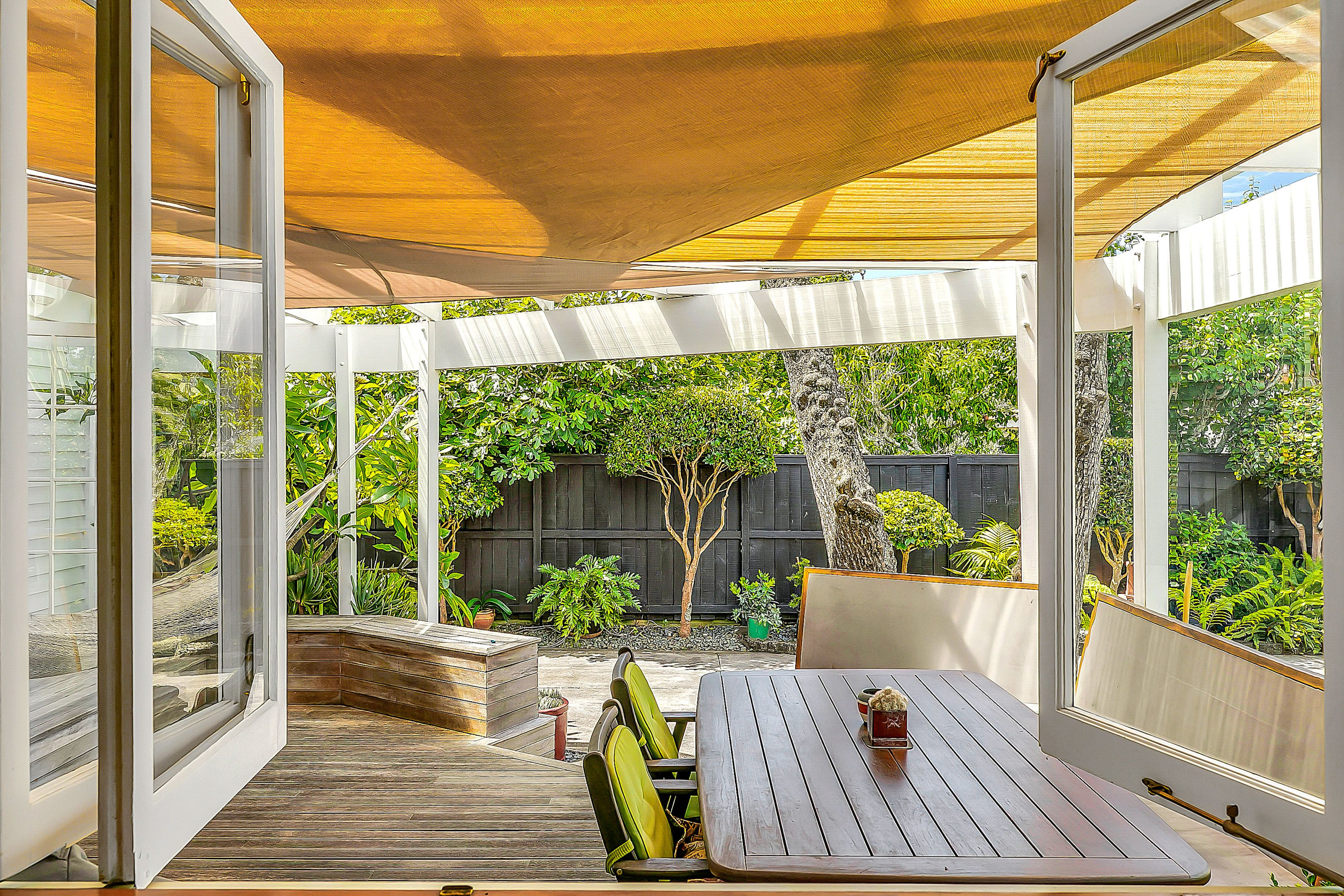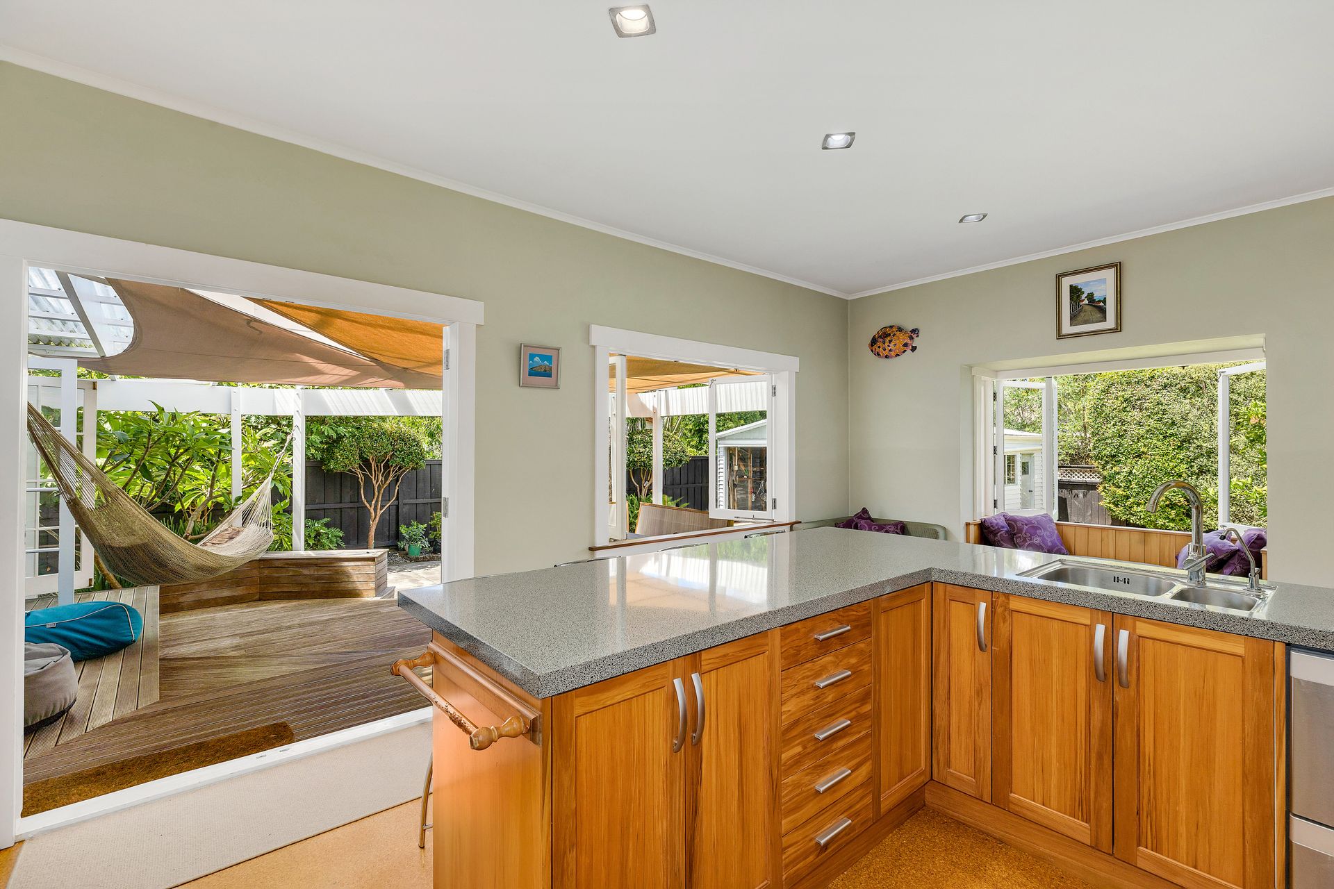 On the lower level are two double bedrooms, a bathroom and the expansive living zone. Anchored by gorgeous polished wood floors, the open plan kitchen, dining and living opens to covered terraced decking for endless summer barbecues while the kids play cricket on the flat lawn.