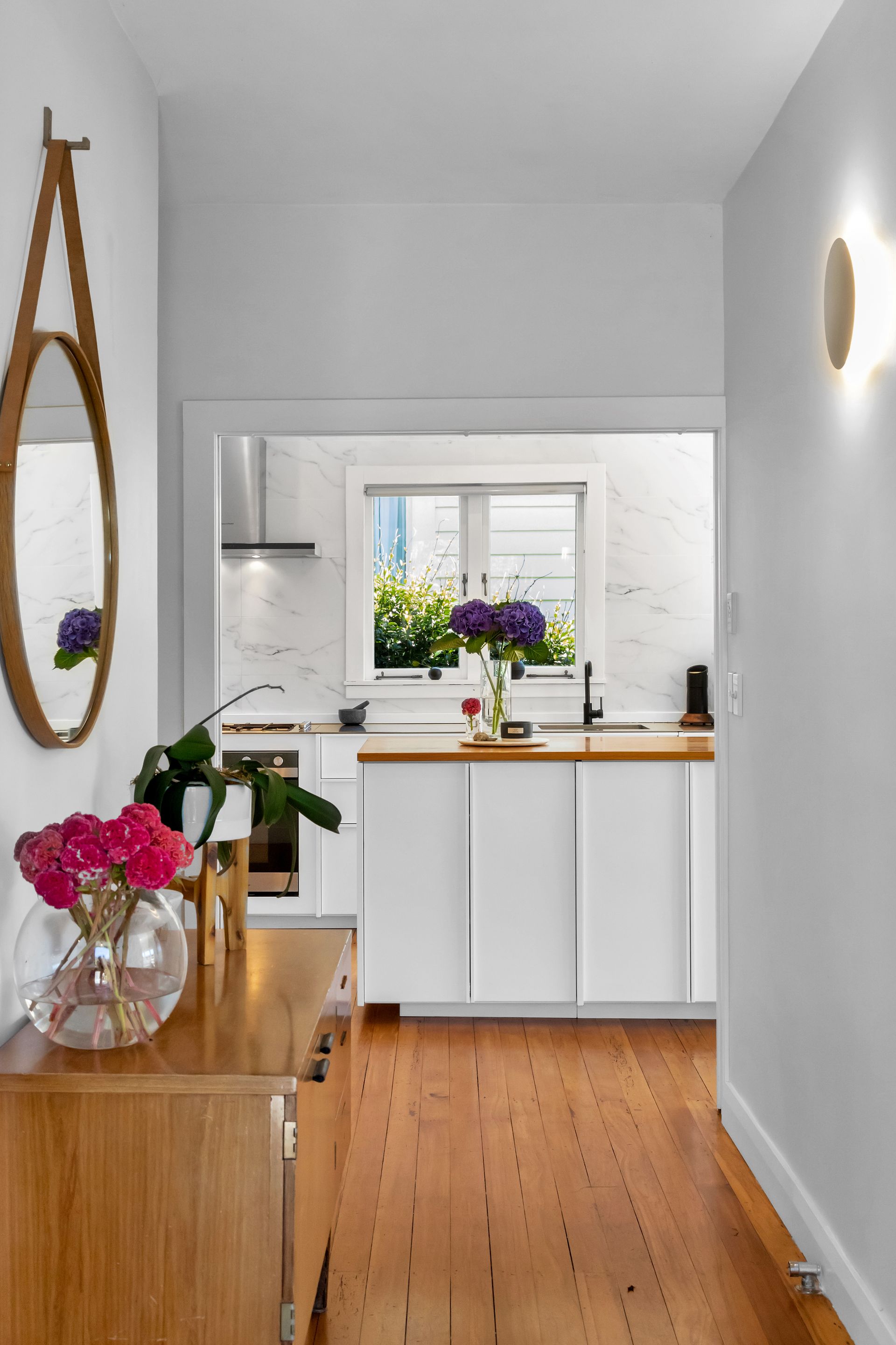 Beautiful native timber floors invite you to step into the sun-soaked open plan living space where crisp white walls sit alongside the standout kitchen with its stunning cabinetry, premium appliances and elongated island for a sit down meal.