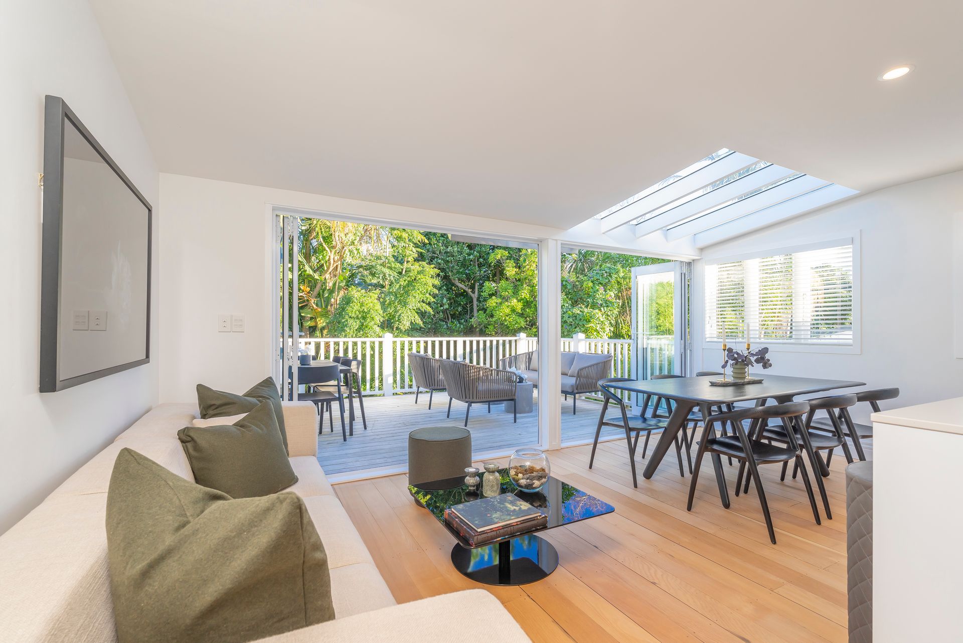 The open plan kitchen, dining and family area offers a seamless flow to the large deck, ideal for summer barbecues or evening drinks as you enjoy the setting sun.